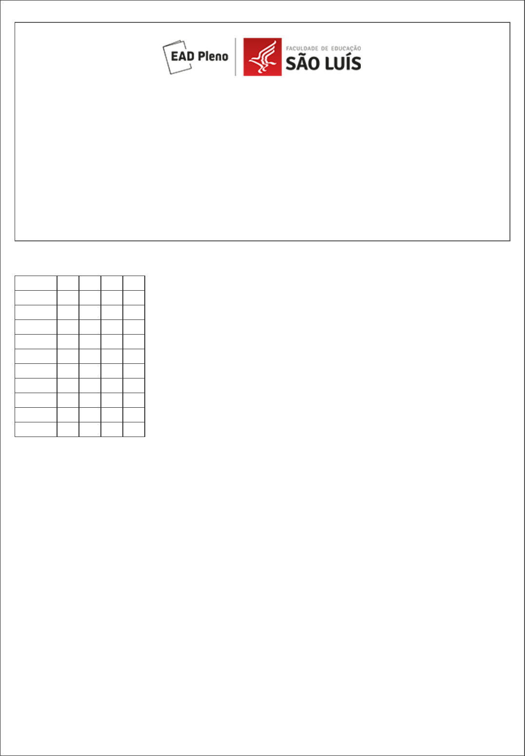Requisição: 2972150 Matricula: 648999 Data: 14/12/2020 17:18 Página: 1/4 Prova regular presencial Curso: 6 MESES - PED - EJA - EDUCAÇÃO DE JOVENS E ADULTOS - SÃO LUÍS Módulo: 2 Grupo: 198 Município: CASCAVEL - PR Disciplina(s): 100066 - DIDÁTICA: ORGANIZAÇÃO DO TRABALHO PEDAGÓGICO Nome: 648999 - MARISTELA NICHETTI Data: ___/___/_________ Assinatura do aluno: ________________________________________________________ Preencha o gabarito abaixo com X na coluna correta. Atente para a coluna de numeração e das alternativas. Questões A B C D 1 2 3 4 5 6 7 8 9 10 1 ) Partindo das diferentes dimensões de desenvolvimento da pessoa, propostas por Zabala, o texto abaixo está relacionado a qual dimensão? "Conhecer-se e compreender a si mesmo, às demais pessoas, à sociedade e ao mundo em que se vive, capacitando o indivíduo para exercer responsável e criticamente a autonomia, a cooperação, a criatividade e a liberdade." A ) Social. B ) Profissional. C ) Interpessoal. D ) Pessoal. 2 ) Na construção de um plano de trabalho devemos levar em consideração os seguintes tópicos: A ) objetivo, metodologia, recursos, dados de identificação e avaliação. B ) dados de identificação, metodologia, recursos e avaliação. C ) objetivo, dados de identificação, metodologia e recursos. D ) dados de identificação, objetivo, metodologia e avaliação. Requisição: 2972150 Matricula: 648999 Data: 14/12/2020 17:18 Página: 2/4 3 ) A prática pedagógica, pensada em uma relação dinâmica, deve ser entendida como o fruto de uma reflexão consciente e madura sobre o binômio ensino-aprendizagem. Assinale a alternativa que demonstra os elementos centrais que precisam ser levados em conta na discussão da prática pedagógica pensada nessa concepção. A ) A organização das disciplinas de forma que os alunos não confundam os conteúdos que serão ministrados no decorrer do ano letivo. B ) A importância do conhecimento do professor e de sua importância na condução do processo de ensino, como sendo ele exclusivamente o sujeito de todo processo educacional. C ) O papel dos alunos no seu desenvolvimento motor e a sua escolha por um determinado curso, enquanto opção profissional. D ) A concepção de homem, de aprendizagem, de cultura e de conhecimento. 4 ) No processo de representação, para os Estudos Culturais, a construção discursiva faz-se necessária. Os discursos, deste modo, são constituídos A ) a partir de inúmeras vozes, porém a voz dos governantes se sobressai às vozes dos oprimidos. B ) a partir das vozes dos governantes, que constroem e produzem um único discurso com vistas a manter uma única visão, calcada em um modo de agir e de pensar sobre o mundo. C ) por nenhum sujeito, na realidade os discursos são reproduzidos pelos sujeitos, apenas, estando presentes há várias décadas. D ) a partir de inúmeras vozes, que concorrem entre si para construir e posicionar os sujeitos, produzindo diferentes efeitos em cada um de nós. 5 ) Sobre a organização do trabalho pedagógico na escola, particularmente aquela que estimula a vivência/prática da pesquisa, julgue os itens que se seguem e assinale o verdadeiro. A ) O planejamento produz melhoria da qualidade do ensino quando é capaz de provocar, junto aos seus professores, a necessidade de treinamento em cursos já testados e abonados em outras instituições. B ) A escola, na organização do seu trabalho pedagógico, somente atinge a qualidade quando inclui, em suas atividades, grupos de consultores especializados, que assumem a elaboração e execução do planejamento da escola. C ) Para a organização do trabalho pedagógico há que se garantir o contínuo estudo do professor, feito de forma articulada com a escola e suas propostas de ação que, por sua vez, visem à aprendizagem dos alunos. D ) É importante que sejam criados critérios quanto à realização de pesquisa, e não sejam feitas pesquisas longas, pois estas tomam muito tempo e dificultam o cumprimento do conteúdo. 6 ) É correto afirmar que a avaliação, em uma premissa mediadora, deve estar vinculada ao A ) plano de ensino do professor, visualizando os conhecimentos que devem ser construídos pelos alunos, apenas. B ) Projeto Político Pedagógico da instituição escolar, não ocorrendo em uma perspectiva de isolamento. Requisição: 2972150 Matricula: 648999 Data: 14/12/2020 17:18 Página: 3/4 C ) planejamento e proposta metodológica do professor, apenas. D ) fazer pedagógico do professor, destituído de relações com o Projeto Político Pedagógico da instituição escolar. 7 ) Um professor, em sua sala de aula, trabalha com projetos de trabalho. Atualmente, desenvolve um trabalho com seus alunos relacionado aos distintos estilos musicais. Ele acredita que trabalhar com essa proposta de planejamento possibilita a ação-reflexão-ação sobre os conteúdos curriculares, bem como possibilita a pesquisa em sala de aula. Desse modo, é correto afirmar que A ) as temáticas dos projetos de trabalho, bem como seu desenvolvimento, são construídas pelos alunos, sendo o professor apenas o facilitador desse processo. Ou seja, não há intervenção do professor nessa proposta de planejamento. B ) os projetos de trabalho possibilitam a concretização e problematização do currículo escolar, através de um modo diferenciado de ensinar e aprender. C ) nos projetos de trabalho, a aprendizagem acontece em situações concretas, de interação, relacionadas, principalmente, ao currículo mínimo escolar, pré-selecionado pelo professor. D ) os projetos de trabalho possibilitam a concretização do currículo escolar, através de um modo padronizado de ensinar e aprender. 8 ) Constitui-se pelos componentes curriculares de livre escolha da escola, a partir da realidade local e regional da sociedade, da economia, da cultura. Esta definição é referente à A ) áreas de conhecimento. B ) Base Nacional Comum. C ) parte diversificada. D ) vida 