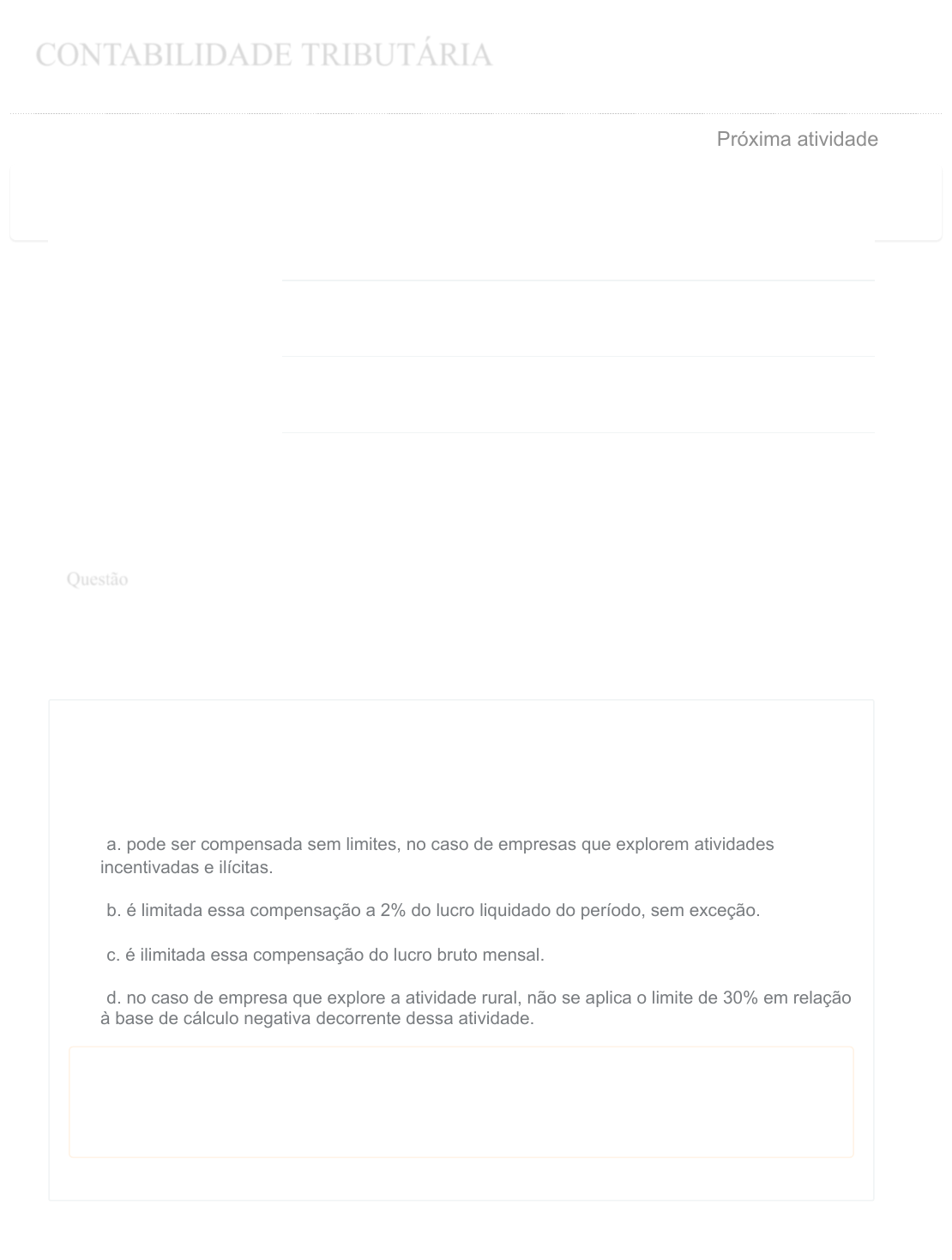 CONTABILIDADE TRIBUTÁRIACONTABILIDADE TRIBUTÁRIA Próxima atividade Iniciado em terça, 15 Dez 2020, 15:20 Estado Finalizada Concluída em terça, 15 Dez 2020, 15:34 Avaliar 7,0 de um máximo de 10,0(70%) QuestãoQuestão 1 Incorreto Em relação à compensação da base negativa da CSLL de períodos anteriores, para pessoas jurídicas sujeitas ao Lucro Real: Escolha uma opção: Sua resposta está incorreta. A resposta correta é: no caso de empresa que explore a atividade rural, não se aplica o limite de 30% em relação à base de cálculo negativa decorrente dessa atividade.. N a. pode ser compensada sem limites, no caso de empresas que explorem atividades incentivadas e ilícitas. b. é limitada essa compensação a 2% do lucro liquidado do período, sem exceção. c. é ilimitada essa compensação do lucro bruto mensal. d. no caso de empresa que explore a atividade rural, não se aplica o limite de 30% em relação à base de cálculo negativa decorrente dessa atividade. https://aula.fael.edu.br/mod/quiz/view.php?id=756&forceview=1 QuestãoQuestão 2 Correto O valor gasto pela empresa arrendatária com as contraprestações do arrendamento mercantil (leasing) de bens utilizados nas suas operações Escolha uma opção: Sua resposta está correta. A resposta correta é: é considerado como uma compra financiada de ativo imobilizado, segundo a lei 6.404/76, caso se caracterize como um leasing financeiro.. S a. é considerado como uma compra financiada de ativo imobilizado, segundo a lei 6.404/76, caso se caracterize como um leasing financeiro. b. é considerado como lucro presumido para a contabilidade da empresa. c. não são custos ou despesas dedutíveis do IRPJ, da CSLL e do IPI. d. é considerado como um investimento, segundo o RIR/99. QuestãoQuestão 3 Correto Qual das alternativas a seguir contém apenas pessoas jurídicas que exploram atividades obrigatoriamente sujeitas ao Lucro Real, independentemente do valor da receita bruta anual? Escolha uma opção: Sua resposta está correta. A resposta correta é: Empresas de arrendamento mercantil, cooperativas de crédito e empresas de factoring.. a. Bancos de investimentos, empresas de radiodifusão e caixas econômicas. S b. Empresas de arrendamento mercantil, cooperativas de crédito e empresas de factoring. c. Bancos de desenvolvimento, empresas de seguros privados e empresas de transporte aéreo de passageiros. d. Bancos comerciais, indústrias de cigarros e entidades de previdência privada aberta. QuestãoQuestão 4 Incorreto Com relação aos Juros sobre o Capital Próprio (JCP), é correto afirmar que Escolha uma opção: Sua resposta está incorreta. A resposta correta é: é sempre tributado exclusivamente na fonte quando o beneficiário é pessoa física.. QuestãoQuestão 5 Correto Assumindo que todos os textos normativos abaixo tratam de matéria contábil, qual das alternativas contém apenas Normas Contábeis Legais (NCL)? Escolha uma opção: Sua resposta está correta. A resposta correta é: Resolução da CVM, Resolução do Bacen, Decreto 3.000/99.. Na. é sempre vantajoso sob o ponto de vista do planejamento tributário. b. é sempre tributado exclusivamente na fonte quando o beneficiário é pessoa física. c. é sempre uma despesa dedutível. d. não é tributado quando o beneficiário é pessoa jurídica. Sa. Resolução da CVM, Resolução do Bacen, Decreto 3.000/99. b. Resolução do Bacen, Resolução da Anel , Pronunciamento do IBRACON. c. Pronunciamento do IASB, Decreto-Lei 1.598/77 e Lei 6.404/76. d. Lei 6.404/76, Resolução da CVM, Resolução do CFC. QuestãoQuestão 6 Correto Com relação à alíquota do ISSQN, é correto afirmar que Escolha uma opção: Sua resposta está correta. A resposta correta é: não pode ser superior a 5%, em hipótese alguma.. a. não está sujeita a limite máximo. b. não está sujeita a limite mínimo. Sc. não pode ser superior a 5%, em hipótese alguma. d. não pode ser inferior a 1,35%, em hipótese alguma. QuestãoQuestão 7 Correto Com relação ao planejamento tributário dito interno, é correto afirmar que Escolha uma opção: Sua resposta está correta. A resposta correta é: envolve medidas que não dependem de qualquer providência judicial ou administrativa.. a. é aquele que não envolve questões estratégicas. b. é aquele estruturado com base em ações ajuizadas contra o fisco, usualmente buscando ver afastada a incidência de determinado tributo ou a restituição de tributo já recolhido. c. envolve medidas junto à administração tributária, tais como consultas, recursos, requerimentos de ressarcimentos e solicitações de regimes especiais de tributação. S d. envolve medidas que não dependem de qualquer providência judicial ou administrativa. QuestãoQuestão 8 Correto Determinadas sociedades de profissionais estão sujeitas ao ISSQN calculado em relação a cada profissional habilitado, sócio, empregado ou não, que preste serviço em nome da sociedade, embora assumindo a responsabilidade profissional. Assinale a alternativa que contém apenas serviços ou profissões que estão sujeitos a essa modalidade de apuração do ISSQN. Escolha uma opção: Sua resposta está correta. A resposta correta é: Advogados, dentistas e psicólogos.. a. Contadores, arquitetos e corretores de seguros. b. Médicos veterinários, analistas de sistemas e advogados. Sc. Advogados, dentistas e psicólogos. d. Médicos, enfermeiros e massagistas. QuestãoQuestão 9 Correto Assinale a alternativa correta. Com relação ao Simples Nacional, é correto afirmar que Escolha uma opção: Sua resposta está correta. A resposta correta é: não incluirá o IPI devido na importação de insumos, no caso de uma empresa optante que fabrique produtos.. S a. não incluirá o IPI devido na importação de insumos, no caso de uma empresa optante que fabrique produtos. b. podem optar as empresas de pequeno porte com lucro líquido anual de até R$4 milhões. c. a empresa