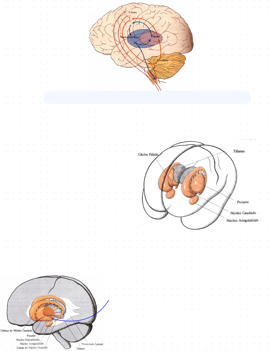 A partir de regiões superiores (cortéx), circuitos locais (motoneuronios), eram ativados e a partir dai existE o movimento. Além disso, o cerebelo que não se dirige diretamente a circuitaria local (medula espinal ou tronco encefálico). Assim, de forma semelhante, sao os Núcleos da Base. Eles recebem aferencias de regiões especificas, as informações são processadas e a partir dai ele é enviada de volta para alguma região, podendo ser cortical, e então é iniciado o movimento. O tálamo (em cinza), apesar de não fazer parte dos núcleos da base, participa do controle do movimento, pois envia projeções para o córtex. Em laranja, de forma circular, tem-se o núcleo caudado e ligado a ele, através dessas radiações, tem o puntame, que juntos formam o corpo estriado. Estriado porque contem estrias, que nada mais são que feixes de axônios provenientes das regiões que trazem as informações para os núcleos da base, na maioria delas regiões corticais. Nas sessões intermediarias , entre caudado, puntame e tálamo, tem um componente que é dividido em dois, o Globo Pálido, interno e externo. Em uma sessão mais interna, abaixo do tálamo, tem o núcleo subtalamico. Não se projetam diretamente aos circuitos locais (motoneuronios) da medula espinhal Núcleos da Base - estrutura • Telencéfalo: - Núcleo caudado - Puntâmen - Globo pálido - Núcleo accumbens • Diencéfalo: - Núcleo subtalamico •Mesencéfalo: - Substância Negra a Corte coronal A partir do restante de todo o córtex, terão projeções chegando até o estriado (caudado + puntame). O caudado, recebe projeções principalmente dos córtex associativos, encontradas tanto nas regiões motoras quanto nas sensitivas e também das áreas motoras presentes no lobo frontal que controla principalmente o movimento dos olhos. O puntamen, recebe outras projeções, recebem aferencias dos córtex tanto visuais secundários (lobo occipital e temporal) quanto córtex motor primário (pré motor) e também das áreas associativas do lobo temporal e córtex sensitivo primário Esquema das conexões funcionais dos núcleos da base e como podem influenciar a atividade motora: A partir das regiões corticais e telencefálicas (que se comunicam), sao enviadas informações para porta de entrada, os núcleos da base, primeiramente, para o corpo estriado (caudado e puntamen). O principal alvo dessas conexões a partir do córtex sao os neuronios espinhosos médios, presentes no caudado e puntamen. A partir daí, existem projeções para o globo pálido e para substância negra, que sao enviadas novamente para o tálamo (regiões de controle de movimento do corpo) ou para as regiões do tronco encefálico (envolvidas com o controle motor dos olhos) Globo pálido ( principalmente a porção interna) e substancia negra( principalmente a parte reticulada) sao as principais portas de saída das informações provenientes dos núcleos da base. A partir dessas projeções provenientes dos núcleos da base, o tálamo envia projeções para o córtex, que vai modular os motoneuronios inferiores (presentes tanto no tronco encefálico quanto na medula espinhal) e a partir daí tem-se as projeções eferentes para os músculos, para que possam ocorrer os movimentos (principalmente quando falamos em iniciação do movimento e quando pensamos em cessar, parar o movimento) Tanto o inicio quanto o termino do movimento estão associados a funções dos núcleos da base. O córtex é a principal aferencia dos nucleos da base Das areas do neocórtex, quase todas se projetam para os Núcleos da Base, exceto o Cortex auditivo Primário e o Visual Primário Principais conexões funcionais dos núcleos basais e como podem influenciar na atividade motora (via córtico-estriatal) ad Projeções inibitórias ( gdraúgicasl Quando algumas patologias afetam os núcleos da base, podem levar a doenças chamadas de hipercinéticas (onde existem movimentos indesejáveis) ou doenças hipocinéticas (onde tem a diminuição do movimento. Essas células (neurônios espinhosos médios) fazem projeções — a partir do putamen para o globo pálido e a partir do caudado para a substância negra parte reticulada — inibitórias, isto é, células gabaérgicas, secretam no seu terminal axônico o neuro transmissor GABA. O potencial de repouso de membrana das células estriadas, fica em torno de 80mV. Para que essas células possam despolarizar e ter sua atividade, ela precisa atingir seu limiar de estabilidade que fica em torno de -50mV, assim, é necessário uma descarga glutamatérgica muito grande para que posso despolarizar e atingir seu limiar de estabilidade. Uma vez atingido o limiar de estabilidade, tem os potenciais de ação dessas celulares, isto é, a atividade dessas células. Porque os neurônios espinhosos médios sao células inibitórias? Seria para que a região do globo pálido e da subs. Negra não prossiga nas aferencias? Projeções inibitórias gabaérgicas inibem a atividade dos respectivos núcleos onde vão fazer sinapse. As informações que chegam aos neurônios espinhosos médios são glutamatérgicas, isto é, excitatórias. Neurônios espinhosos médios apresentam projeçõesconvergentes limitadas ao Globo Pálido e Subs. Negra Reticulada Porta de entrada dos Núcleos da Base Aferências convergentes de neurônios corticais, células dopaminérgicas da Subs. Negra Compacta e neurônios do circuito local; e tálamo Potencial de membrana dos neurônios Espinhosos Médios Em resposta ao impulso glutamatérgico forte, o neurônio médio despolariza a um potencial de membrana ao redor de -55mV, próximo ao limiar chamado ‘’up state’’. Na ausência de impulsos convergentes glutamatérgicos corticais o seu potencial de repouso fica em torno do potencial de equilíbrio do potássio (~-85mV) - chamado ‘’down state’’. < Prisioneiro YY.jo; Éü÷ Inimiga IMANTADAELE ta córtex -