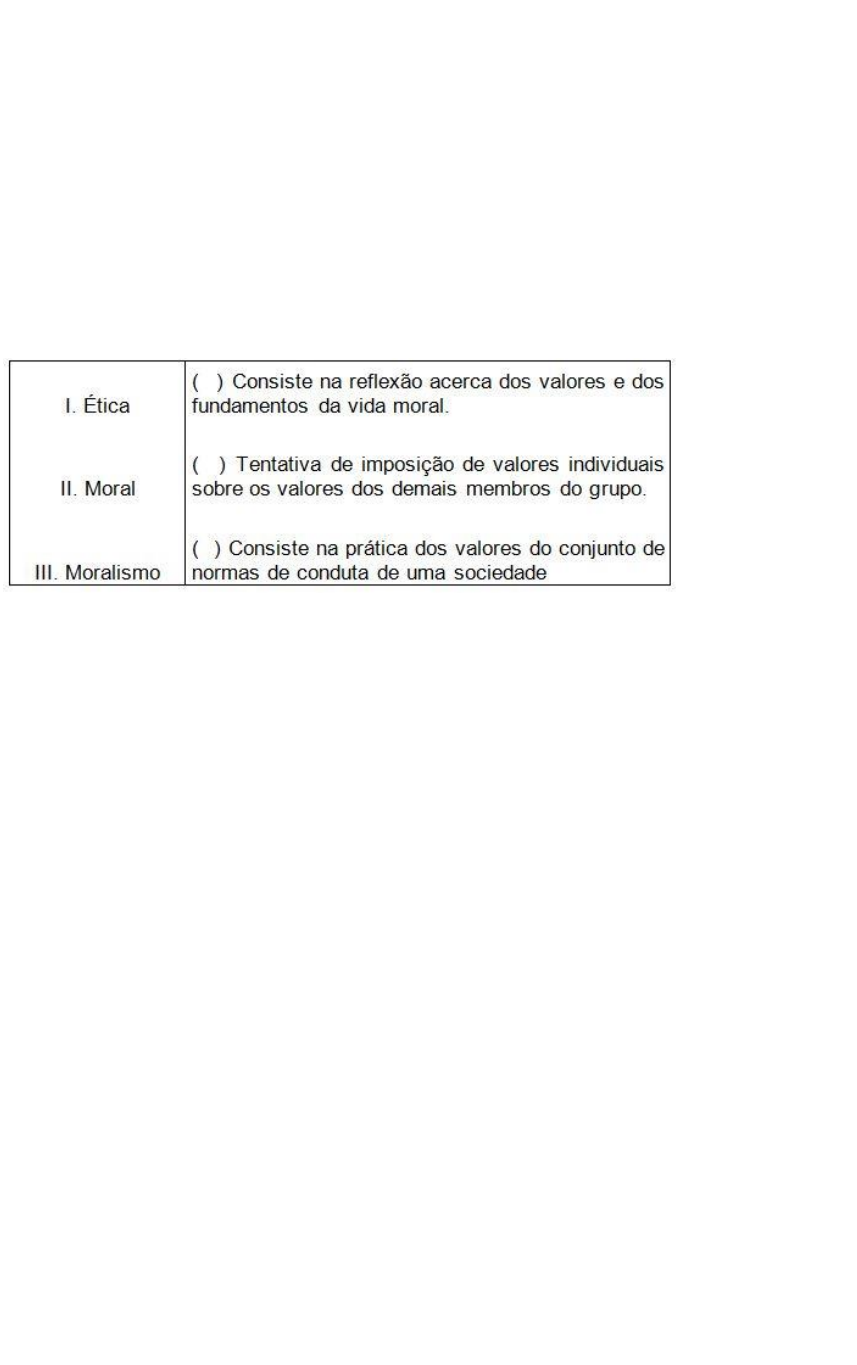 PROVA DE FILOSOFIA DA EDUCAÇÃO QUESTÃO 1 Tendo como base as ideias de Aristóteles, a ética deve a ) estabelecer que o educando deve obedecer aos professores. b ) enfatizar que a educação vem das ações do professor. c ) estabelecer o princípio da ação virtuosa. d ) preparar o indivíduo para relacionar-se com colegas. QUESTÃO 2 Assinale a segunda coluna de acordo com a primeira. Assinale a alternativa que corresponde à sequência correta. a )I, III, II. b ) I, II, III. c ) II, I, III. d ) III, II, I. QUESTÃO 3 Com base na concepção de "mundo das ideias", de Platão, podemos afirmar que I. os conceitos e ideias da Filosofia são fruto da imaginação humana. II. as formas e modelos espirituais são cópias do mundo das ideias. III. os conceitos ou ideias que temos em nossa malha intelectiva são eternos e imutáveis. De acordo com as afirmativas acima, assinale a alternativa correta. a ) A afirmativa II está correta. b )A afirmativa I está correta. c ) A afirmativa III está correta. d ) As afirmativas I, II e III estão corretas. QUESTÃO 4 Em uma analogia entre o mito da caverna de Platão e as escolas atuais, o homem que se liberta da caverna é como o aluno que a )provoca desordem quando não gosta de determinada tarefa. b )em certo momento decide abandonar a escola. c ) questiona o porquê das ações pedagógicas propostas. d ) se acomoda e aceita todas as propostas pedagógicas. QUESTÃO 5 Característica das coisas que são preferidas, mais ou menos desejadas, julgadas superiores, desejáveis etc. Essa é uma definição do conceito de a )moral. b )ética. c ) valor. d )moralismo. QUESTÃO 6 A Filosofia permite questionar sobre o que significa ser educador e educar. Em relação a isso, leia as afirmativas abaixo. I. Educar é impedir que as pessoas caminhem sozinhas. II. Educar é conduzir de um estado a outro. III. Educar é ensinar tudo para o educando. De acordo com as afirmativas acima, assinale a alternativa correta. a ) As afirmativas I e II estão corretas. b )A afirmativa II está correta. c )As afirmativas II e III estão corretas. d )A afirmativa I está correta. QUESTÃO 7 A lógica formal desenvolvida por Aristóteles nos permite compreender o caminho da elaboração do raciocínio. Assinale a alternativa que apresenta uma combinação entre os termos que nos possibilite uma dedução lógica. I. Todos os homens são bons. Maria é pianista. Logo, Maria toca bem. II. Todos os homens são mortais. João é homem. Logo, João é mortal. III. Todas as crianças têm condições de aprender. João não aprende. Logo, João é criança. De acordo com as afirmativas acima, assinale a alternativa correta. a )As afirmativas I e III estão corretas. b ) A afirmativa III está correta. c ) A afirmativa I está correta. d ) A afirmativa II está correta. QUESTÃO 8 Entre as características do Renascimento Cultural, podemos destacar a ) geocentrismo e teocentrismo. b ) racionalismo e antropocentrismo. c ) geocentrismo e antropocentrismo. d )misticismo e racionalismo.