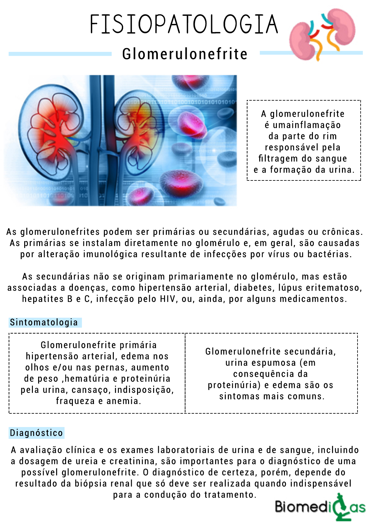FISIOPATOLOGIA Glomerulonefrite A glomerulonefrite é umainflamação da parte do rim responsável pela filtragem do sangue e a formação da urina. As glomerulonefrites podem ser primárias ou secundárias, agudas ou crônicas. As primárias se instalam diretamente no glomérulo e, em geral, são causadas por alteração imunológica resultante de infecções por vírus ou bactérias. As secundárias não se originam primariamente no glomérulo, mas estão associadas a doenças, como hipertensão arterial, diabetes, lúpus eritematoso, hepatites B e C, infecção pelo HIV, ou, ainda, por alguns medicamentos. Sintomatologia Glomerulonefrite primária hipertensão arterial, edema nos olhos e/ou nas pernas, aumento de peso ,hematúria e proteinúria pela urina, cansaço, indisposição, fraqueza e anemia. Glomerulonefrite secundária, urina espumosa (em consequência da proteinúria) e edema são os sintomas mais comuns. Diagnóstico A avaliação clínica e os exames laboratoriais de urina e de sangue, incluindo a dosagem de ureia e creatinina, são importantes para o diagnóstico de uma possível glomerulonefrite. O diagnóstico de certeza, porém, depende do resultado da biópsia renal que só deve ser realizada quando indispensável para a condução do tratamento.