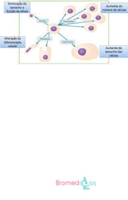 Fisiopatologia Adaptações celulares - O que é adaptação celular? Capacidade da célula de se adaptar a alterações no seu meio ambiente e sobreviver em condições adversas. - Quais são as adaptações celulares? - Atrofia - Hipertrofia - Hiperplasia - Metaplasia - Displasia * Atrofia Ocorre uma redução do tamanho e função celular para que a célula minimize o consumo de energia e nutrientes. Ex: desuso, isquemia, envelhecimento. * Hipertrofia Aumento do tamanho da célula e da capacidade funcional devido ao aumento da demanda funcional. Ex: Dilatação do útero na gravidez. * Hiperplasia Ocorre em células com capacidade de divisão mitótica, o número de células aumentam devido ao aumento da demanda. Acontece simultaneamente ao processo de hipertrofia. Ex: proliferação do epitélio glandular da mama na puberdade ou durante a gravidez. * Metaplasia É quando ocorre a substituição de um tecido por outro devido a uma irritação crônica. Ex: nos fumantes, a substituição do epitélio pseudoestratificado cilíndrico ciliado da mucosa brônquica por epitélio estratificado escamoso (metaplasia escamosa). * Displasia É quando ocorre um crescimento desordenado das células e elas ficam com diferentes tamanhos, formas e arranjos. Ex: células da mucosa intestinal.