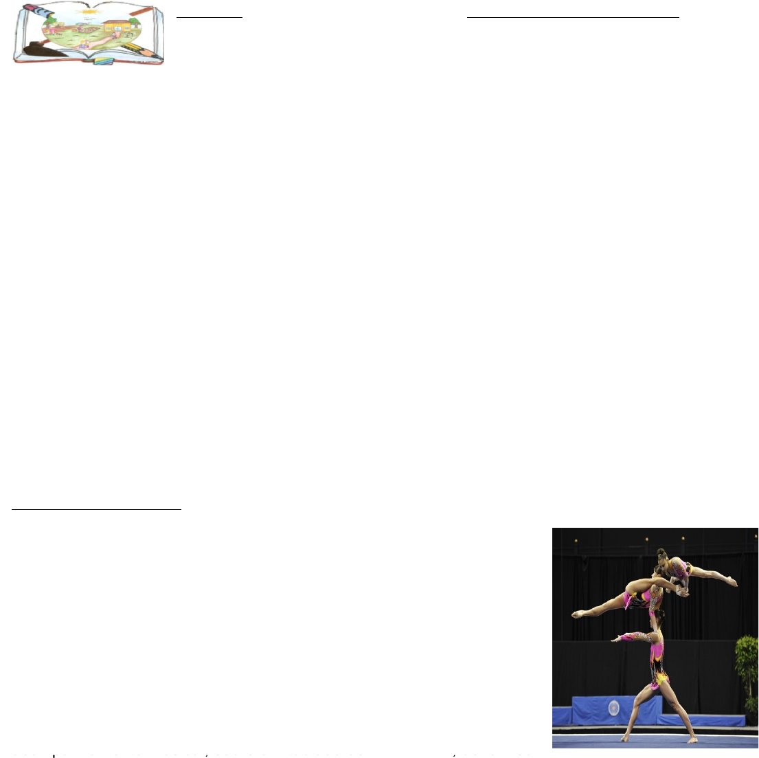 ECORM – REGIÃO CÓRREGO SECO Valorizando a vida no campo EDUCADOR (A): Diego José Carloni DISCIPLINA: Educação Física EDUCANDO (A): HABILIDADES/COMPETÊNCIAS: - Experimentar e fruir combinações dos diferentes elementos da ginástica acrobática, identificando as exigências corporais e reconhecendo a importância de uma prática individualizada, adequada às características e necessidades de cada sujeito. (EF89EF07) - Planejar e utilizar estratégias para resolver desafios na execução de elementos básicos de apresentações coletivas da ginástica acrobática, reconhecendo as potencialidades e os limites do corpo e adotando procedimentos de segurança. (EF35EF08) Data de entrega: 14/12/2020 Devolutiva: Início do ano letivo 2021. 9º ANO – RAIZES DA SABEDORIA ATIVIDADES PEDAGÓGICAS NÃO PRESENCIAIS Ginástica Acrobática: Segundo alguns autores a Ginástica Acrobática teve origem nas artes circenses, no entanto existem pinturas ilustrativas na arte egípcia que remontam ao ano 2300 a.c. Podemos recuar também às civilizações antigas, como Grécia e a China, onde os povos se dedicavam a atividades similares entre elas a construção de pirâmides humanas com os mais variados fins sejam eles lúdicos ou militares. Mais recentemente, na Idade Média, as atividade circenses tinham o seu ponto alto nas festas populares, onde grupos de acrobatas e saltimbancos tinham um grande destaque, tornando-se cada vez mais profissionais. A Ginástica Acrobática teve o seu primeiro quadro competitivo formal em 1934, quando se realizou a primeira competição na antiga URSS. Características A Ginástica Acrobática é uma disciplina que requer dos seus praticantes coragem, força, coordenação e flexibilidade. Os exercícios de Ginástica Acrobática são executados com acompanhamento musical, sobre um tablado de 12m x 12m, devem ser perfeitamente sincronizados com a música e exige-se dos ginastas uma expressão corporal e facial harmoniosa. A Ginástica Acrobática é praticada em pares e grupos, formados por ginastas com diferentes idades e estaturas, aos quais damos duas denominações: bases e volantes. Os bases normalmente são os elementos mais velhos do par ou do grupo com um estatura mais alta, normalmente mais fortes para facilmente sustentarem e apoiarem o volante. O volante é o outro elemento do par ou grupo normalmente mais novo, com uma estrutura física mais baixa e mais leve para poder facilitar o trabalho em conjunto, permitindo também uma maior longevidade da participação desportiva. Existem 5 categorias na Ginástica Acrobática: Duplas femininas: constituídas por duas ginastas do sexo feminino, sendo uma base e uma volante; Duplas mistas: constituídas por um ginasta base do sexo masculino e uma volante do sexo feminino; Duplas masculinas: constituídas por dois ginastas do sexo masculino, sendo um base e o outro volante; Trios: constituídos por três ginastas do sexo feminino, sendo duas bases, e uma volante; Quartetos: constituídos por quatro ginastas do sexo masculino, sendo três bases e um volante. Os ginastas podem realizar 3 tipos de exercícios: de equilíbrio, dinâmicos e combinados, cada um deles com características diferentes: – nos exercícios de equilíbrio os ginastas realizam elementos técnicos de equilíbrio como o próprio nome diz e têm que permanecer durante 3 segundos em cada elemento, podendo realizar movimentações e ligações entre um elemento e o outro como forma de enriquecer o exercício; – nos exercícios dinâmicos os ginastas realizam elementos com fase de voo, vulgarmente chamados de saltos mortais, que podem ser combinados com piruetas e podem ser interligados entre si; – nos exercícios combinados os ginastas realizam elementos que agrupam as características dos exercícios de equilíbrio e dinâmicos. Fonte: https://www.akrosdf.com.br/ginastica-acrobatica/ Veja um breve vídeo sobre o surgimento da Ginástica acrobática e suas características: https://www.youtube.com/watch?v=mfROXhcpXnU Veja como praticar a ginástica acrobática em casa: https://www.youtube.com/watch?v=bBCvOpFMt7c Atividades 1. Quando e onde a ginástica acrobática teve o seu primeiro quadro competitivo formal? a) 1834, na antiga arte circense b) 1934, na antiga Grécia c) 1934, na antiga URSS d) 1974, na antiga China 2. Qual a denominação que é praticada em pares e grupos, onde é formada por ginastas com diferentes idades e estaturas? a) Duplas masculinas e femininas b) Trios e quartetos c) Bases e quartetos d) Volantes e bases 3. Relacione as colunas abaixo: (1) Dinâmico (2) Combinado (3) Equilíbrio ( ) permanência durante 3 segundos em cada elemento ( ) realizam elementos com fase de voo ( ) realizam elementos que agrupam ambos os exercícios