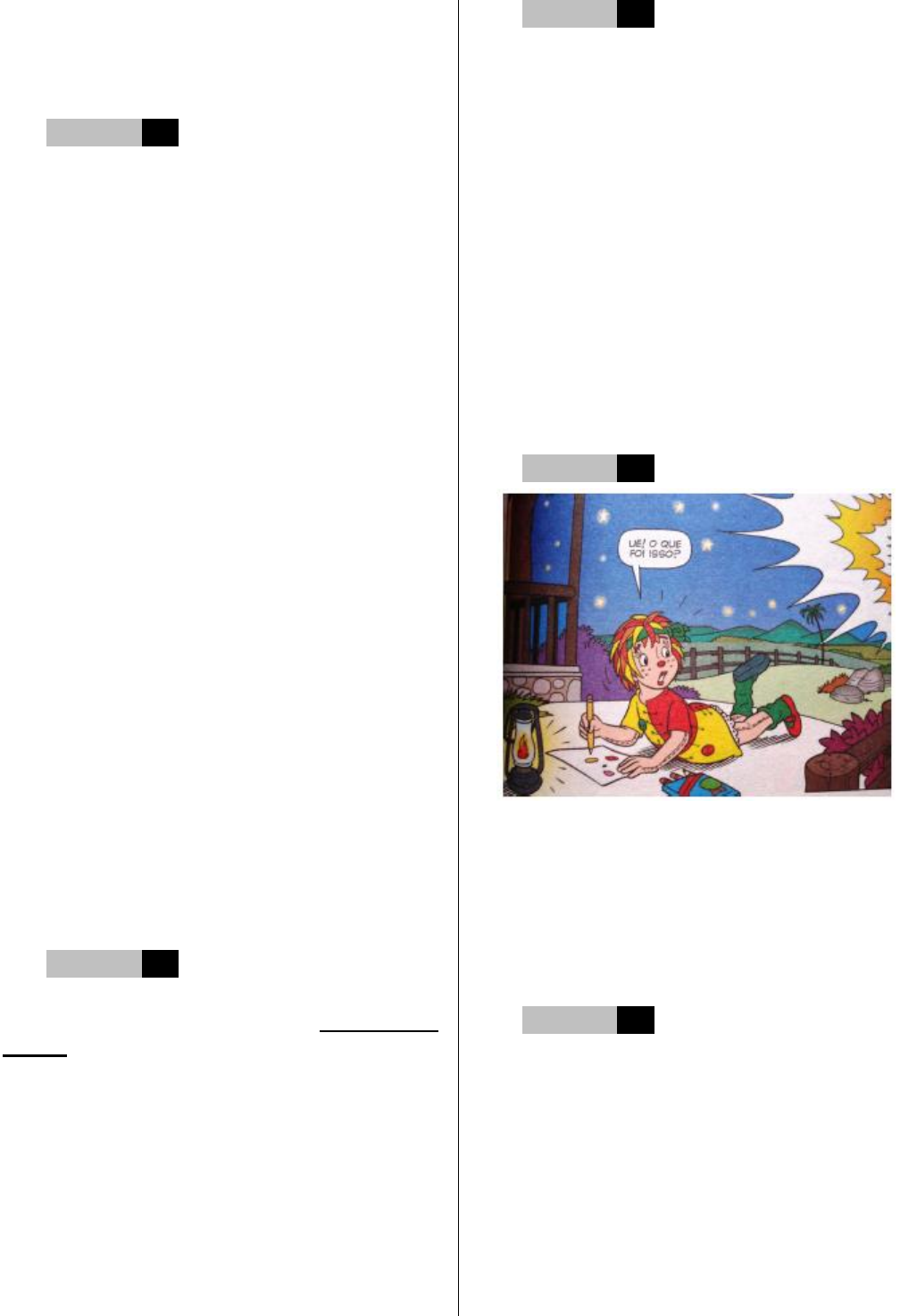 Atividade 3 Português H4 Questão 01 ––––––––––––––––––––––––– Potyra (As lágrimas eternas) A linda e meiga Potyra amava o jovem e valente chefe da tribo, o guerreiro Itajibá, o braço de pedra. Ambos encontravam-se, frequentemente, nas areias brancas do rio, onde permaneciam durante horas admirando a natureza e trocando juras de amor, enquanto aguardavam o casamento. Certo dia, veio a guerra. A tribo foi atacada por inimigos, partindo Itajibá para a luta. Ansiosa, Potyra esperava sua volta caminhando às margens do rio. Muito tempo depois, os guerreiros regressaram informando à jovem que o chefe guerreiro havia morrido. Inconsolável, Potyra voltava todos os dias à praia a chorar sua grande perda. Sensibilizado com sua dor, Tupã, o Deus do Bem, transformou suas lágrimas em diamantes. Desta maneira, as águas levavam as preciosas pedrinhas até a sepultura do guerreiro como prova do seu eterno amor. ANDRADE E SILVA, Walde-Mar de. Lendas e Mitos dos Índios Brasileiros. São Paulo: FTD, 1999 Potyra esperava a volta do guerreiro Itajibá (A) procurando diamantes. (B) admirando a natureza. (C) trocando juras de amor. (D) caminhando às margens do rio. H5 Questão 02 ––––––––––––––––––––––––– No trecho: “Inconsolável, Potyra voltava todos os dias à praia a chorar sua grande perda.”, a expressão em destaque significa chorar (A) o desencontro dos guerreiros. (B) as dificuldades da vida. (C) a morte de seu amor. (D) as tristezas da guerra. H6 Questão 03 ––––––––––––––––––––––––– A galinha dos ovos de ouro Um homem tinha uma galinha que punha ovos de ouro. Achando que por dentro ela era só ouro, matou-a, mas não encontrou nada de diferente das outras galinhas. Assim, em vez de descobrir o enorme tesouro que esperava, perdeu até o pequeno lucro que ela lhe dava. ESOPO, 550ª.C. Fábulas de Esopo.porto Alegre: L&PM,2009. A fábula “A galinha dos ovos de ouro” ensina ao leitor que (A) não se deve ser curioso. (B) não se deve acreditar nas pessoas. (C) não se deve ferir os animais. (D) não se deve ser ambicioso. H7 Questão 04 ––––––––––––––––––––––––– http://peregrinacultural.files.wordpress.com/2009/05/desenhando- emilia-a-noite.jpg Na cena acima, a famosa personagem Emília está de bruços e desenhando. A expressão de seu rosto revela que ela (A) levou um susto. (B) reconheceu um amigo. (C) ficou cansada. (D) quis se levantar. H6 Questão 05 ––––––––––––––––––––––––– “Por que economizar água?” Hoje, todos lá em casa tentam economizar água. Antes, a gente desperdiçava esse líquido precioso – até que veio o racionamento. Costumávamos tomar banho demorado todos os dias, as torneiras ficavam sempre abertas enquanto a gente lavava a louça, ou quando escovava os dentes. Um dia, eu lavava a bicicleta no quintal, quando minha vizinha Clara se aproximou... Clara lembrou que não tinha chovido muito ultimamente. Agora, todo mundo deveria economizar água. Clara disse que, se continuasse o desperdício, a água acabaria... Trecho retirado do livro: GREEN, Jen. “Por que economizar água?” São Paulo,Editora Sipione, 2004 O texto que você leu fala sobre a necessidade de (A) economizar água todos os dias. (B) manter a bicicleta no quintal. (C) evitar banhos demorados. (D) lavar louças diariamente. H7 Questão 06 ––––––––––––––––––––––––– Para divulgar um “Programa de alegria e saúde” o cartaz apresenta que, para manter a saúde é preciso (A) usar enfeites em toda a casa. (B) cozinhar com água filtrada. (C) manter tudo sempre muito limpo e lavado. (D) consumir verduras frescas na refeição. H6 Questão 07 ––––––––––––––––––––––––– Na cena acima, quando a personagem diz: “Hoje enfiei o pé na jaca!”, ela quer dizer que (A) comeu muita jaca. (B) adorou comer frutas (C) adorou comer escondido. (D) comeu muito. H4 Questão 08 ––––––––––––––––––––––––– Larga a tia, lagartixa! Lagartixa, larga a tia! Só no dia que sua tia Chamar lagartixa De lagartinha! (Cultura popular) A lagartixa só vai largar sua tia quando ela for chamada de (A) lagartinha. (B) lagartixa. (C) sua tia. (D) lavadeira. H3 Questão 09 ––––––––––––––––––––––––– O texto acima se refere a uma (A) receita de salada. (B) nota de compras. (C) lista de compras. (D) propaganda de supermercado. H2 Questão 10 ––––––––––––––––––––––––– Marque a alternativa em que os produtos listados no cupom aparecem em ordem alfabética. (A) cenoura, laranja, chuchu, quiabo, cebola. (B) chuchu, cenoura, quiabo, laranja, cebola. (C) chuchu, cenoura, laranja, quiabo, cebola. (D) cebola, cenoura, chuchu, laranja, quiabo.