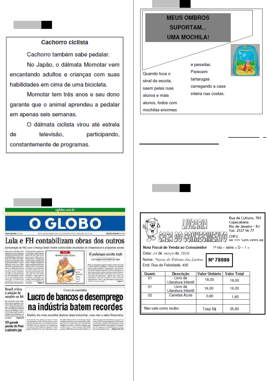 1 Atividade 5 português H4 Questão 01 ––––––––––––––––––––––––– Esta notícia apareceu em uma revista. Leia. Fonte: Revista Zá, ano 1, n. 9abril 1997, p.9. Esta notícia é sobre um cachorro que (A) late para as pessoas. (B) sabe chupar picolé. (C) pedala bicicleta. (D) vira lata de lixo. H3 Questão 02 ––––––––––––––––––––––––– Este texto serve para (A) divulgar notícias do dia. (B) receitar um remédio. (C) preparar uma pizza. (D) cantar uma música. H6 Questão 03 ––––––––––––––––––––––––– Fonte: adaptação da Revista Ciência Hoje das Crianças, ano 10, n. 66, jan./fev. 1996. No trecho “Parecem tartarugas carregando a casa inteira nas costas”, a expressão destacada tem o sentido de (A) suportar uma mochila grande e pesada. (B) levar o material escolar para a escola. (C) pendurar uma mochila nos ombros. (D) colocar a tartaruga nas costas. H6 Questão 04 ––––––––––––––––––––––––– Na volta às aulas, a mãe de Gabriel e Luciana, Maria de Fátima, precisou fazer compras. Veja a nota do que comprou. Fonte: adaptação Na leitura acima, você observa que Maria de Fátima, a mãe de Gabriel e Luciana, fez compras na (A) farmácia. (B) padaria. (C) livraria. (D) feira. 2 H7 Questão 05 ––––––––––––––––––––––––– A escola de Gabriel e Luciana continua fazendo este ano a Campanha contra a Dengue. Este cartaz foi colocado na sala de aula. O cartaz convida as pessoas a se (A) prevenirem contra a dengue. (B) fantasiarem de mosquito. (C) cuidarem no carnaval. (D) afastarem do inseto. H7 Questão 06 ––––––––––––––––––––––––– Este outro cartaz da Campanha contra a Dengue foi colocado no pátio da escola. Fonte:http://ensinareaprender- madoca.blogspot.com/2008/04/cartazes-sobre-dengue.ht O balão do cartaz indica que o personagem (A) convoca os estudantes para contarem histórias sobre a dengue. (B) alerta para a necessidade de cuidar da água parada. (C) sugere como tratar as pessoas com dengue. (D) solicita ajuda para o combate à dengue. H7 Questão 07 ––––––––––––––––––––––––– Veja este outro cartaz! FONTE: http://proportoseguro.blogspot.com/search/label/Dengue Ao olhar a segunda imagem do cartaz, nós, leitores, entendemos que o personagem está (A) zangado. (B) cansado. (C) doente. (D) triste. H3 Questão 08 ––––––––––––––––––––––––– Hoje a professora do 3º ano trouxe para a turma uma Marchinha de Carnaval. Fonte: http://letras.terra.com.br/marchinha-de-carnaval Este texto é uma música que tem como finalidade (A) convidar para conhecer a Cidade do Rio de Janeiro. (B) dar informação sobre a Cidade do Rio de Janeiro. (C) fazer um passeio pela Cidade do Rio de Janeiro. (D) falar dos encantos da Cidade do Rio de Janeiro. 3 H6 Questão 09 ––––––––––––––––––––––––– Fonte: http://www.fotosearch.com.br/fotos-imagens/quadro- negro.html Quando lemos o quadro acima, entendemos que a turma (A) gosta muito de desenhar. (B) faz a organização do dia. (C) planeja uma excursão. (D) pratica um esporte. H7 Questão 10 ––––––––––––––––––––––––– Fonte: ziraldo.blogtv.uol.com.br/.../tiras-do-ziraldo-152 No primeiro quadrinho, o menino maluquinho, no primeiro balão, diz para o Bocão que ele deve (A) pescar com mais frequência (B) ser mais inteligente (C) ter mais paciência (D) comer mais peixe H3 Questão 11 ––––––––––––––––––––––––– Ah! Na família de Gabriel e Luciana vai chegar um bebê. Olha o que eles prepararam para entregar aos amigos. Fonte: http://invited.blog.terra.com.br/files/2009/05/cha-de-bebe.jpg O texto é (A) uma carta de agradecimento. (B) um convite de chá de bebê. (C) um convite de aniversário. (D) uma poesia infantil. H6 Questão 12 ––––––––––––––––––––––––– Após o Chá de Bebê, o outro acontecimento mais importante na família será (A) o aniversário da mamãe. (B) o nascimento do bebê. (C) o batizado do bebê. (D) a chegada da vovó. H3 Questão 13 ––––––––––––––––––––––––– Gabriel e Luciana, além de brincar de roda, também gostam muito de ler. Veja a poesia que eles acabaram de escolher para ler. Fonte: www.sumauma.net/amazonian/criancas/crianca-livro. 4 A estrofe do texto em que o livro se apresenta ao leitor é a (A) primeira. (B) terceira. (C) quarta. (D) sexta. H2 Questão 14 ––––––––––––––––––––––––– Na sala de aula, a professora selecionou as características do livro. Fonte: www.sumauma.net/amazonian/criancas/crianca-livro. Gabriel e Luciana colocaram as palavras destacadas em ordem alfabética. A ordem é (A) amigo – bom – engraçado – humorado. (B) bom – engraçado – humorado – amigo. (C) engraçado – humorado – amigo – bom. (D) humorado – amigo – bom – engraçado. H4 Questão 15 ––––––––––––––––––––––––– Nesta busca pelo mundo dos livros, a turma do 3º ano descobriu estas informações sobre o Mico Leão Dourado. Você sabia? O Mico Leão Dourado é um primata brasileiro que possui pelagem cor de fogo e uma juba em torno da cabeça, o que deu origem ao seu nome. Ele se alimenta de frutas, insetos, ovos, pequenos pássaros e lagartos. O habitat deste animal no Brasil é a região montanhosa do sudoeste do Rio de Janeiro. O mico leão está ameaçado de extinção devido às capturas ilegais para a venda a comerciantes inescrupulosos e ao intenso desmatamento no seu habitat. Fonte: http://www.sa