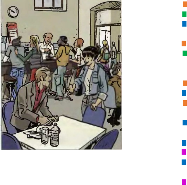 MOTS RÉVISION 1. 2. Stylo (avoir)_____________________ 3. Regarder ______________________ 4. Connaître__________________ 5. Amusant_____________________ 6. Chercher_____________________ Écoutez plusieurs fois le dialogue, puis dites si c'est vraie ou faux. Tu est content du prof? Bof! Il n'est pas mal! Excusez-moi, je cherche Jean Martin, vous le connaissez? Moi, non. Et toi, Bertrand? Jean Martin? Mais oui, je le connais! Et toi aussi! Il travaille au secrétariat! C'est le secrétaire du directeur! Ah bon, c'est lui! Eh bem, il est à la cafétéria! Comment est-il s'il vous plaît? Jeune, 30 ans à peu près; il est grand, châtain et... il parle avec deux messieurs! Merci beaucoup! Au revoir! Excusez-moi, vous êtes Jean Martin? Oui, oui, c'est moi! Bonjour monsieur! Vous avez un moment, s'il vous plaît? Mais oui, mademoiselle! Avec plaisir! 1. On entend parler trois personnages 2. Deux personnages se connaissent. 3. Un des étudiants n'aime pas son professeur. 4. Les étudiants ne connaissent pas Jean Martin. 5. Une jeune fille cherche Jean Martin. 6. Jean Martin est à la cafétéria avec le directeur. 7. Jean Martin est le secrétaire du directeur. 8. Résumé: deux garçons indiquent à une jeune fille où se trouve le secrétaire du directeur. Elle va à la cafétéria et elle parle avec lui. Maintenant, on joue la scène. Complétez avec l'article qui convient. Défini 1. 2. _____ secrétaire s'appelle Serge. 3. Ferme _____ porte, s'il te plaît! 4. _______ étudiantes se présentent! 5. Je t'attends à _____ entrée de l'école. Indéfini 1. L'école a ____ laboratoire de langues. 2. J'achète _____ livre et _____ cahier d'exercices. 3. Nous avons _____ amis belges. 4. Tu connais ______ fille qui s'appelle Magali? Les nationalités: quelle est la nationalité d'origine de ces plats et boissons? Reliez. Conjuguez les verbes suivants: 1. Tu (jouer) ___________de la guitare ? 2.Vous (chanter) __________ souvent ? 3.Nous (télécharger) _____________de la musique. 4.Il (danser) _________ quand il est heureux. 5.Ils (jouer) __________ du piano. 7.Tu (écouter) ___________ de la musique ? 8.Elles (danser) __________ beaucoup. 9.Il (télécharger) ___________ des morceaux de musique 10.Elle (chanter) _________d’une voix mélodique. GRAMMAIRE · Poser des questions. Posez les questions selon le modèle. 1. 2. Est-ce que vous êtes étudiant? 3. _________________________ anglais? 4. _________________________ marié? 5. _________________________ fatigué? Complétez les questions: 1. Est-ce que tu aimes aller au cinema? (aimer) 2. ___________________ un hôtel? (cherche) 3. ____________________ vos amis? (aider) 4. _____________________ dans la boulangerie? (travaille) Écoutez et choisissez l'option correcte. (28) 5. On entend parler... a. Deux personnages. b. Quatre personnages. QUI? c. Cinq personnages. 6. Les personnages sont: a. Des amis. b. Des employez du même bureau. QUI? c. Des personnages qui ne se connaissent pas. 7. Les personnages sont... a. Dans la rue. b. Dans une classe. OÙ? c. Dans un lieu public. 8. Ils parlent... a. D'amis communs. b. D'un monsieur qui travaille QUOI? dans le bureau. c. De travail. 9. Le deuxième personnage désire... a. Parler avec Bruno Legrand. b. Téléphoner à Bruno Legrand. QUOI? c. Savoir si Bruno Legrand travaille dans ce bureau. GRAMMAIRE · La négation Mettez à la forme negative. Dans un bon hôtel. Dans un mauvais hôtel. La chambre est grande. La chambre n'est pas grande. Le lit est confortable. __________________________________ L'eau est chaude. __________________________________ Les chambres sont chères. __________________________________