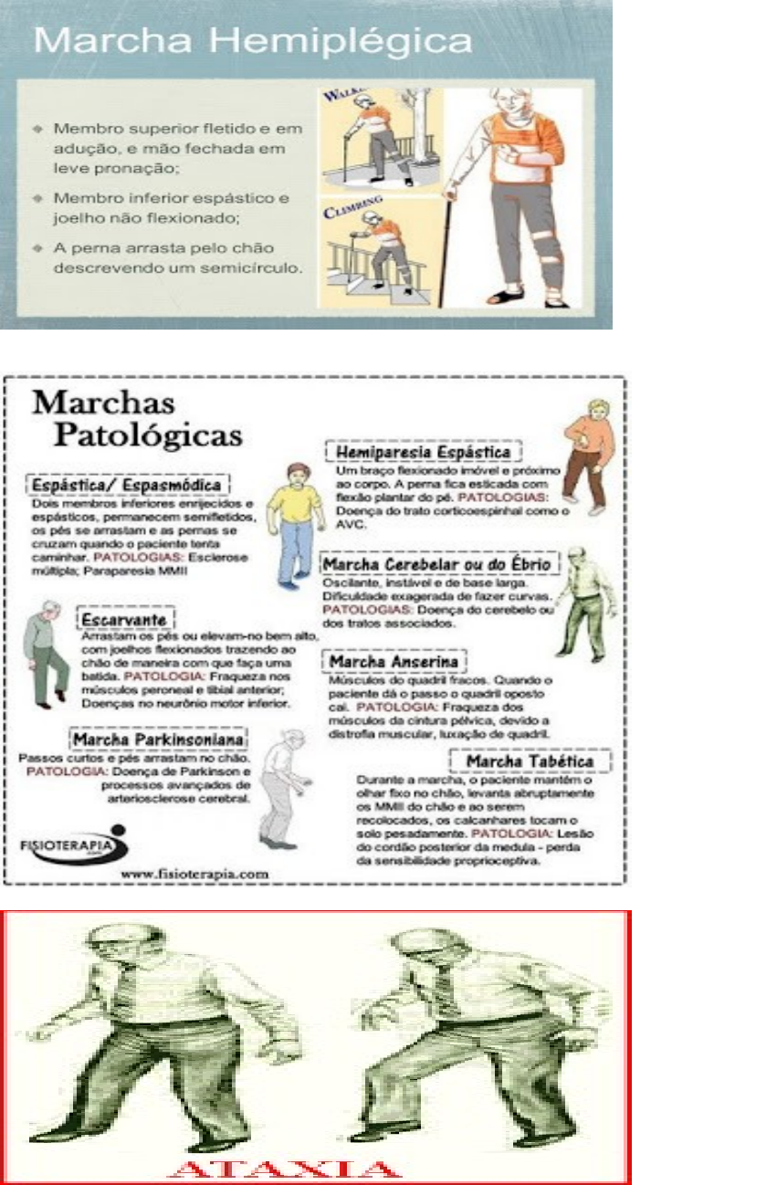 Tipos de macha MARCHA ESCARVANTE (Parética ou marcha do polineurítico): MARCHA ANSERINA (marcha de pato, marcha de Trendelenburg ou miopática): O paciente caminha com rotação exagerada da pelve, arremessando ou rolando os quadris de um lado para o outro a cada passo, para deslocar o peso do corpo, assemelhando ao pato quando anda.É frequente nas miopatias com fraqueza da musculatura da cintura pélvica, principalmente dos músculos glúteos médios. MARCHA EM TESOURA (Marcha espástica): Ocorre um encurtamento dos músculos adutores do quadril, provocando uma adução das coxas, de modo que os joelhos podem cruzar-se um na frente do outro, com a passada assemelhando-se a uma tesoura. Bastante comum nos pacientes com espasticidade grave dos membros inferiores, principalmente os que tem diplegia espástica congênita (paralisia cerebral, doença de little). MARCHA APRÁXICA: Caracteriza-se pelo andar semelhante ao de uma criança dando os seus primeiros passos com dificuldade na iniciação da marcha e no movimento de virada para dar a volta; parece que seus pés estão presos ao solo (marcha magnética). Pode ser encontrada nos casos de hidrocefalia de pressão normal e demência vascular. Plegia é uma paralisia, é a ausência de movimento de um segmento, de uma parte do corpo ou de várias delas. Já a Paresia é a diminuição do movimento, fraqueza muscular. Ambas têm origem neurológica, acontecem por uma lesão nos nervos, no cérebro ou na medula espinhal OBS:Paraparesia = fraqueza, diminuição da força muscular nos membros inferiores. Existe movimento voluntário, mas é diminuído, é o caso de pessoas com Paraparesia Espástica Hereditária (PEH) em sua forma mais comum, onde apenas os membros inferiores são acometidos. É também o caso de quem tem poliomielite. Tetraplegia = paralisia, ausência de movimento dos membros superiores, inferiores e tronco. Monoplegia é paralisia de um único membro, geralmente um braço. Ave acidente encefálico os objetivos nessa fase são: · Manter ou ganhar amplitude de movimento · Prevenir e/ou tratar subluxação de ombro · Prevenir contraturas e deformidades Ganho de força · Prevenir dores articulares · Ganhar força muscular · Melhorar a propriocepção · Melhorar o equilíbrio · Normalizar o tônus muscular