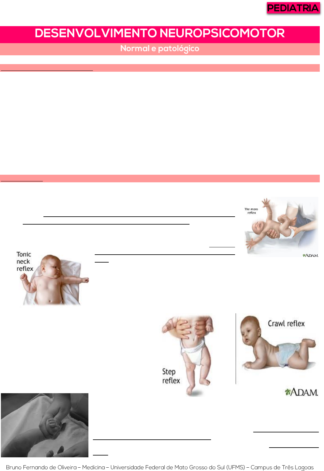 Desenvolvimento cerebral – Mito ou fato? • Mito: ao nascer o cérebro está desenvolvido. Fato: a maioria das células cerebrais são formadas intraútero, mas a maioria das conexões entre as células acontecem durante a infância; • Mito: o desenvolvimento cerebral depende exclusivamente dos seus genes herdados. Fato: as primeiras experiências e a interação com o meio são fundamentais para o desenvolvimento cerebral da criança; • Mito: o cérebro da criança é menos ativo do que o cérebro de um jovem universitário. Fato: o cérebro de uma criança de 3 anos é 2x mais ativo que de um adulto; • Mito: conversar com o bebê não é importante já que ele não entende o que dizemos. Fato: conversar com bebês desenvolve as bases da linguagem durante períodos críticos; • Mito: as crianças precisam de ajuda especial e brinquedos educativos para desenvolver sua capacidade intelectual. • Fato: o que as crianças mais precisam é carinho e experiências, e não atenção especial e brinquedos caros. Falar, brincar, cantar, ler, são algumas das principais atividades que desenvolvem o cérebro infantil. Reflexos primitivos • São reflexos do sistema nervoso central presentes em neonatos, mas, não ocorrem em adultos, já que possuem o sistema nervoso totalmente formado. Aumenta a mielinização dos neurônios, assim como a árvore neuronal e as sinapses, determinando maior controle voluntário das atividades relacionadas com esses reflexos. Em casos de adultos que ainda apresentem esses reflexos ou passam a apresentar depois de um tempo, podem existir lesões ou más formações neurológicas; • O reflexo de moro (The moro reflex): presente somente em neonatos, nos três primeiros meses de vida, desencadeado naturalmente por um susto, barulho ou movimento brusco. É desencadeada por queda súbita da cabeça, amparada pela mão do examinador. Observa-se extensão e abdução dos membros superiores seguido por choro. • Reflexo tônico cervical assimétrico (Tonic neck reflex): paciente em decúbito dorsal. O examinador vira a cabeça da criança para o lado e verifica-se a extensão dos membros superiores e inferiores ipsilaterais, enquanto os membros contralaterais entram em flexão. Normalmente ocorre até os 6 ou 7 meses de idade. • Reflexo de preensão palmar (Grasp reflex): é desencadeado pela prensão da palma da mão. Observa a flexão dos dedos. • Marcha reflexa (Step reflex): é desencadeado por inclinação do tronco do recém-nascido após obtenção do apoio plantar. Observa-se o cruzamento das pernas, uma à frente da outra, como se estivesse marchando. • Reflexo do nadador (Crawl reflex): pode ser estimulado colocando o recém-nascido de bruços (com a face para baixo) em uma superfície plana. O recém- nascido tentará rastejar para a frente usando os braços e as pernas. Ocorre até os 3 ou 4 meses. • Sucção reflexa: é desencadeado pela estimulação dos lábios. Observa-se sucção vigorosa. Sua ausência é sinal de disfunção neurológica grave. • Preensão plantar: é desencadeado pela pressão da base dos artelhos. Observa-se flexão dos dedos. • Preensão palmar: é desencadeado pela pressão da palma da mão. Observa-se flexão dos dedos. • Marcha automática: geralmente ocorre até o primeiro mês de vida. Normalmente surge a partir do 4º dia de vida, quando a criança é mantida abaixo das axilas em um plano reto e a criança flexiona ou estica as pernas alternadamente, como se quisesse caminhar. Se esse reflexo se estende além do primeiro mês de vida e continua seu comportamento reflexo, é considerado um sinal patológico no desenvolvimento do sistema nervoso. Tônus • Sempre flexionado; • O tônus é avaliado pela palpação dos músculos, movimentação passiva dos membros e balanço passivo das extremidades; • Nos primeiros meses de vida, a cabeça do bebê deve sempre ser centralizada para o exame, pois, a presença do reflexo tônico- cervical assimétrico altera o tono caso a cabeça esteja lateralizada; • Durante o primeiro ano de vida o tônus muscular varia de flexor (do recém-nascido a termo) para hipotônico (entre 6 e 8 meses), até atingir valores normais no fim do primeiro ano de vida. Marcos do desenvolvimento • Primeiro mês: o Hipotonia cervical; o Atitude assimétrica; o Hipertonia flexora geral; o Reflexos primitivos; o Olhar momentâneo; o Choro inarticulado; • Segundo mês: o Postura simétrica; o Tônus cervical momentâneo; o Hipertonia geral leve; o Perde o reflexo esgrimista; o Sorrir espontâneo; o Começa a lalação; o Acompanha objetos em seu campo visual. • Quarto mês: o Apoio no antebraço; o Tonus cervical completo; o Aprende a rolar; o Preensão palmar voluntária; o Estabiliza a lalação; o Perde marcha reflexa e moro inconstante. • Sexto mês: o Ajuda ao sentar-se; o Senta-se com apoio; o Perde o moro e a preensão palmar; o Transfere objetos de mão; o Procura sons com a cabeça. • Nono mês: o Senta-se sem apoio; o Engatinha; o Hipotonia fisiológica; o Perde preensão palmar; o Primeiras palavras; o Pegada em pinça; o Responde diferentemente às pessoas. • Décimo segundo mês: o Fica de pé e marcha com apoio; o Predomina a hipotonia fisiológica; o Fim dos reflexos primitivos; o Palavras sem sentido; o Dá tchau, manda beijo, bate palmas; o Fala não. • A partir de 12 meses: o Anda sem apoio; o Pegada em pinça; o Combina 2 ou mais palavras; o Tira pelas de roupas. Perímetro cefálico Sinais patológicos de desenvolvimento • Manutenção dos reflexos arcaicos por mais tempo; • Perímetro cefálico que não aumenta; • Não aquisição dos marcos de desenvolvimento; • Para quem encaminhar? Verificar se há necessidade de enviar para outro pediatra ou mesmo para um neurologista; • Neuropediatra é necessário para estimulação precoce; Períodos críticos de desenvolvimento • O desenvolvimento cerebral segue padrão específico e partes do c