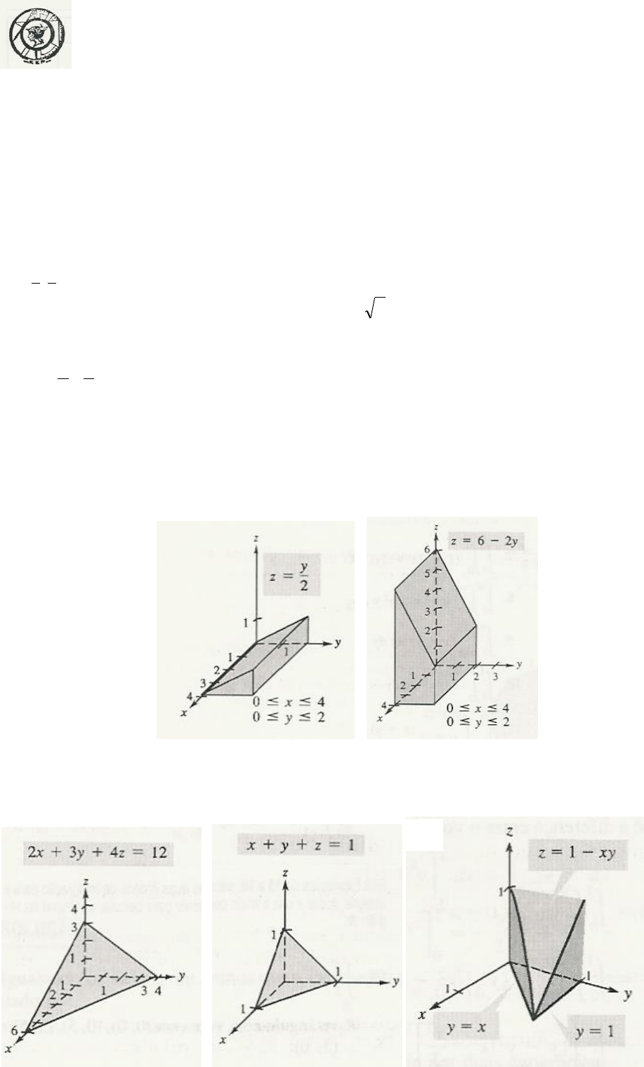 ESCOLA DE ENGENHARIA DE PIRACICABA CURSOS DE ENGENHARIA MECANICA, CIÊNCIA DA COMPUTAÇÃO E ENGENHARIA MECATRÔNICA 4ª LISTA DE EXERCÍCIOS - CÁLCULO III 1. Calcule: 2 0 3 1 22 dydxyx2yx)a 4/ 0 0 dydxycosxsen)b 2/ 0 3 1 2 dydxycosx2)c 1 2 2 0 2x dydxyex)d 2 0 2 0 dxdyycosxsen)e 4 1 2 0 dydxyx)f 4 1 2 1 dxdy x y y x )g 2 0 x 0 22 dxdyyxyx)h 0 2 4 x 2 dxdyyx1)i 2 2. Use integral dupla para encontrar o volume dos sólidos abaixo: 3. Calcule D dAyx , onde D é limitado pelas retas .x2ye2y,2x 4. Calcule o volume dos sólidos abaixo, usando integrais duplas: a) b) a) b) c) 2 5. Determine o volume do sólido cuja base é a região do plano Oxy limitada pela parábola 2x4y e pela reta x2y e cuja parte superior é o plano 5xz . 6. Calcule D dAy2x , em que D é a região limitada pelas parábolas 22 x1yex2y . 7. Calcule a área do domínio D, região triangular com vértices 2,3e1,1,2,0 . 8. Calcule a área do domínio D, região entre os gráficos das funções 2xye8x6xy 2 . 9. Nas integrais abaixo, inverta a ordem de integração: 1 0 y2 y dydxy,xf)a 2 0 2 2x dxdyy,xf)b 2 10. Calcule cada integral pela mudança para coordenadas polares: 3 3 x9 x9 yx dxdye)a 2 2 22 2 0 x4 0 22 dxdyyx)b 2 11. Use coordenadas polares para calcular cada integral dupla sobre a região indicada: 0ye0x,4yx:D;dydxyx4)a 22 D 22 x3y0,2yx1:D;dydxyx)b 22 D 22 cos13r3,22 :D;dydx)c D 12. Calcule D 22 dydxyx , onde D é o círculo de centro na origem e raio 2. 13. Calcule D yx dydxe 22 , onde D é a região do plano xy limitada por 9yxe4yx 2222 .