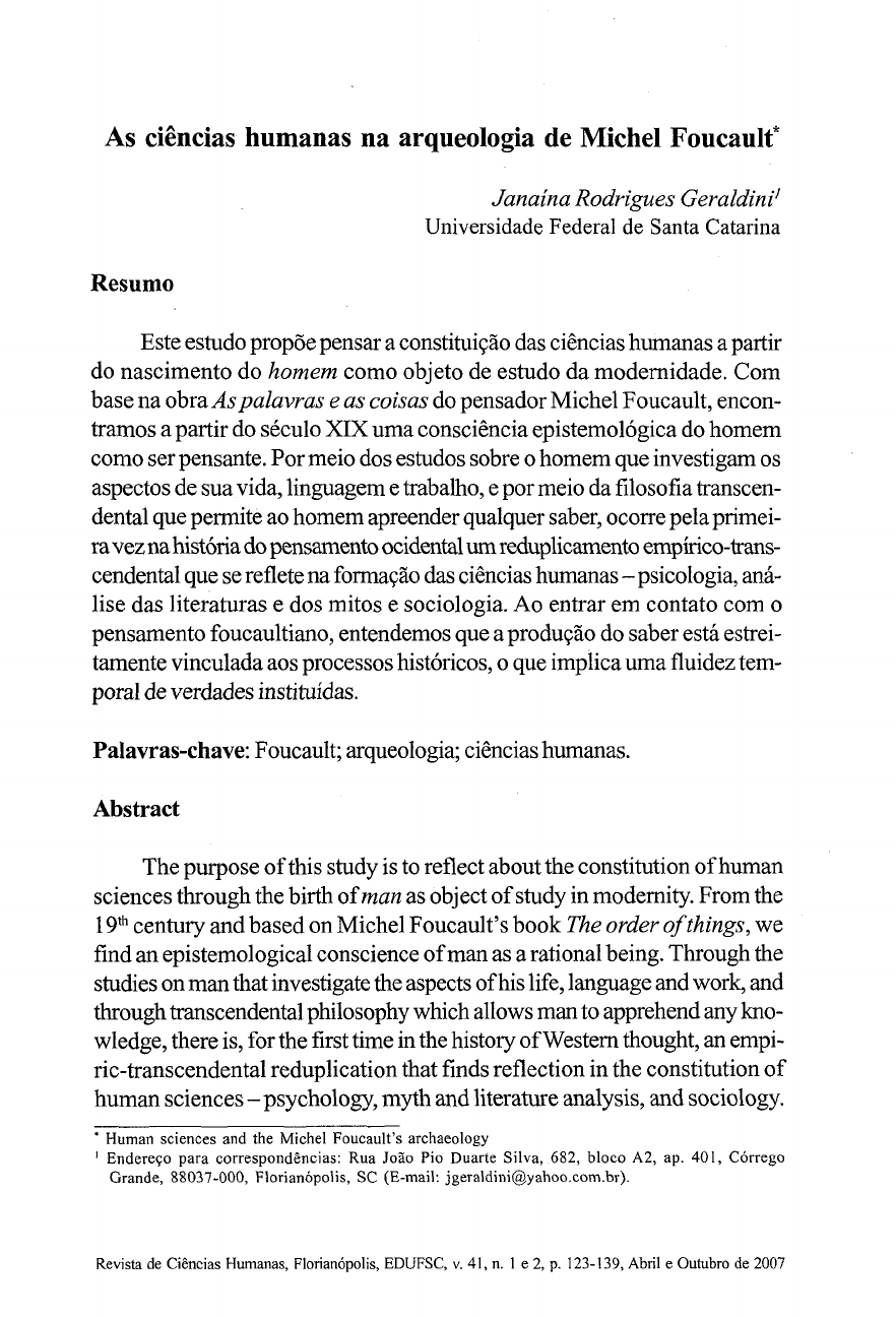 As ciências humanas na arqueologia de Michel Foucaule Janaina Rodrigues Geraldinii Universidade Federal de Santa Catarina Resumo Este estudo propõe pensar a constituição das ciências humanas a partir do nascimento do homem como objeto de estudo da modernidade. Com base na obra As palavras e as coisas do pensador Michel Foucault, encon- tramos a partir do século XIX uma consciência epistemológica do homem como ser pensante. Por meio dos estudos sobre o homem que investigam os aspectos de sua vida, linguagem e trabalho, e por meio da filosofia transcen- dental que permite ao homem apreender qualquer saber, ocorre pela primei- ra vez na história do pensamento ocidental um reduplicamento empírico-trans- cendental que se reflete na formação das ciências humanas —psicologia, aná- lise das literaturas e dos mitos e sociologia. Ao entrar em contato com o pensamento foucaultiano, entendemos que a produção do saber está estrei- tamente vinculada aos processos históricos, o que implica uma fluidez tem- poral de verdades instituídas. Palavras-chave: Foucault; arqueologia; ciências humanas. Abstract The purpose of this study is to reflect about the constitution of human sciences through the birth of man as object of study in modemity. From the 19d1 century and based on Michel Foucault's book The order of things, we find an epistemological conscience of man as a rational being. Through the studies on man that investigate the aspects ofhis life, language and work, and through transcendental philosophy which allows manto apprehend any kno- wledge, there is, for the first time in the history ofWestern thought, an empi- ric-transcendental reduplication that finds reflection in the constitution of human sciences —psychology, myth and literature analysis, and sociology. • Human sciences and the Michel Foucault's archaeology ' Endereço para correspondências: Rua João Pio Duarte Silva, 682, bloco A2, ap. 401, Córrego Grande, 88037-000, Florianópolis, SC (E-mail: jgeraldini@yahoo.com.br). Revista de Ciências Humanas, Florianópolis, EDUFSC, v. 41, n. 1 e 2, p. 123-139, Abril e Outubro de 2007 H Revista de Ciências UMANASUMANAS Once we come in contact with the thought of Michel Foucault, we discover that the production of knowledge is closely tied to historical processes, what implicates a temporal fluidity ofinstituted truths. Keywords: Foucault; archaeology; human sciences. 1 - A episteme moderna S egundo Foucault (1999), o homem é uma invenção recente que a modernidade criou na esfera do saber. Esse autor diz que a episteme moderna opera uma ruptura na história do pensamento ocidental, caracte- rizado anteriormente pelo saber dos clássicos.' Para entender as diferentes configurações dos saberes clássico e moderno, e a ruptura entre eles mar- eada pelo nascimento do homem a partir do século XIX, Foucault utiliza o processo da análise arqueológica, focalizando múltiplas transformações no espaço do saber e inferindo sobre a criação de novas formas de racionali- dade (MOTTA, 2005). Nas palavras do autor: [..] a arqueologia define as regras de forma- ção de um conjunto de enunciados. Manifesta, assim, como uma sucessão de acontecimentos pode, na própria ordem em que se apresenta, tornar-se objeto de discurso, ser registrada, descrita, explicada, receber elaboração em con- ceitos e dar a oportunidade de uma escolha te- órica [...]. A arqueologia não nega a possibili- dade de enunciados novos em correlação com acontecimentos exteriores. Sua tarefa é mostrar em que condições pode haver tal correlação entre eles, e em que ela consiste precisamente Afirmar que determinados saberes compõem uma mesma episteme equivale a dizer que eles são atravessados pelas mesmas regras de formação, organização e aparecimento, num dado momento da história (MACHADO, 1981). Foucault analisa uma diversidade de discursos, que aparentemente não têm qualquer proximidade entre si, e encontra caracte- rísticas semelhantes que norteiam a formação e sustentação desses discursos. É perceben- do a homogeneidade nos discursos de uma época que será caracterizada uma episteme, diferenciando-a como nova periodização do saber ocidental, como nova forma de racio- nalidade (MOTTA, 2005). Revista de Ciências Humanas, Florianópolis, EDUFSC, v. 41, n. 1 e 2, p. 123-139, Abril e Outubro de 2007 124 As ciências humanas na arqueologia de Michel Foucault Janaina Rodrigues Geraldini (quais são seus limites, forma, código, lei de possibilidade) (FOUCAULT, 1987, p. 191-92). Utilizando tais análises, Foucault (1999) diferencia a episteme clássi- ca da moderna, quando diz que a primeira é caracterizada pela representa- ção e a segunda é marcada pela dupla experiência do homem como sujeito e objeto do saber. O saber clássico está situado numa dimensão na qual existem seres e coisas organizados e classificados de acordo com as seme- lhanças e diferenças. É nesse sentido que a episteme dos séculos XVII e XVIII tem como característica marcante a classificação e ordenação das representações. Representar significa, para o classicismo, comparar as es- truturas visíveis das coisas da natureza e relacioná-las por meio de um prin- cípio ordenador. O século XIX constituiu uma nova positividade distinta do saber dos clássicos. Foucault (1999) considera que, apesar de se poder reconhecer o homem no classicismo, seja com relação à história natural, à gramática geral ou à análise das riquezas, essa ordem não se configura com uma consciência epistemológica do homem como fundamento e objeto. Na modernidade, o homem como ser, como objeto desse novo saber, estará sempre vinculado aos aspectos que o constituem como homem. O homem surge na biologia, na economia política e na filologia como invenção recente desses saberes, não estando mais no final de um quadro bem ordenado como o modelo último e perfeito. Ele agora é dado à expe- riência, e é pensado co