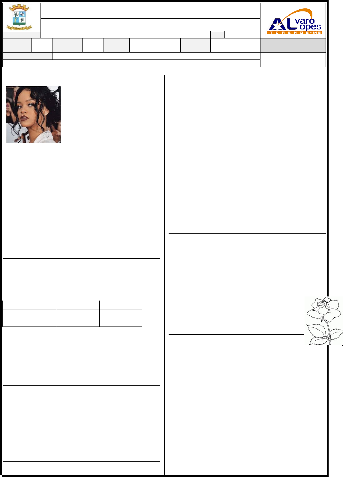 PREFEITURA MUNICIPAL DE TERENOS DEPARTAMENTO DE EDUCAÇÃO, CULTURA E ESPORTES ESCOLA MUNICIPAL ALVARO LOPES – TERENOS/MS STUDENT: Nº YEAR: 6° CLASS: TURN: MORNING Afternoon DATE: NOTA TEACHER: ANTONIEDIA LEITE GONÇALVES EXAME FINAL - LÍNGUA INGLESA Read:(Leia) Singer Robyn Rihanna Fenty was born on February 20, 1988, in St. Michael Parish on the Caribbean island of Barbados. She is the eldest of three children born to Monica Fenty, an accountant, and Ronald Fenty, a warehouse supervisor. http://www.biography.com/people/rihanna-201257 1.Rihanna is an: (Rihanna é uma) (1.0) a)Doctor b)Teacher c)Singer D)Engineer 02. COMPLETE THE TABLE AND CHECK THE CORRECT ALTERNATIVE: (1.0) Demonstrative Pronouns Perto Longe Singular Plural ALTERNATIVES: a) ( ) THIS/THAT – THESE/THOSE b) ( ) THAT/THIS- THESE/THOSE c) ( ) THAT/THOSE- THIS/THAT d) ( ) THIS/THAT- THAT/THIS 03. Which the sentences is in Simple Present Tense ? (1.0) a) He has read a book. b) He is reading a book. c) He read a book. d) He reads a book. 04. Escreva o pronome pessoal ( personal pronouns) correto: a.Peter = ____ f.Laura = ____ b.The dog = ____ g.The cat = ____ c.Suellen = ____ h.Lucy and I = ____ d.Frank and Maggy = ____ i.The books= ____ e.Lucy = ____ j.Paul and Mile = ____ 05.Complete, escrevendo a forma correta do verbo to be ( am, is , are) no presente do indicativo: (1.0) a). It ____ a house. b.) She ____ a tennis player. c).We ____ artists. d.)He ____ a doctor. e.)I ____ a boy. 06.Complete the bank spaces with the right conjugation of the Simple Present Tense. Follow the example: (1.0) Example: Anne loves the Jane Austin's work. (love) a) Cayo ________________to the College tonight. (go) b) My parents _______________ Italian and French classes on Thurdays every week. (have) c) Louise ____________________at the Brad's Office. (work) d) I ___________________ bread with nuts jelly every morning. (eat) e) The plain _______________ at 08:00 in the city. (arrive) 07.Put in the correct verb forms: (1.0) I. Andy___________________the family car. a) wash b)washes c) washs II. John often__________________handball. a)play b) playes c) plays III. Do you _______ milk in your tea? a)like b) likes c) likes IV. He __________ plays cocker. a)Do not b)Does not c)Do nots 08. Escolha uma seqüência que complete as sentenças: (1.00) ________ you like to play volley? ________ she like to watch TV? ________ they go to the cinema? He ________ not eat pasta. ________ I sit in the right place? Alternatives: a) Do – Does – Do – Do – Does b) Does – Do – Do – Does – Do c) Do - Does – Do – Does – Do d) Does – Do – Do – Do – Does e) Do – Do – Does – Do – Do 09. Na forma negativa a frase “ Does she like pizza?” fica: (1.0) a) She does not likes pizza. b) Does not she like pizza. c) Not does she like pizza. d) She does not like pizza. e) She does like pizza. 10. Leita o texto. (1.0) Hi! I’m Otavio. I am 10 years old This is my family. George is my father and Rose my mother. They are my parents. Juca is my brother. He is 2 years old. Marilia is my sister. She is 8. Rui and Liza are my grandparents. I love my family. a) O texto fala de quem? ________________________________________________________________________________ b) Qual a idade dele? ________________________________________________________________________________ c) Qual o nome do pai e da mãe de Otavio? ________________________________________________________________________________________________________________________ d) Otavio tem irmão e irmã? ________________________________________________________________________________________________________________________ e) Qual a idade de Juca e Marília? ________________________________________________________________________________________________________________________ GOOD TEST!