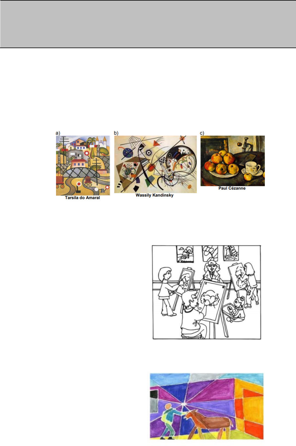ESCOLA ESTADUAL JOAO PINHEIRO Avaliação de Arte – 4º Bimestre Prof. (a) Aline Frois Disciplina: Arte Aluno (a): ____________________________________________________________ 1 – A principal característica da pintura abstrata é a ausência de relação imediata entre formas e cores de um ser. Uma tela abstrata não representa nada da realidade que nos cerca, nem narra figurativamente alguma cena histórica, literária, religiosa ou mitológica. Marque a opção que apresenta uma obra abstrata: 2 – Marque a opção que mostra qual a modalidade de desenho está sendo feita pelas pessoas da cena ao lado. a) Abstrato b) Memória c) Observação d) Linhas e Pontos 3 – Na obra de Paul Klee, foram usados polígonos regulares. Qual foi usado mais vezes? a) Circulo b) Quadrado c) Retângulo d) Triangulo 4 – A imagem apresentada representa: a) Arte moderna b) Arte contemporânea c) Arte rupestre d) Arte medieval 5 – Escreva com suas palavras sobre a Obra abaixo: ____________________________________________________ ____________________________________________________ _____________________________________________________ _______________________________________________________ ______________________________________________________ 6 – O Expressionismo foi um movimento artístico vanguardista que apareceu na Alemanha nos primeiros anos do século XX e influenciou várias gerações de artistas plásticos. Entre as vanguardas artísticas européias do inicio do século XX. Dentre muitas obras expressionistas temos o “Grito” uma das mais conhecidas desse movimento. Considerando o texto o autor dessa obra foi: a) Van Gog b) Edvard munch c) Pablo Picasso d) Leonardo da Vinci 7 – Descreva sobre a obra de Piet Mondrian: ____________________________________________________ ____________________________________________________ ____________________________________________________ ____________________________________________________