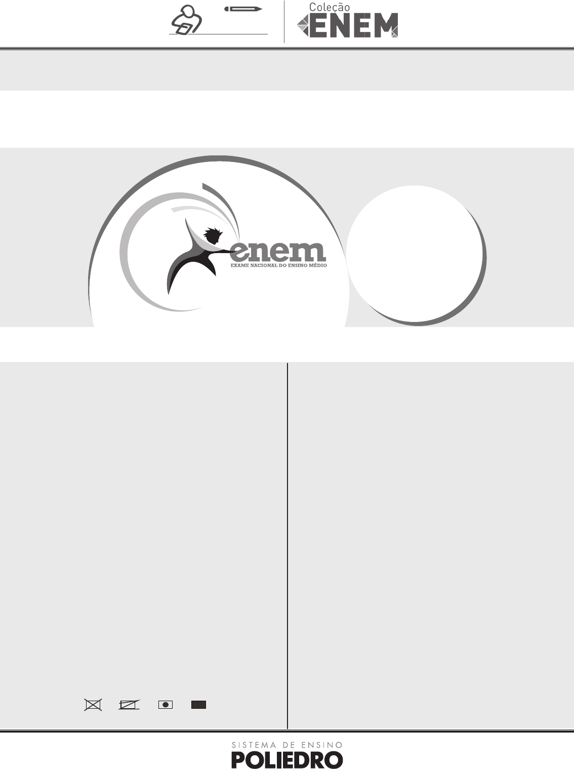EXAME NACIONAL DO ENSINO MÉDIO 2016 UM ENSAIO PARA A VIDA INSTRUÇÕES PARA A PROVA LEIA ATENTAMENTE AS INSTRUÇÕES SEGUINTES: 1 Este CADERNO DE QUESTÕES contém a Proposta de Redação e 95 questões numeradas de 1 a 95, dispostas da seguinte maneira: a. as questões de número 1 a 50 são relativas à área de Linguagens, Códigos e suas Tecnologias; b. as questões de número 51 a 95 são relativas à área de Matemática e suas Tecnologias. ATENÇÃO: as questões de 1 a 10 são relativas à língua estrangeira. Você deverá responder apenas às questões relativas à língua estrangeira escolhida (Inglês ou Espanhol). 2 Confira se o seu CADERNO DE QUESTÕES contém a quantidade de questões e se essas questões estão na ordem mencionada na instrução anterior. Caso o caderno esteja incompleto, tenha qualquer defeito ou apresente divergência, comunique ao fiscal de sala para que ele tome as providências cabíveis. 3 Para cada uma das questões objetivas, são apresentadas 5 opções. Apenas uma corresponde à questão. 4 Você deve ler cuidadosamente cada uma das questões e escolher a alternativa que corresponda à resposta correta. Essa alternativa (a, b, c, d ou e) deve ser preenchida completamente no item correspondente na folha de respos- tas que você recebeu, segundo o modelo abaixo. Observe: 5 O tempo disponível para estas provas é de cinco horas e trinta minutos. 6 Reserve os 30 minutos finais para preencher sua folha de respostas. Os rascunhos e as marcações assinaladas no CADERNO DE QUESTÕES não serão considerados na avaliação. 7 Você poderá deixar o local de prova somente após decorridas duas horas do início da aplicação. 8 Fica estritamente proibido: a. perturbar, de qualquer modo, a ordem no local de aplicação das provas, incorrendo em comportamento indevido durante a realização da prova; b. se comunicar, durante a prova, com outro participante verbalmente, por escrito ou por qualquer outra forma; c. utilizar ou tentar utilizar meio fraudulento, em benefício próprio ou de terceiros, em qualquer etapa da prova; d. utilizar livros, notas ou impressos durante a realização da prova; e. utilizar máquina calculadora ou quaisquer outros dispositivos eletrônicos, tais quais celulares, pagers e similares. Boa prova! A ERRADO ERRADO ERRADO CORRETO A A A CICLO 2º DIA PROVA DE REDAÇÃO E DE LINGUAGENS, CÓDIGOS E SUAS TECNOLOGIAS PROVA DE MATEMÁTICA E SUAS TECNOLOGIAS 1 AEPS SISTEMA DE AVALIAÇÃO EDUCACIONAL POLIEDRO LC - 2o dia | Ciclo 1 - Página 2 2016 2016 PROPOSTA DE REDAÇÃO Com base na leitura dos textos motivadores seguintes e nos conhecimentos construídos ao longo de sua for- mação, redija um texto dissertativo-argumentativo em norma-padrão da língua portuguesa sobre o tema As perspectivas para a educação brasileira, apresentan- do proposta de intervenção que respeite os direitos hu- manos. Selecione, organize e relacione, de forma coe- rente e coesa, argumentos e fatos para a defesa de seu ponto de vista. Texto I Fechamento de escolas mobiliza alunos em SP Ameaça de fechamento de 150 escolas leva milhares de adolescentes às ruas em todo o estado contra a decisão de Alckmin de "reorganizar" a educação [...] No final de setembro, o secretário de educação do estado, Herman Voorwald, anunciou que em 2016 as escolas serão reorganizadas para que mais escolas atendam apenas uma etapa de ensino entre as três que a rede contempla: Fundamental 1 (1o ao 5o ano), Funda- mental 2 (6o ao 9o ano) e Ensino Médio. A justificativa do governo é que, com isso, as unidades se concentrariam em qualidade para cada idade. As diretorias regionais de ensino, no entanto, rece- beram um documento com a reorganização prevista no qual estava a informação sobre o fechamento de unida- des, muitas delas com salas lotadas. Circula uma lista, montada pelo sindicato dos professores (Apeoesp), com 150 escolas ameaçadas, o equivalente a 3% de toda a rede. Professores e estudantes acreditam que a medida visa cortar gastos. [...] RODRIGUES, C. Carta Capital. 9 out. 2015. Disponível em: www.cartacapital.com.br/educacao/fechamento-de-escolas-mobiliza- alunos-em-sp-2083.html. Acesso em: 6 jan. 2016. Texto II A educação do século 21 é movida por interação e curiosidade, afirma escritor [...] Portal Aprendiz – E o papel do educador, como agen- te nesse processo? Antonio Navalón – Estamos em um mundo em que, pela primeira vez na história, os alunos podem ensinar tanto quanto os professores. Temos que romper com as posições: já não funciona mais [o modelo onde] o professor fala, os alunos escutam. Somos uma sociedade do diálogo, então a identidade do educador é tão importante quanto a do aluno. A diferença é que eles precisam fazer o esforço de saber escutar. Viemos de uma cultura de silêncio dos alunos, precisamos criar o silêncio dos professores. Portal Aprendiz – Além da escuta, que é algo a ser trabalhado nos professores, você destacaria alguma ou- tra mudança que precisa ser operada nas escolas? Navalón – Sim, uma bem importante: que a escola seja o baluarte de valores como tolerância, democracia, em suma, os valores que nos fazem melhores como se- res humanos. Ou seja, tão importante quanto ensinar a somar, é ensinar a respeitar. [...] NAVALÓN, A. Portal Aprendiz. 27 abr. 2013. Entrevista concedida a Raiana Ribeiro. Disponível em: http://portal.aprendiz.uol.com.br/arquivo/2013/04/27/a- educacao-do-seculo-21-e-movida-por-interacao-e-curiosidade-afirma-escritor/. Acesso em: 6 jan. 2016. (Adapt.). Texto III Em outubro de 2003, o Instituto Brasileiro de Geogra- fia e Estatística anunciou dados que permitem projetar conclusões a respeito do século 20. Uma compilação dos dados nos trará a consideração que, no século em ques- tão, o Brasil aumentou sua riqueza, mas não a dividiu; ou seja, a concentração de renda é abusiva: aquele 1% mais rico dos brasileiros ganhando praticamente o mesmo que a metade d