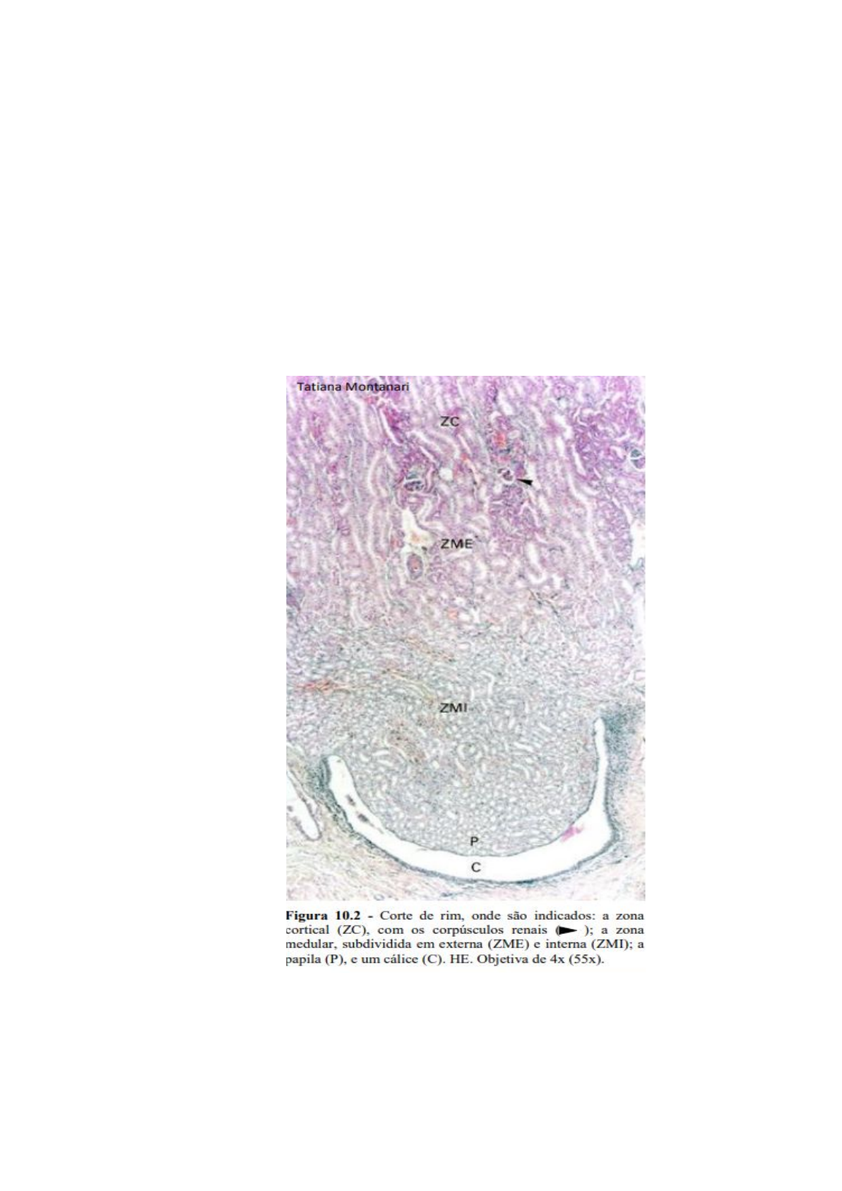 ● Produz a urina ● Os rins são envolvidos por tecido adiposo, o qual confere proteção contra choques. Possuem uma cápsula de tecido conjuntivo denso, com muitos miofibroblastos na porção interna. ● Os rins podem ser divididos em: córtex e medula. O córtex possui estruturas vasculares, os corpúsculos renais (ou de Malpighi), onde o sangue é filtrado. O fluido formado percorre um sistema tubular nas regiões cortical e medular, onde sofre modificações e torna-se a urina. Os túbulos da medula, devido ao seu arranjo e à diferença de comprimento, constituem estruturas cônicas, as pirâmides medulares. A base da pirâmide medular situa-se no limite corticomedular, e o ápice (papila) é voltado para o hilo. Uma pirâmide medular e o tecido cortical adjacente constituem um lobo renal. ● O néfron é constituído por: corpúsculo renal, túbulo proximal, alça de Henle (ou túbulo intermediário) e túbulo distal. Vários néfrons desembocam em um tubo coletor. O lóbulo renal é a parte do órgão em que os néfrons drenam para o mesmo tubo coletor. ● O corpúsculo renal consiste no glomérulo, um enovelamento de capilares, e a cápsula de Bowman, que possui dois folhetos: um externo, o folheto parietal, de epitélio simples pavimentoso, e outro interno, acolado aos capilares. Entre os dois folhetos, há o espaço capsular, que recebe o líquido filtrado através da parede dos capilares e do folheto visceral. ● ● Cada lóbulo do rim é formado por duas porções funcionais e embriologicamente distintas: o néfron e o tubo coletor ● O néfron é formado pelo cospusculo renal, túbulo contorcido proximal , alça de henle e pelo túbulo contorcido distal ● O corposculo renal é formado por um tufo de capilares, o glomérulo e envolvido pela capsula de bowman. ● A capsula de Bowman possui dois folhetos, um interno (junto aos capilares glomerulares) e um externo (formando os limites do corpusculo). Entre os dois folhetos existe o espaço capsular que recebe o líquido filtrado através da parede dos capilares e do folheto interno da capsula ● O folheto externo é constituido por um epitélio simples pavimentoso que se apoia na lâmina basal ● Tubulo contorcido proximal: É maior que o túbulo distal, suas secções são vistas com mais frequência nas proximidades dos corpúsculos. Possui lumens amplos e são circundados por muitos capilares sanguineos. O filtrado glomerular passa para o túbulo contorcido proximal onde começa o processo de absorção e excreção. O túbulo proximal secreta creatinina e substâncias estranhas ao organismo. ● Alça de Henle: Estrutura em forma de U, participa da retenção de água. ● Túbulo contorcido distal: A parte espessa da alça de Henle torna-se tortuosa e passa a ser chamada de túbulo contorcido distal, também revestida por epitélio cúbido simples. Segmento modificado que aparece escuro nos cortes chama-se macula densa. A macula densa libera a enzima renina na circulação. O túbulo contorcido distal influencia o conteúdo de sais e água no organismo além de realizar o equilibrio ácido-básico no sangue. ● Túbulos e ductos coletores: A urina passa dos túbulos contorcidos distais para os túbulos coletores que se dirigem para as papilas. Os ductos coletores da medula participam dos mecanismos de concentração da urina. ● Aparelho justaglomerular: Não tem membrana elástica interna e suas células musculares são modificadas e chamadas de justaglomerulares. O citoplasma é carregado de granulos que participam da regulação da pressão sanguinea. A mácula densa do túbulo distal normalmente se localiza proxima as células justaglomerulares, formando um conjunto chamado de aparelho justaglomerular. Também fazem parte desse aparelho células com citoplasma claro de função pouco conhecida denominadas de células mesangiais extraglomerulares. ● Cada rim recebe sangue por uma artéria renal que antes de penetrar no órgão se divide em dois ramos, um ramo irriga a parte anterior (ventral) e o outro a parte posterior (dorsal) do rim. ● O espaço entre os néfrons e os vasos sanguíneos e linfáticos chama-se interstício renal, ele é muito escasso na cortical mas aumenta na medular.