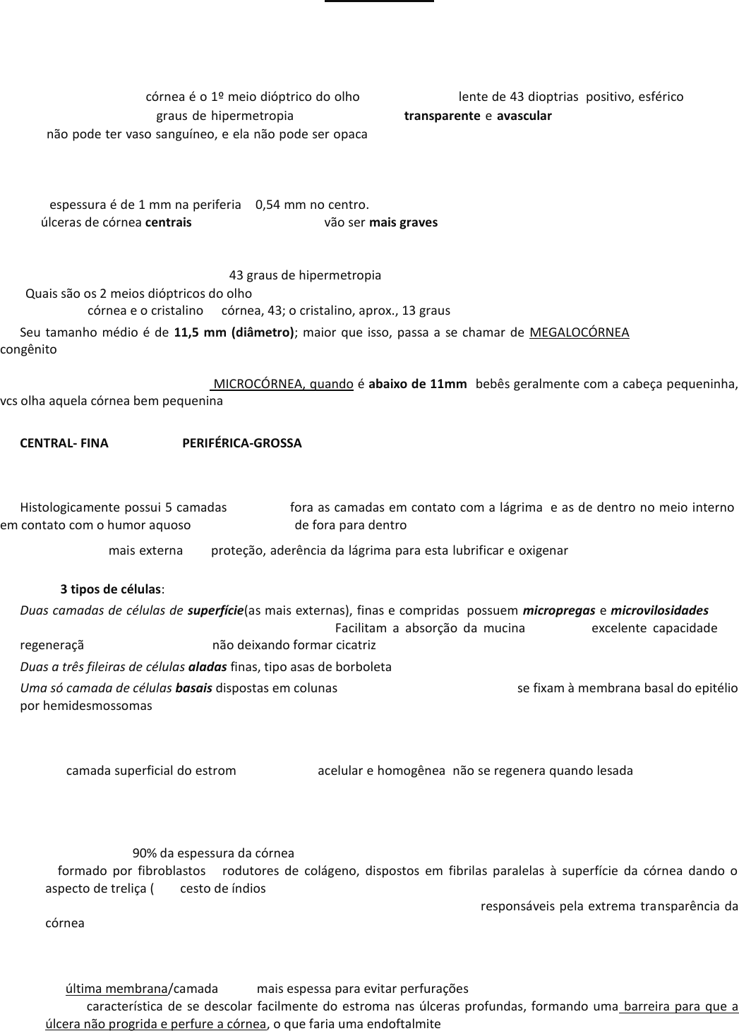 CÓRNEA Adaptação por Alexandre Baldissera e Carolina Pegoraro ATM20/129 A) CONCEITO Já sabemos que córnea é o 1º meio dióptrico do olho, equivale a uma lente de 43 dioptrias, positivo, esférico. Ou seja, só a nossa córnea tem 43 graus de hipermetropia. Ela é totalmente transparente e avascular, para que ela desenvolva a sua função, não pode ter vaso sanguíneo, e ela não pode ser opaca, caso contrários os raios luminosos não chegariam até a retina, como deveriam. B) TAMANHO Sua espessura é de 1 mm na periferia e 0,54 mm no centro. Esse dado é importante, porque todas as alterações corneanas, as úlceras de córnea centrais, por exemplo, sempre vão ser mais graves, visto que a córnea é menos espessa no centro, tem meio milímetro! Já na periferia, tem 1 mm de espessura. Essa estrutura fininha, central, tem 43 graus de hipermetropia. Quais são os 2 meios dióptricos do olho? o A córnea e o cristalino. A córnea, 43; o cristalino, aprox., 13 graus. Seu tamanho médio é de 11,5 mm (diâmetro); maior que isso, passa a se chamar de MEGALOCÓRNEA (ex.: no glaucoma congênito, no qual o bebê nasce com uma grande córnea, com limites córneo-escleral imprecisos, pois fica meio azulado, então certamente verão o olho daquele bebê e dirão “essa crianças tem um glaucoma congênito”), a megalocórnea é quando o diâmetro é acima de 12,5 mm, e de MICROCÓRNEA, quando é abaixo de 11mm (bebês geralmente com a cabeça pequeninha, vcs olha aquela córnea bem pequenina, com um monte de esclera na volta, muito branco; geralmente são sindrômicas). CENTRAL- FINA PERIFÉRICA-GROSSA C) ANATOMIA Histologicamente possui 5 camadas, sendo as fora as camadas em contato com a lágrima, e as de dentro no meio interno, em contato com o humor aquoso. São as seguintes de fora para dentro: 1- Epitélio: é a mais externa, faz proteção, aderência da lágrima para esta lubrificar e oxigenar, caso contrário o olho ficaria seco, vermelho. Possui 3 tipos de células: ● Duas camadas de células de superfície(as mais externas), finas e compridas, possuem micropregas e microvilosidades para que a lágrima fique aderida na córnea, no epitélio. Facilitam a absorção da mucina. Elas têm excelente capacidade de regeneração (que é muito veloz), não deixando formar cicatriz (o que causaria borramento da visão); ● Duas a três fileiras de células aladas finas, tipo asas de borboleta. ● Uma só camada de células basais dispostas em colunas, uma do ladinho da outra, que se fixam à membrana basal do epitélio por hemidesmossomas. Essa membrana basal é a 1ª membrana que vai fazer a defesa do nosso olho. 2- Membrana de Bowman: É a camada superficial do estroma, totalmente acelular e homogênea, não se regenera quando lesada. Então, vai causar uma opacidade na córnea se for lesada! 3-Estroma Corresponde a 90% da espessura da córnea. É formado por fibroblastos, produtores de colágeno, dispostos em fibrilas paralelas à superfície da córnea dando o aspecto de treliça (tipo cesto de índios). Acredita-se que os aspectos de treliça e desinchado do estroma sejam os responsáveis pela extrema transparência da córnea. 4- Membrana de Descemet É a última membrana/camada que é mais espessa para evitar perfurações, é transparente e elástica. Tem a característica de se descolar facilmente do estroma nas úlceras profundas, formando uma barreira para que a úlcera não progrida e perfure a córnea, o que faria uma endoftalmite. Alexandre Baldissera Realce Alexandre Baldissera Realce Alexandre Baldissera Realce Alexandre Baldissera Realce Alexandre Baldissera Realce Alexandre Baldissera Realce Alexandre Baldissera Realce Alexandre Baldissera Realce Alexandre Baldissera Realce Alexandre Baldissera Realce Alexandre Baldissera Realce Alexandre Baldissera Realce Alexandre Baldissera Realce Alexandre Baldissera Realce Alexandre Baldissera Realce Alexandre Baldissera Realce Alexandre Baldissera Realce Alexandre Baldissera Realce Alexandre Baldissera Realce Alexandre Baldissera Realce Alexandre Baldissera Realce Alexandre Baldissera Realce Alexandre Baldissera Realce Alexandre Baldissera Realce Alexandre Baldissera Realce Alexandre Baldissera Realce Alexandre Baldissera Realce Alexandre Baldissera Realce Alexandre Baldissera Realce Alexandre Baldissera Realce Alexandre Baldissera Realce Alexandre Baldissera Realce Alexandre Baldissera Realce Alexandre Baldissera Realce Alexandre Baldissera Realce Alexandre Baldissera Realce Alexandre Baldissera Realce Alexandre Baldissera Realce Alexandre Baldissera Realce Alexandre Baldissera Realce Alexandre Baldissera Realce Alexandre Baldissera Realce Alexandre Baldissera Realce Alexandre Baldissera Realce Alexandre Baldissera Realce Alexandre Baldissera Realce Alexandre Baldissera Realce Alexandre Baldissera Realce Alexandre Baldissera Realce Alexandre Baldissera Caixa de texto EBEDE Essas membranas citadas evitam endoftalmites uma vez que protegem contra úlceras que entrem para dentro das câmaras. Se a ulcera de córnea chegar em Descemet, ela se desprende e protege as demais estruturas. 5- Endotélio Possui uma só camada de células hexagonais (cerca de 500 mil céls), elas são banhadas pelo humor aquoso (HÁ); não se regeneram, quando o fazem é por crescimento amitótico, que não resolve nada, aliás só piora a situação. Essas céls do endotélio têm papel vital na manutenção da deturgescência da córnea (deturgência é o estado de relativa de desidratação da córnea). Como se faz a cirurgia de catarata? Tu deixas a cápsula do cristalino, mas tira o núcleo dele, poe então uma lente intraocular no local do núcleo do cristalino; o ideal seria que todos pcts que fossem fazer cirurgia da catarata, fizessem a paquimetria ultrassônica (ela conta quantas céls tem esse endotélio); depois da cirurgia, se o pct começar – 6 meses depois – a ficar com olho vermelho, doloroso, vê-se que a córnea não está tão tr