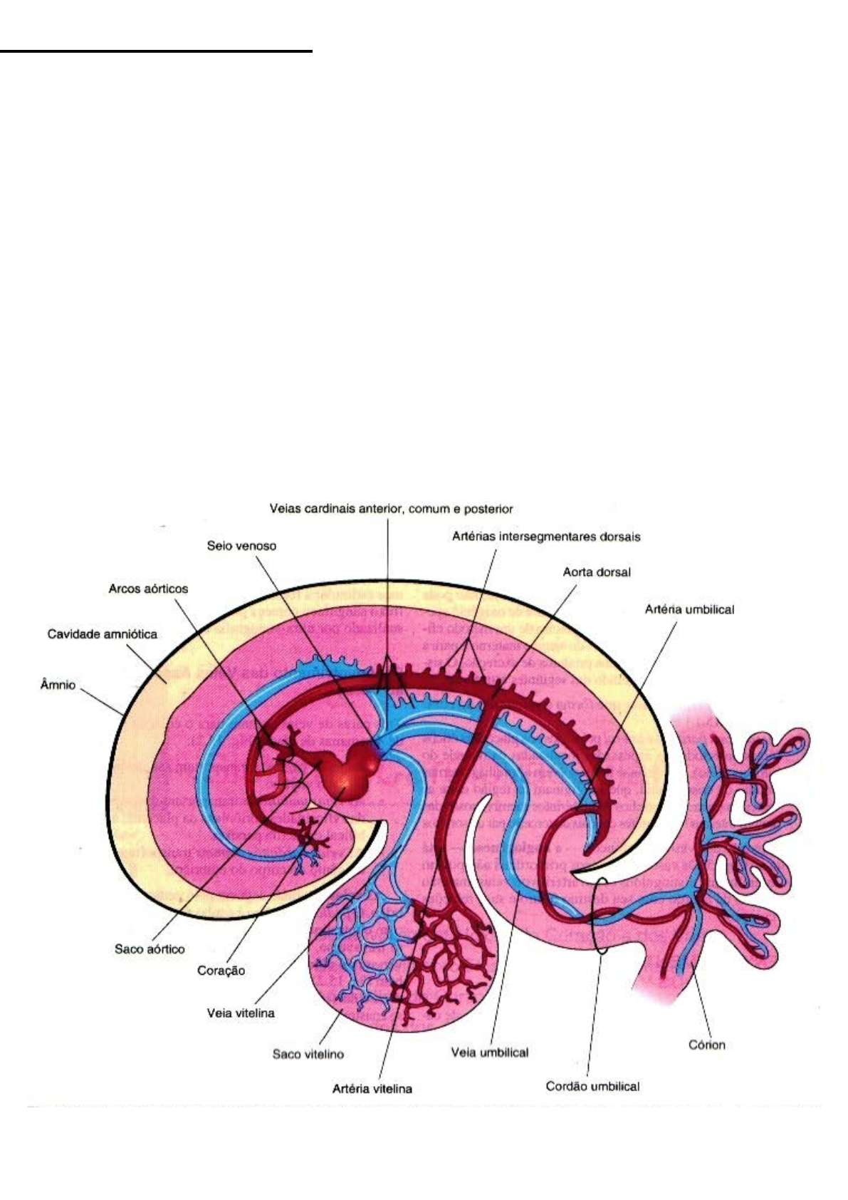 Talita B. ValenteEMBRIOLOGIA Talita B. ValenteEMBRIOLOGIA SISTEMA CARDIOVASCULAR • Primeiro grande sistema a funcionar no embrião • O coração primitivo e o sistema vascular aparecem em meados da terceira semana. • O coração começa a funcionar no início da quarta semana pois há uma necessidade maior de oxigênio e nutrientes, além de remoção de dióxido de carbono e restos metabólicos. • Derivado principalmente do mesoderma esplâncnico. • A vasculogênese ocorre no início da terceira semana a partir de células mesenquimais que se diferenciam em precursoras de células endoteliais - os angiobastos. Essas células se agregam e formam as ilhotas sangüíneas. Os vasos avançam por brotamento endotelial e se fundem com outros vasos - angiogênese. • O primeiro indício do coração é o aparecimento de um par de cordões endoteliais - cordões angioblásticos - durante a terceira semana. Esses cordões se canalizam para formar os tubos cardíacos, os quais se fundem no final da 3ª semana para formam o coração tubular. • O coração começa a bater entre o 22º e o 23º dia. • Os batimentos cardíacos embrionários podem ser detectados por ultra-sonografia doppler por volta da 5ª semana. Talita B. ValenteEMBRIOLOGIA Talita B. ValenteEMBRIOLOGIA DESENVOLVIMENTO DAS VEIAS ASSOCIADAS AO CORAÇÃO 3 pares de veias drenam para o coração tubular de um embrião de 4 semanas. 1. Veias Vitelínicas • Levam o sangue pouco oxigenado a partir do saco vitelino. • O pedículo vitelínico é um tubo estreito que liga o saco vitelino ao intestino médio. • Após passar através do septo transverso, as veias vitelínicas entram na extremidade venosa do coração – o seio venoso. • Como o primórdio hepático cresce para o septo transverso, as veias vitelínicas originam as veias hepáticas e o sistema porta. 2. Veias Umbilicais • Levam sangue oxigenado a partir da placenta • Ocorrem em cada lado do fígado e transportam o sangue oxigenado da placenta para o seio venoso. • Com o desenvolvimento do fígado, perdem as suas conexões com o coração e deságuam no fígado. • Um grande desvio venoso – o ducto venoso – se desenvolve no interior do fígado e conecta a veia umbilical com a veia cava inferior. • Os derivados das veias umbilicais involuem após o nascimento. 3. Veias Cardinais • Levam sangue pouco oxigenado a partir do corpo do embrião. • Principal sistema de drenagem do embrião. • As veias cardinais anteriores e posteriores drenam, respectivamente, as regiões cefálica e caudal do embrião. Essas se juntam às veias cardinais comuns que entram no seio venoso. • Essas veias se desenvolvem no embrião formando o sistema cava (veia cava superior e veia cava inferior). ARCOS AÓRTICOS E RAMOS DA AORTA DORSAL • Quando os arcos faríngeos se formam durante a 4ª e 5ª semanas, são supridos por artérias – os arcos aórticos – que se originam do saco aórtico e terminam na aorta dorsal. Artérias intersegmentares = Cerca de 30 ramos da aorta dorsal que passam entre os somitos e seus derivados. - Na região cervical: par de artérias vertebrais. - Na região torácica: artérias intercostais. - Na região lombar: artéria lombares. O 5º par de artérias intersegmentares lombares permanece como as artérias ilíacas comuns. - Na região sacral: artérias sacrais laterais e mediana. ARTÉRIAS VITELÍNICAS • Passam para o saco vitelino e, mais tarde, para o intestino primitivo. • Dão origem a 3 importantes artérias: Talita B. ValenteEMBRIOLOGIA Talita B. ValenteEMBRIOLOGIA 1. Tronco celíaco para o intestino anterior. 2. Artéria mesentérica superior para o intestino médio. 3. Artéria mesentérica inferior para o intestino posterior. ARTÉRIAS UMBILICAIS • Passam pelo cordão umbilical. • A artéria umbilical transporta sangue pouco oxigenado para a placenta. DESENVOLVIMENTO DO CORAÇÃO • Quando os tubos cardíacos se fundem, uma camada externa do coração embrionário – o miocárdio primitivo – é formado do mesoderma esplâncnico. • Entre o delgado tubo endotelial e o espesso tecido muscular existe a geleia cardíaca (tecido conjuntivo gelatinoso). • Quando ocorre o dobramento da região cefálica, o coração e a cavidade pericárdica passam a se localizar ventralmente ao intestino anterior e caudalmente à membrana bucofaríngea. Talita B. ValenteEMBRIOLOGIA Talita B. ValenteEMBRIOLOGIA • O coração tubular se alonga e desenvolve algumas estruturas: 1. Tronco arterial: contínuo cranialmente com o saco aórtico, do qual se originam os arcos aórticos. É a extremidade arterial do coração, fixada pelos arcos faríngeos. 2. Seio venoso: recebe as veias umbilicais, vitelínicas e cardinaiscomuns. É a extremidade venosa do coração, fixada pelo septo transverso. 3. Bulbo cardíaco: na extremidade arterial, de onde sai o sangue para o tronco arterial. 4. Ventrículo primitivo: porção central. 5. Átrio primitivo: na extremidade venosa, junto ao seio venoso, por onde chega o sangue oxigenado. • Por causa do crescimento mais rápido do bulbo cardíaco e do ventrículo em relação às outras regiões, o coração se dobra sobre si próprio, formando uma alça bulboventricular em forma de U. • Como o coração primitivo se curva, o átrio e seio venoso passam a se localizar dorsalmente às regiões do tronco arterial, do bulbo cardíaco e do ventrículo. • Nesse estágio, o seio venoso já desenvolveu expansões laterais, os cornos direito e esquerdo do seio venoso. Talita B. ValenteEMBRIOLOGIA Talita B. ValenteEMBRIOLOGIA SEPTAÇÃO DO CORAÇÃO PRIMITIVO • Ocorre concomitantemente no átrio e ventrículo a partir da metade da 4ª semana e está completa no final da 5ª semana. Septação do Canal Atrioventricular (AV) • No final da 4ª semana, os coxins endocárdicos se formam nas paredes dorsal e ventral do canal atrioventricular, a partir da geleia cardíaca. • Os coxins se aproximam e se 