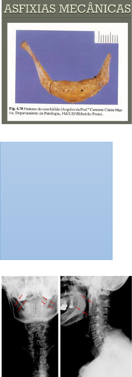 PESCOÇO É a área de transição entre a base do crânio superiormente e as clavículas inferiormente. Une a cabeça ao tronco e aos membros, atuando como importante conduto entre eles. Pode onde passam as estruturas. · No pescoço localizam-se órgãos importantes com funções específicas como a laringe, glândulas tiroide e paratireoide, por exemplo. · É uma região bem conhecida de vulnerabilidade, sendo várias estruturas vitais localizados nesta desprovidas de proteção óssea. · Aa. carótidas e Vv. jugulares dispõem-se anterolateralmente no pescoço e são as principais estruturas lesadas em feridas no pescoço por instrumentos penetrantes. Os plexos braquiais originam-se no pescoço e seguem inferolateralmente para entrar nas axilas e continuam até os membros superiores. · É dividido em trígonos anterior, lateral e posterior · A linfa da cabeça e pescoço drena para os lnn. cervicais Ossos do pescoço · Hioide, 7 vértebras cervicais, manúbrio do esterno e clavículas. · As articulações craniovertebrais superiormente proporcionam a flexibilidade necessária para o posicionamento da cabeça. · Os processos transversos de todas as vértebras cervicais (típicas ou atípicas) incluem forames transversários para os vasos vertebrais (as veias vertebrais e, com exceção de C VII, as artérias vertebrais) · O osso hioide é anterior a coluna cervical e é fixado por Mm. supra-hióideos e infra-hióideos, além de ligamentos (ex: estilo-hióideos) A fratura do hioide (ou dos processos estiloides do temporal) ocorre em pessoas estranguladas com as mãos por compressão da parte oral da faringe, o que resulta em afundamento do corpo do osso sobre a cartilagem tireóidea. A incapacidade de elevar o hioide e de movimentá-lo anteriormente sob a língua dificulta a deglutição e a manutenção da separação dos sistemas digestório e respiratório, o que pode resultar em pneumonia por aspiração. Síndrome de Eagle · Calcificação do lig. estilo-hioideo Fáscia do pescoço · As estruturas do pescoço são circundadas por uma tela subcutânea na qual está presente o M. platisma, também chamada de fáscia superficial. É uma continuação do SMAS (sistema músculo aponeurótico superficial) e nela estão contidos plexo cervical, V. jugular externa, vasos linfáticos e linfonodos superficiais. · O M. platisma cobre a face anterolateral do pescoço, suas fibras divergem inferiormente deixando uma abertura anterior à laringe e traqueia. · É inervado pelo NC VII. · A V. jugular externa e os principais nervos cutâneos do pescoço situam-se profundamente a ele. · Abaixa os ângulos da boca e alarga-a como em expressões de tristeza e medo; levanta a pele do pescoço quando os dentes são cerrados; alarga o pescoço Fáscia cervical · Possui 3 lâminas que sustentam as vísceras cervicais, músculos, vasos e linfonodos profundos: superficial, pré-traqueal e pré-vertebral · As fáscias formam planos de clivagem naturais através dos quais os tecidos podem ser separados durante a cirurgia, limitam a disseminação de infecções (colágeno tipo I), permitem o deslizamento de estruturas no pescoço e a deglutição · A lâmina superficial da fáscia cervical delimita as estruturas superficiais e profundas do pescoço, circundado todo o pescoço profundamente à pele e à tela subcutânea. · Envolve músculos trapézio e esternocleidomastóideo que são inervados pelo NC XI · Imediatamente abaixo de sua fixação na mandíbula, essa lâmina se divide para envolver a Glând. submandibular e posteriormente à mandíbula, divide-se para formar a capsula fibrosa da Glând. parótida. · O ligg. Estilomandibular é um espessamento dessa lâmina. · Continua-se posteriormente com o ligg. Nucal · Na parte inferior, entre as cabeças esternais dos Mm. ECM, imediatamente superior ao manúbrio essa lâmina permanece dividida e se fixa na face anterior e posterior do manúbrio formando um espaço supraesternal (de Burns) que envolve as extremidades inferiores das veias jugulares anteriorese, o arco venoso jugular, gordura e alguns lnn. profundos . · A lâmina pré-traqueal da fáscia cervical é limitada à parte anterior do pescoço e se divide em: parte muscular, envolve os músculos infra-hióideos; parte visceral, envolve tireoide, traqueia, esôfago e se continua com a fáscia bucofaríngea, também se funde lateralmente com a bainha carótica. · Superiormente ao hioide um espessamento dessa lâmina forma uma tróclea, através da qual passa o tendão intermédio do M. digástrico, suspendendo o hioide. · Funde-se ao pericárdio fibroso que reveste o coração · A lâmina pré-vertebral limita-se à parte posterior do pescoço e forma uma bainha tubular para a coluna vertebral e os músculos associados, como o longo do pescoço e o longo da cabeça anteriormente, escalenos lateralmente, e profundos do pescoço posteriormente. · Funde-se à fáscia endotorácica na região periférica e ao ligg. longitudinal anterior na região central, aproximadamente em T III. · Estende-se lateralmente como a bainha axilar que envolve vasos axilares e plexo braquial. · Partes cervicais dos troncos simpáticos estão incrustradas na lâm. pré-vertebral · A bainha carótica se estende da base do crânio até a raiz do pescoço. Funde-se na parte anterior, às lâminas superficial e pré-traqueal da fáscia cervical e, na parte posterior, à lâmina pré-vertebral da fáscia. Conteúdo: · Aa. carótidas comum e interna · V. jugular interna · NC X · Lnn. cervicais profundos · N. do seio carótico · Fibras nervosas simpáticas (plexos periarteriais caróticos) A bainha carótica e a fáscia pré-traqueal comunicam-se livremente com o mediastino e com a cavidade do crânio, representando possíveis vias de disseminação de infecções e de sangue extravasado. · O espaço retrofaríngeo, constituído de tec. conj. frouxo, situa-se entre a fáscia bucofaríngea e a lâmi