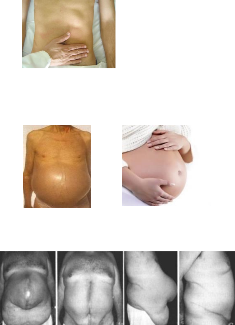 Tipos de abdome – Semiologia Abdome atípico ou normal Sua principal característica é a simetria. Abdome globoso ou protuberante Amplamente aumentado no sentido póstero-anterior. Pode ser encontrado em pessoas com ascite, obesas ou gravidas. Abdome em avental Encontrado em pessoas com grau de obesidade elevado. Nesse tipo de abdome, a gordura recai sobre os membros inferiores. Abdome em ventre batráquio Observa-se um franco predomínio do diâmetro transversal sobre o anteroposterior. Observado em ascite. Abdome escavado Parede abdominal nitidamente retraída. É próprio de pessoas muito magras. Abdome pendular ou ptótico Nota-se quando o paciente está em pé que as vísceras pressionam a parte inferior da parede abdominal, produzindo nesse local uma protrusão. Dentre as causas, tem-se a flacidez no período puerperal e pessoas pós bariátrica.