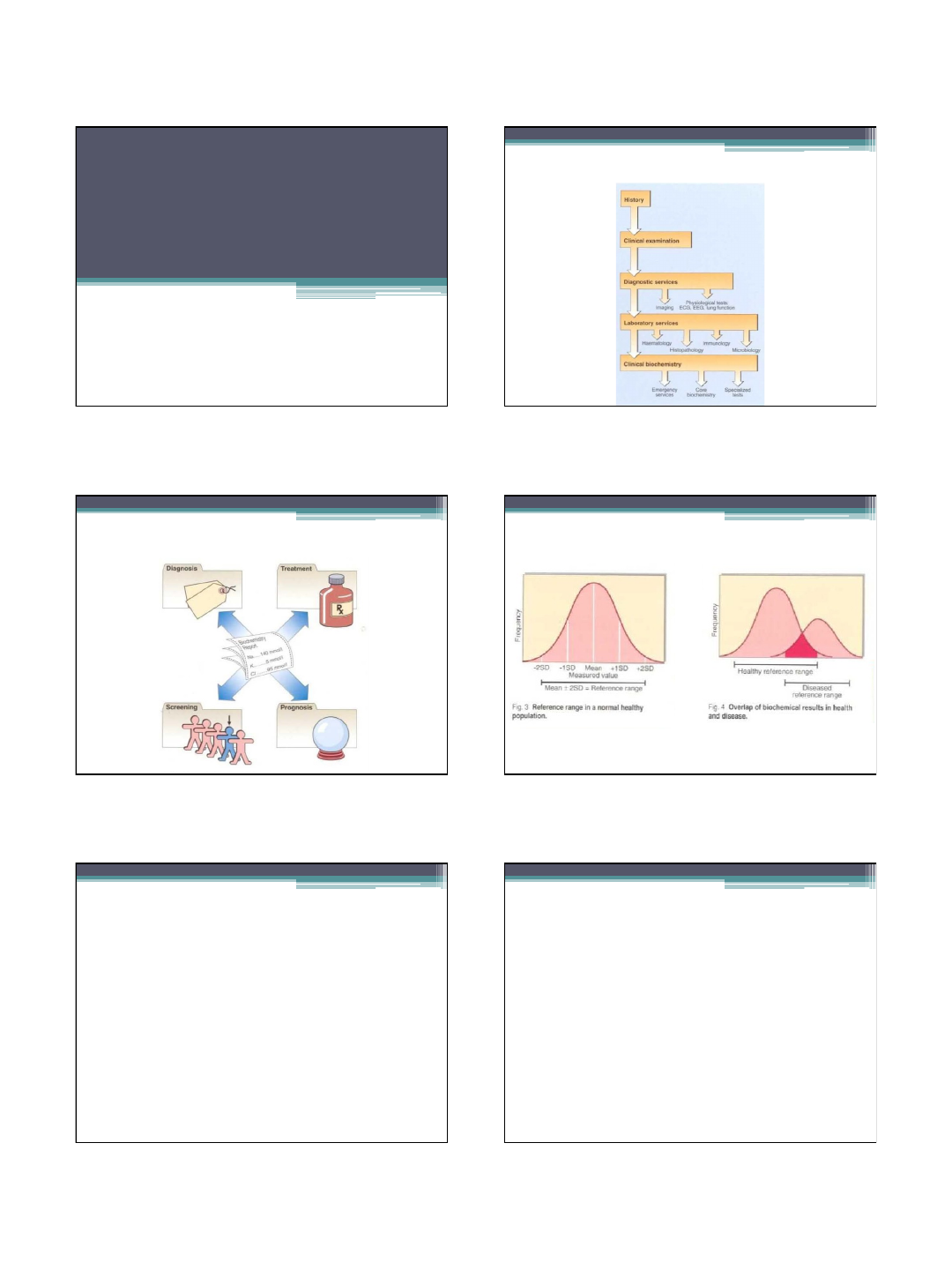 10/09/18 1 Interpretação de Exames Laboratoriais Prof Ms Yara Lúcia Marques Maia O Laboratório Clínico na Medicina Como os Testes são Usados Valores de Referência Valores de Referência • Individuais; • São nossa “Carteira de Identidade” biológica; • Variações refletem alterações metabólicas; • Varações mesmo dentro dos limites de referência podem ser significativos; • Importância do profissional de saúde na área da estética. Exames Laboratoriais • Não existe fórmula mágica; • Conhecimento de bioquímica, fisiologia e fisiopatologia; • Observação das alterações de pele, cabelo, unhas, aparência geral da pessoa; • D i e t a e n u t r i ç ã o p o d e m a l t e r a r significativamente tanto os resultados como o curso de um estado metabólico/patológico. • Ex: ômega 3 10/09/18 2 Princípios Gerais • A maioria das enzimas é compartimentalizada (intracelular); • Exceção feita aos fatores da coagulação sanguínea e às lipoproteínas lipases; • As enzimas celulares só aparecem no sangue em quantidades expressivas quando ocorre lesão celular; Enzimas Teciduais no Sangue Localização Celular das Enzimas GLDH LDH ALT AST MDH Enzimas uniloculares Enzimas biloculares Liberação de Enzimas Após Dano Celular Leve Liberação de Enzimas Após Dano Celular Acentuado Princípios Diagnósticos • Enzimas podem ter origem em um ou mais tecidos (isoenzimas); • As elevações nos níveis séricos de uma enzima, que é variável em sua distribuição, dá uma indicação menos específica do sítio do dano; 10/09/18 3 Princípios Diagnósticos • Os níveis séricos das enzimas glicolíticas e outras associadas a doenças neoplásicas, parecem refletir a massa total do tumor; • Níveis anormalmente baixos podem também ser observados, como resultado de síntese diminuída; • Algumas proteínas também apresentam uti l idade diagnóstica. Ex: trasferrina, cerulosplamina, ferritina. Enzimas: Um Arsenal para Auxílio Diagnóstico • Parâmetros gerais para utilização: ▫ Localização orgânica interfere na utilização: enzimas celulares X enzimas plasmáticas; ▫ Órgão-inespecificidade das enzimas: � Constituição dos perfis enzimáticos; ▫ Meia-vida plasmática; ▫ Interferências medicamentosas. Dificuldades Analíticas • A hemólise pode estar associada com liberação no soro das enzimas das hemácias; • Efeitos adversos dos anticoagulantes; o soro portanto é a amostra preferida; • O soro lipêmico pode resultar em leituras variáveis de absorbâncias; • A maioria tem estabilidade a 6ºC por 24 horas; A Interpretação dos Resultados • Como os resultados bioquímicos são expressos; • Variações nos resultados. Metabolismo da Glicose e Diabetes Mellitus Diagnóstico do Diabetes Mellitus 10/09/18 4 Triagem dos Pacientes Glicemia aleatória - 190 mg/dL Glicemia em jejum 100 e 125 mg/dL TOTG Classes Intermediárias no Grau de Tolerância à Glicose • São estados intermediários entre a homeostase normal da glicose e o DM; • Glicemia de jejum alterada - concentrações de glicemia de jejum inferiores ao critério diagnóstico para DM, porém mais elevadas que o valor de referência normal; • Tolerância à glicose diminuída - representa uma anormalidade na regulação da glicose no estado pós-sobrecarga Critérios diagnósticos • Glicose plasmática de jejum (8 horas) • Glicose plasmática de 2h de sobrecarga oral de 75g de glicose (TOTG) • Medida da glicose plasmática casual Obs: A medida da hemoglobina glicada não deve ser usada para o diagnóstico do diabetes, somente para acompanhamento. Exame de glicemia no sangue • Como fazer o exame? ▫ Glicosímetro ▫ Glucowatch ▫ Sensor subcutâneo • Importância ▫ Visualizar tratamento ▫ Noção da influência do estresse, exercício e alimentação nos resultados 10/09/18 5 TESTES PARA AVALIAR O CONTROLE GLICÊMICO Testes de Glicemia (jejum e Glic capilar) Testes de A1c Mostram o Nível Glicêmico Instantâneo no Momento do Teste Mostram a Glicemia MÉDIA Pregressa dos Últimos 2 a 3 Meses 1 mês antes 2 meses antes 3 meses antes 4 meses antes 50% 25% 25% Impacto da Glicemia Média Mensal sobre o Nível de A1c ⎬ Frutosamina: glicemia média dos 15 últimos dias. DCCT, Diabetes DCCT, Diabetes ControlControl and and ComplicationsComplications Tr ialTr ial .. 1. Adaptado de 1. Adaptado de SkylerSkyler JS. JS. EndocrinolEndocrinol MetabMetab ClinClin NorthNorth Am. Am. 1996;25:243-254.1996;25:243-254. 2. DCCT. 2. DCCT. N N EnglEngl J J MedMed.. 1993;329:977-986. 1993;329:977-986. 3. DCCT. 3. DCCT. DiabetesDiabetes. 1995;44:968-983.. 1995;44:968-983. R is co R el at iv o R is co R el at iv o A1c(%)A1c(%) 1515 1313 1111 99 77 55 33 11 66 77 88 99 1010 1111 1212 A1C e Risco Relativo de ComplicaçõesA1C e Risco Relativo de Complicações MicrovascularesMicrovasculares: DCCT: DCCT (Diabetes Control and Complications Trial - 1993) RetinopatiaRetinopatia Nefropatia Nefropatia NeuropatiaNeuropatia MicroalbuminúriaMicroalbuminúria 2020 Exames de Acompanhamento • Frutosamina ▫ Glicose + grupo amino do AA lisina da albumina ▫ Parâmetro de controle metabólico � 1-2 semanas anteriores ▫ Método alternativo para avaliar o controle glicêmico dos portadores de hemoglobinopatias Exame de glicose na urina • Características ▫ Taxa de glicose não tão acurada quanto a do sangue ▫ Fácil realização e baixo custo • Limitações ▫ Não considera a glicose sanguínea ▫ Sofre variação com o volume de urina ▫ Índices avaliados exorbitantes Exames de cetonas na urina • Quando fazer? ▫ Glicemia > 300mg/dl ▫ Náusea, vômitos e dores abdominais ▫ Sede e pele avermelhada ▫ Cansaço, dificuldade na respiração ▫ Hálito com odor de fruta • Precauções!!! ▫ Exames falsamente positivos ▫ Exames falsamente negativos Um sinal precoce de ocorrência de nefropatia é o aumento da albumina urinária. Controle gli