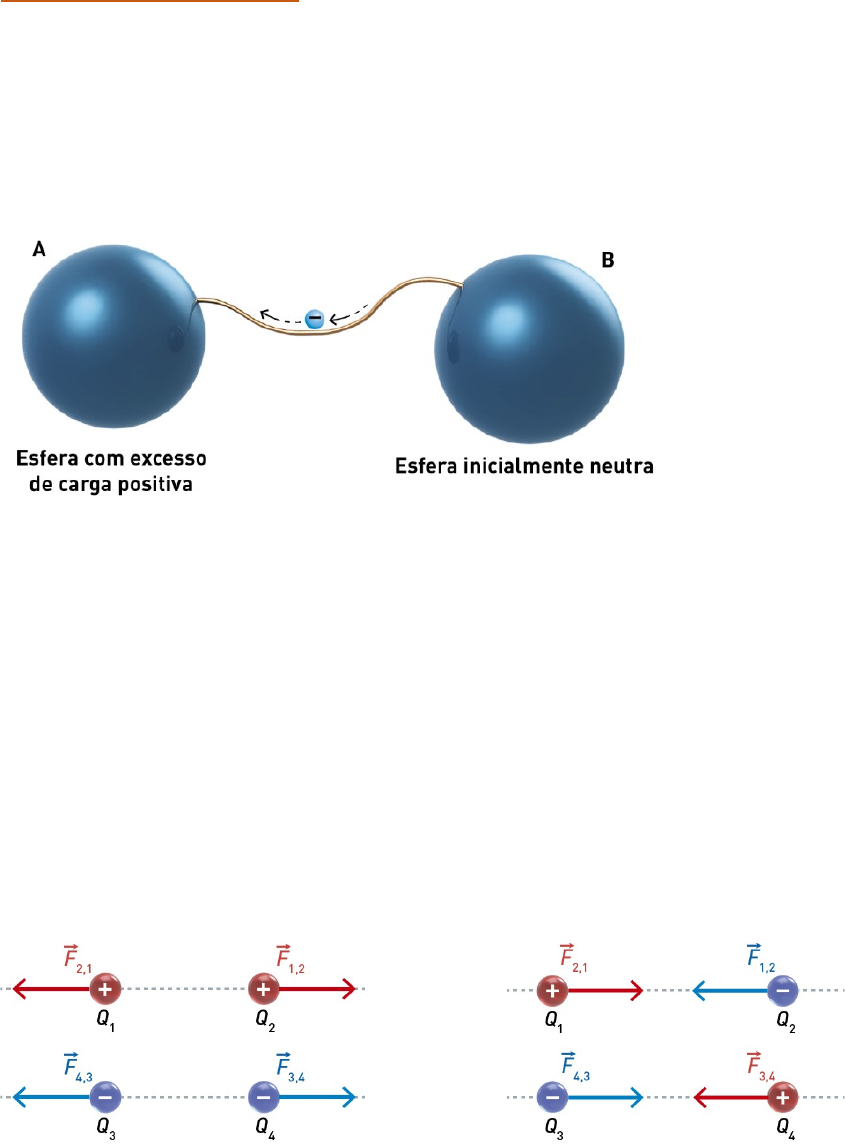 FQ 2.3. Campo elétrico Campos carregados eletricamente Os átomos são partículas eletricamente neutras. Mas acontece que podem perder ou ganhar eletrões, dando origem a partículas com carga elétrica positiva ou negativa devido à transferência de eletrões. Lei da Conservação da Carga Elétrica Num sistema isolado, se um corpo cede eletrões, outro recebe-os, pelo que a carga total do sistema permanece constante. A unidade S.I de carga elétrica é o Coulomb, C. O módulo da carga elétrica é sempre um múltiplo da carga do protão, que é designada carga elementar. Interação entre cargas elétricas As cargas elétricas interagem entre si à distância, repelindo-se se tiverem o mesmo sinal e atraindo-se se tiverem sinais contrários. Campo elétrico Um campo elétrico tem origem em cargas elétricas. Consideremos uma carga elétrica pontual e positiva, Q, colocada num dado ponto do espaço. Esta carga elétrica Q (carga criadora) cria à sua volta um campo elétrico, , pois, se colocarmos num outro ponto do espaço à sua volta uma outra partícula com carga elétrica positiva, q (carga de prova), esta fica sujeita a uma força elétrica, , repulsiva por parte da carga elétrica Q, cuja intensidade diminui à medida que a distância entre as cargas aumenta. Para caracterizar a ação elétrica de uma carga criadora Q, independentemente de uma carga de prova q, define-se campo elétrico, , como sendo a força que atua numa carga elétrica unitária positiva, q = +1 C (carga de prova), em que a ação elétrica se faz sentir. ou A unidade S.I do campo elétrico é o volt por metro, , que corresponde a um Newton por Coulomb, O campo elétrico criado por uma carga pontual (positiva ou negativa) num dado ponto: · é tanto mais intenso quanto maior for o módulo da carga criadora, Q; · é tanto mais intenso quanto menor for a distância do ponto à carga criadora, Q; · apresenta simetria esférica, isto é, tem a mesma intensidade a igual distância da carga; · é centrifugo se a carga criadora do campo for positiva () e centrípeto, se a carga criadora do campo for negativa (). O campo elétrico pode ser representado por linhas de campo. As linhas de campo são linhas imaginárias sempre tangentes ao campo elétrico, , em cada ponto, que indicam a direção e o sentido do campo elétrico, . Nas zonas onde as linhas de campo apresentam maior densidade (ficam mais juntas), o campo elétrico é mais intenso. As linhas de campo do campo elétrico criado por uma ou mais cargas: · São sempre tangentes, em cada ponto, ao campo elétrico e indicam a direção e o sentido do campo. · Partem de cargas positivas e terminam em cargas negativas. · Apresentam maior densidade nas zonas onde o campo é mais intenso. · Nunca se cruzam. O campo elétrico criado num ponto do espaço por duas cargas elétricas, e , é igual à soma vetorial dos campos elétricos criados npor cada uma das cargas elétricas. Alguns exemplos: Campo elétrico uniforme O campo elétrico, , diz-se uniforme, numa dada região do espaço, se for constante, isto é, se tiver o mesmo módulo, a mesma direção e o mesmo sentido em todos os pontos dessa região do espaço. Num campo elétrico uniforme as linhas de campo são paralelas e equidistantes entre si, pois o campo elétrico é constante. Uma carga elétrica colocada num dado ponto de um campo elétrico fica sujeita a uma força elétrica, tal que: A força elétrica que atua numa carga pontual q colocada num campo elétrico tem: · sempre a direção do campo elétrico; · o sentido do campo elétrico se a carga pontual colocada nesse ponto for positiva; · o sentido oposto ao do campo elétrico se a carga pontual colocada nesse ponto for negativa. 2.4. Campo magnético Campo magnético criado por um íman Um íman cria à sua volta um campo magnético. Os ímanes têm dois polos – o polo norte e o polo sul - na vizinhança dos quais a força magnética é mais intensa. Não existem polos magnéticos isolados - estes ocorrem sempre aos pares. Por exemplo, se um magnete se partir em dois, cada pedaço fica com um polo norte e um polo sul. Obtém-se, assim, desta divisão, novos ímanes mais pequenos. Dois ímanes exercem forças entre si: -forças de atração entre polos magnéticos diferentes; -forças de repulsão entre polos magnéticos iguais. Dizemos que existe um campo magnético, , grandeza vetorial, numa região do espaço, quando nessa região se faz sentir uma ação magnética que se manifesta através de forças magnéticas de atração ou de repulsão sobre os polos magnéticos de ímanes aí colocados. O campo magnético num dado ponto em volta de um íman criador do campo, é tanto mais intenso quanto maior for a força magnética (atrativa ou repulsiva) exercida sobre um outro íman colocado nesse ponto. A unidade S.I do campo magnético é o Tesla, T. Linhas de campo -São sempre tangentes, em cada ponto, ao campo magnético e indicam a direção e o sentido deste. -Orientam-se do polo norte do íman para o polo sul do mesmo. -Apresentam maior densidade nas zonas onde o campo magnético é mais intenso. -Nunca se cruzam. As linhas de campo podem ser visualizadas com limalhas de ferro ou pequenas bússolas. O conjunto das linhas de campo constitui o espetro do campo magnético criado pelo íman. No caso de um íman em U, o campo magnético entre as armaduras do íman é uniforme (exceto nas extremidades). Há uma zona entre as armaduras onde as linhas de campo são segmentos de reta paralelos igualmente espaçados, o que significa que aí o campo magnético é uniforme ( = constante). Campo magnético criado por uma corrente elétrica A experiência de Oersted constituiu a primeira prova experimental da ligação entre eletricidade e magnetismo. · Campo magnético criado por uma corrente elétrica num fio condutor longo e retilíneo A intensidade do campo magnético, num ponto, depende da corrente elétrica e da distância do ponto ao fio c
