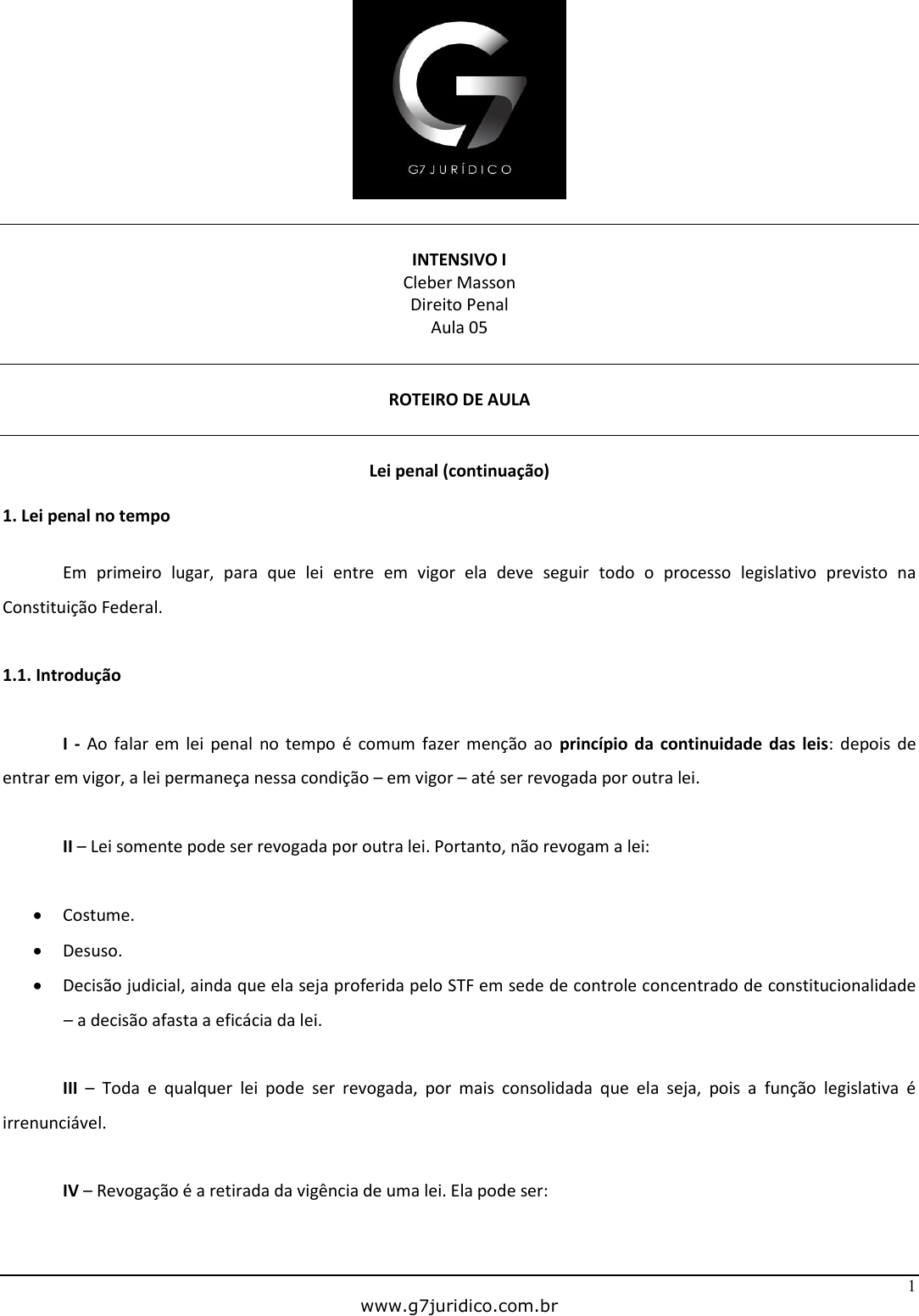 1 www.g7juridico.com.br INTENSIVO I Cleber Masson Direito Penal Aula 05 ROTEIRO DE AULA Lei penal (continuação) 1. Lei penal no tempo Em primeiro lugar, para que lei entre em vigor ela deve seguir todo o processo legislativo previsto na Constituição Federal. 1.1. Introdução I - Ao falar em lei penal no tempo é comum fazer menção ao princípio da continuidade das leis: depois de entrar em vigor, a lei permaneça nessa condição – em vigor – até ser revogada por outra lei. II – Lei somente pode ser revogada por outra lei. Portanto, não revogam a lei: • Costume. • Desuso. • Decisão judicial, ainda que ela seja proferida pelo STF em sede de controle concentrado de constitucionalidade – a decisão afasta a eficácia da lei. III – Toda e qualquer lei pode ser revogada, por mais consolidada que ela seja, pois a função legislativa é irrenunciável. IV – Revogação é a retirada da vigência de uma lei. Ela pode ser: 2 www.g7juridico.com.br • Total (ab-rogação). • Parcial (derrogação). 1.2. Conflito de leis penais no tempo: Direito Penal intertemporal I – Conflito de leis penais no tempo é a situação verificada quando uma nova lei penal entra em vigor, revogando a lei anterior. Em outras palavras, verifica-se na hipótese de sucessão de leis penais ao longo do tempo. II – Direito Penal Intertemporal são as regras e os princípios que solucionam o conflito de leis penais no tempo: • Regra geral: “tempus regit actum” (o tempo rege o ato). Portanto, no conflito de leis penais no tempo aplica-se a lei que estava em vigor na data em que o fato foi praticado. • Exceção: lei penal benéfica (lei penal favorável ao réu). A lei penal benéfica é dotada de extratividade. Extratividade é o gênero, no qual se encaixam: • Retroatividade: aplicação para o passado. • Ultratividade: aplicação para o futuro. Portanto, a lei benéfica continua aplicável, mesmo depois de revogada, se o fato foi praticado quando ela estava em vigor. 1.3. Lei penal benéfica: retroatividade e ultratividade 1.3.1. Espécies: “abolitio criminis” e “novatio legis in mellius” a) “Abolitio criminis” I – Previsão: CP, art. 2º, “caput”: “Ninguém pode ser punido por fato que lei posterior deixa de considerar crime, cessando em virtude dela a execução e os efeitos penais da sentença condenatória”. II – “Abolitio criminis” é a nova lei que torna atípico o fato até então considerado criminoso. III – A “abolitio criminis” cessa a execução e os efeitos penais da sentença condenatória – exemplo: indivíduo que cumpre pena é colocado em liberdade e deixará de ser reincidente. http://www.iceni.com/infix.htm 3 www.g7juridico.com.br Entretanto, permanecem intactos os efeitos extrapenais da sentença condenatória – exemplo: obrigação de reparar o dano. IV – Natureza jurídica da “abolitio criminis”: causa extintiva da punibilidade. Portanto, o Estado perde o direito de punir: CP, art. 107: “Extingue-se a punibilidade: (...) III - pela retroatividade de lei que não mais considera o fato como criminoso; (...)”. No entanto, a opção do legislador é alvo de algumas críticas, pois, antes de ser uma causa extintiva da punibilidade, a “abolitio criminis” é uma causa extintiva da tipicidade - e o Estado não teria mais o interesse de punir. V – A “abolitio criminis” depende de dois requisitos (cumulativos): • Revogação formal do tipo penal: o tipo penal é formalmente revogado. • Supressão material do fato criminoso: o fato deixa de ter relevância para o Direito Penal. Exemplo n. 1: o art. 240 do CP previa o crime de adultério. O dispositivo foi revogado em 2005 e o adultério deixou de interessar ao Direito Penal. Ademais, não há qualquer outro dispositivo que o prevê como crime. Questão n. 1: e na hipótese de ocorrer o primeiro requisito (revogação formal), porém não o segundo (supressão material)? Exemplo n. 2: na redação original do Código Penal havia dois crimes sexuais cometidos com violência à pessoa ou grave ameaça: estupro (CP, art. 213) e atentado violento ao pudor (CP, art. 214). O artigo 214 foi revogado, mas não houve a supressão material do fato criminoso: a conduta que, antes caracterizava atentado violento ao pudor, continua constituindo crime, mas com o nome de estupro. Portanto, no exemplo acima não houve “abolitio criminis”, mas uma manifestação do princípio da continuidade normativa ou continuidade típico-normativa. É o que se denomina de mero deslocamento geográfico ou transmutação topográfica. b) “Novatio legis in mellius” (“lex mitior”) I – É a nova lei que de qualquer modo favorece o agente. http://www.iceni.com/infix.htm 4 www.g7juridico.com.br Na “novatio legis in mellius” o fato continua constituindo crime, mas a situação do agente é de qualquer modo melhorada. II – Previsão: CP, art. 2º, parágrafo único: “A lei posterior, que de qualquer modo favorecer o agente, aplica-se aos fatos anteriores, ainda que decididos por sentença condenatória transitada em julgado”. III – A expressão “de qualquer modo” deve ser interpretada da forma mais ampla possível. Exemplos: diminuição de pena, melhora do regime prisional, criação de um benefício e exclusão de qualificadora ou agravante. IV – Dúvida sobre qual é a lei mais favorável ao agente. Posições: • Majoritária: o juiz deve dirimir a dúvida. • Minoritária: o juiz deve ouvir o agente. 1.3.2. Lei penal benéfica e “vacatio legis” Questão n. 2: a lei penal benéfica já pode ser aplicada no seu período de vacância? Posições: • Majoritária: não. Fundamentos: a lei não é eficaz e ela pode não entrar em vigor. • Minoritária: sim. Fundamento: a medida é destinada a favorecer o réu. 1.4. Pontos comuns à “abolitio criminis” e à “novatio legis in mellius” I – A retroatividade é automática. Em outras palavras, ela i