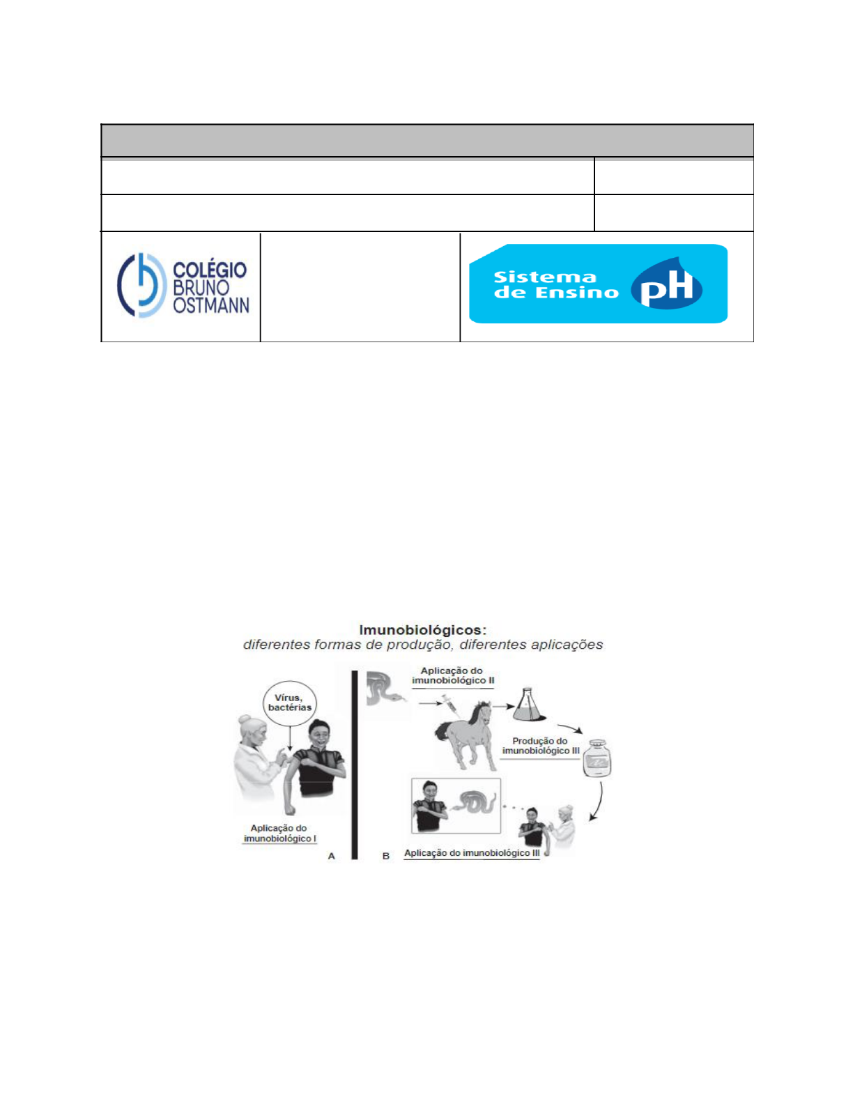 PRÉ MED 2020 Professor: Alan Bonner Disciplina: Biologia II Aluno (a): Nº: DATA 19/08/2020 Imunologia 1) O sistema imune apresenta um tipo de célula que passa do vaso sanguíneo para o tecido conjuntivo onde irá exercer sua função de defesa. A célula e a passagem são, respectivamente, identificadas como: a) basófilos e pinocitose b) macrófagos e fagocitose c) leucócitos e endocitose d) neutrófilos e diapedese e) glóbulos brancos e endocitose 2) Embora sejam produzidos e utilizados em situações distintas, os imunobiológicos I e II, na figura abaixo, atuam de forma semelhante nos humanos e equinos, pois: a) conferem imunidade passiva b) transferem células de defesa c) suprimem a resposta imunológica d) estimulam a produção de anticorpos e) desencadeiam a produção de antígenos 3) Vários métodos são empregados para prevenção de infecções por microrganismos. Dois desses métodos utilizam microrganismos vivos e são eles: as vacinas atenuadas, constituídas por patógenos avirulentos, e os probióticos que contém bactérias benéficas. Na figura abaixo, são apresentados cinco diferentes mecanismos de exclusão de patógenos pela ação dos probióticos no intestino de um animal. Qual mecanismo de ação desses probióticos promove um efeito similar ao da vacina? a) 5 b) 4 c) 3 d) 2 e) 1 4) Segundo Jeffrey M. Smith, pesquisador de um laboratório que faz análises de organismos geneticamente modificados, após a introdução da soja transgênica no Reino Unido, aumentaram em 50% os casos de alergias. “O gene que é colocado na soja cria uma proteína nova que até então não existia na alimentação humana, a qual poderia ser potencialmente alergênica”, explica o pesquisador. Considerando-se as informações do texto, os grãos transgênicos que podem causar alergias aos indivíduos que irão consumi-los são aqueles que apresentam, em sua composição, proteínas: a) que podem ser reconhecidas como antigênicas pelo sistema imunológico desses consumidores b) que não são reconhecidas pelos anticorpos produzidos pelo sistema imunológico desses consumidores c) com estrutura primária idêntica às já encontradas no sistema sanguíneo desses consumidores d) com sequência de aminoácidos idêntica às produzidas pelas células brancas do sistema sanguíneo desses consumidores e) com estrutura quaternária idêntica à dos anticorpos produzidos pelo sistema imunológico desses consumidores 5) A vacina, o soro e os antibióticos submetem os organismos a processos biológicos diferentes. Pessoas que viajam para regiões em que ocorrem altas incidências de febre amarela, de picadas de cobras peçonhentas e de leptospirose e querem evitar ou tratar problemas de saúde relacionados a essas ocorrências devem seguir determinadas orientações. Ao procurar um posto de saúde, um viajante deveria ser orientado por um médico a tomar preventivamente ou como medida de tratamento: a) antibiótico contra o vírus da febre amarela, soro antiofídico caso seja picado por uma cobra e vacina contra a leptospirose b) vacina contra o vírus da febre amarela, soro antiofídico caso seja picado por uma cobra e antibiótico caso entre em contato com a Leptospira sp c) soro contra o vírus da febre amarela, antibiótico caso seja picado por uma cobra e soro contra toxinas bacterianas d) antibiótico ou soro, tanto contra o vírus da febre amarela como para veneno de cobras, e vacina contra a leptospirose e) soro antiofídico e antibiótico contra a Leptospira sp e vacina contra a febre amarela caso entre em contato com o vírus causador da doença 6) Um homem foi picado por uma jararaca e procurou auxílio médico em um hospital. Para inibir o efeito das toxinas contidas no veneno da serpente, o médico indicou para esse homem: a) soro terapêutico b) vacina polivalente c) antibiótico d) antirretroviral e) anti-helmíntico 7) Os anticorpos são glicoproteínas conhecidas também como imunoglobulinas. Apresentam uma estrutura em formato de Y e uma região onde os antígenos se ligam. Os sítios de ligação do antígeno no anticorpo estão localizados: a) exclusivamente na cadeia leve b) exclusivamente na cadeia longa c) na região constante d) na região variável e) na região neutra 8) Os anticorpos podem ser classificados em cinco classes distintas: IgG, IgM, IgA, IgE e IgD. Dessas classes, qual é a única que consegue ser transportada através da placenta e garantir proteção ao feto? a) IgA b) IgG c) IgM d) IgE e) IgD 9) As vacinas são métodos de prevenção e imunização em que doses adequadas de determinado antígeno são introduzidas no organismo humano, produzindo respostas imunológicas específicas. Há vacinas aplicadas em dose única e outras em doses iniciais e de reforço, dependendo da doença. Considere as curvas X e Y do gráfico abaixo, que representam as respostas imunológicas de um indivíduo ao contato com dois antígenos diferentes, administrados separadamente. a) Identifique a curva que representa a resposta imunológica do organismo a uma vacina com dose de reforço contra um dos dois antígenos, justificando sua resposta. b) Nomeie o tipo celular responsável pela produção dos anticorpos no organismo humano. 10) Nas doenças autoimunes, ocorre um ataque generalizado das células do sistema imunológico contra os tecidos do próprio corpo. Pesquisas mostraram que, durante uma resposta autoimune, determinadas células do sistema imunológico se agregam em tecidos linfoides secundários para produzir anticorpos. Considerando esse processo, indique se a resposta imune pode ser classificada como humoral ou celular. Justifique sua resposta. GABARITO 1) Alternativa D 2) Alternativa D 3) Alternativa B 4) Alternativa A 5) Alternativa B 6) Alternativa A 7) Alternativa D 8) Alternativa B 9) a) No gráfico, a curva X representa a resposta imunológica do organismo a duas exposições consecutivas a um mesmo antígeno, o que caracteriza a vacinação com 