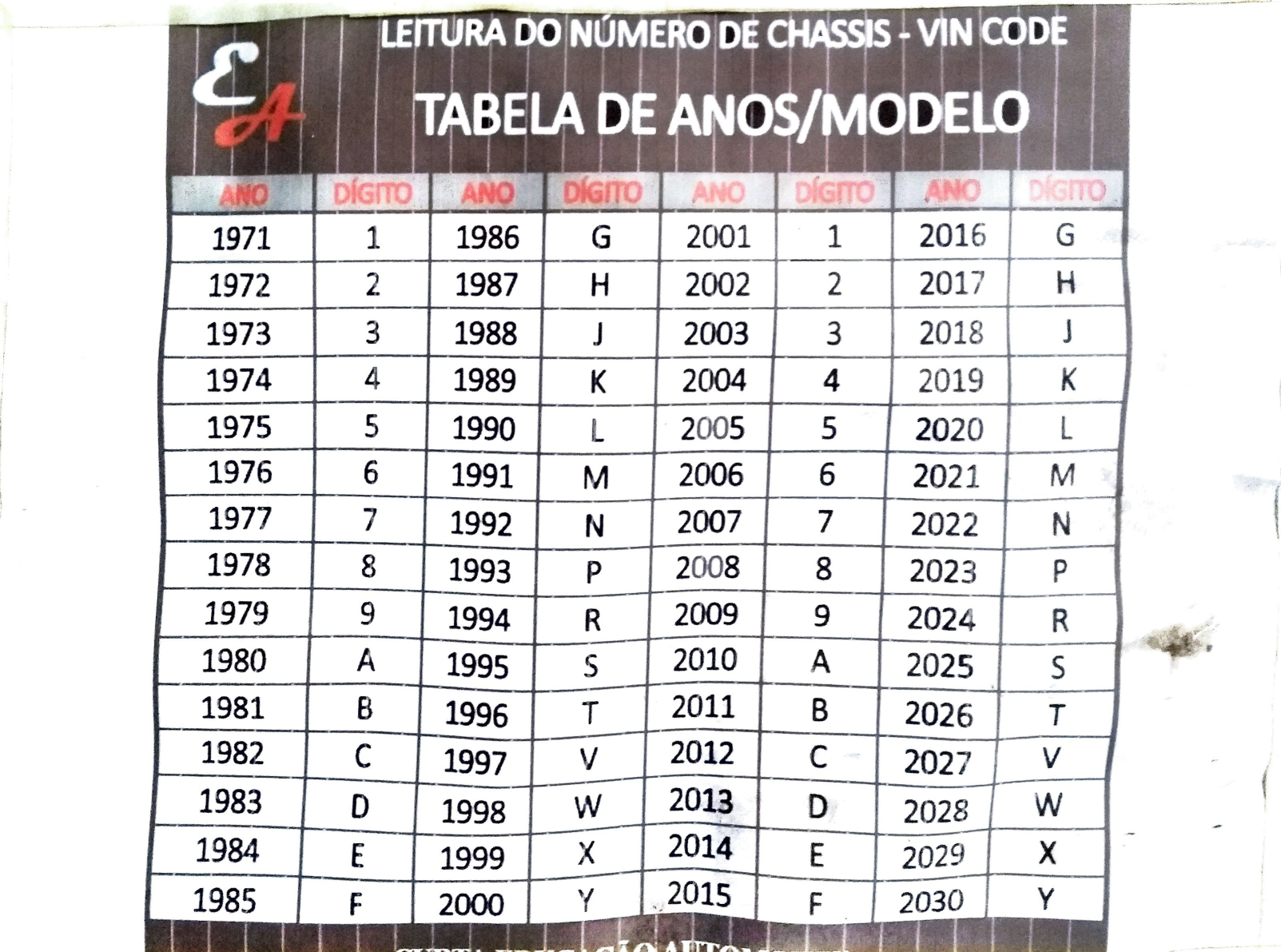 LEITURA D0 NÚMERO DE CHASSIS-VIN CODE TABELA DE ANOS/MODELO 0DÍGIO A NO DiGTO ANO DÍGTO ANO DIGITo 1971 1 1986 G 2001 1 2016 G 1972 2 1987 H 2002 2 2017 H 1973 3 1988 J 2003 3 2018 1974 4 1989 K 2004 4 2019 K 1975 5 1990 L 2005 5 2020 L 1976 6 1991 M 2006 6 2021 M 1977 7 1992 N 2007 7 2022 N 1978 8 1993 P 2008 8 2023 P 1979 9 1994 R 2009 9 2024 R 1980 A 1995 S 2010 A 2025 S 1981 B 1996 2011 B 2026 T 1982 C 1997 V 2012 C 2027 V 1983 D 1998 W 2013 D 2028 W 1984 2014 1999 X Y E E 2029 X 1985 F 2000 2015 F 2030 Y
