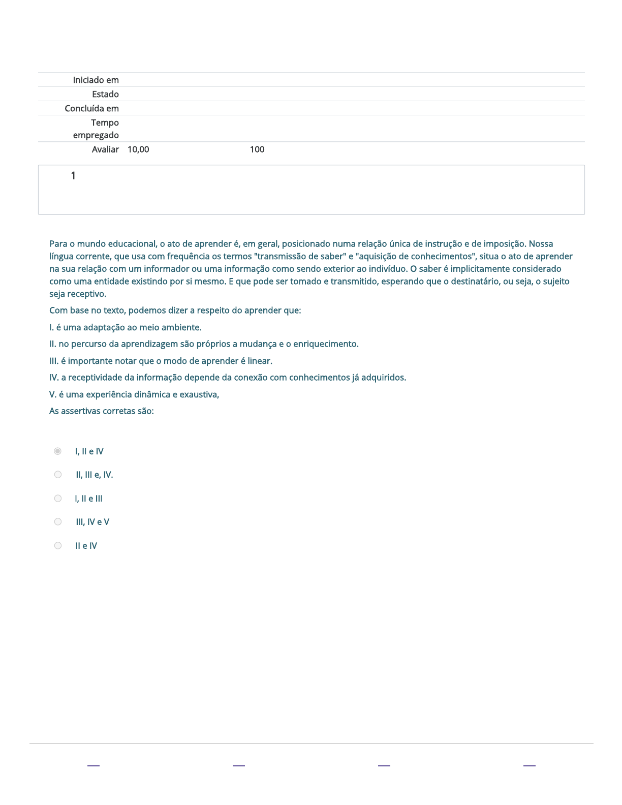 27/01/2021 Atividade: Revisão da tentativa https://eskadauema.com/mod/quiz/review.php?attempt=1721461&cmid=1782 1/5 Iniciado em terça, 26 jan 2021, 21:47 Estado Finalizada Concluída em terça, 26 jan 2021, 21:50 Tempo empregado 3 minutos 22 segundos Avaliar 10,00 de um máximo de 10,00(100%) Questão 1 Correto Atingiu 2,00 de 2,00 Para o mundo educacional, o ato de aprender é, em geral, posicionado numa relação única de instrução e de imposição. Nossa língua corrente, que usa com frequência os termos "transmissão de saber" e "aquisição de conhecimentos", situa o ato de aprender na sua relação com um informador ou uma informação como sendo exterior ao indivíduo. O saber é implicitamente considerado como uma entidade existindo por si mesmo. E que pode ser tomado e transmitido, esperando que o destinatário, ou seja, o sujeito seja receptivo. Com base no texto, podemos dizer a respeito do aprender que: I. é uma adaptação ao meio ambiente. II. no percurso da aprendizagem são próprios a mudança e o enriquecimento. III. é importante notar que o modo de aprender é linear. IV. a receptividade da informação depende da conexão com conhecimentos já adquiridos. V. é uma experiência dinâmica e exaustiva, As assertivas corretas são: Escolha uma opção: a. I, II e IV b. II, III e, IV. c. I, II e III d. III, IV e V e. II e IV Sua resposta está correta. https://eskadauema.com/my https://eskadauema.com/index.php?redirect=0 https://eskadauema.com/user/edit.php?id= https://eskadauema.com/theme/olm/certificates.php 27/01/2021 Atividade: Revisão da tentativa https://eskadauema.com/mod/quiz/review.php?attempt=1721461&cmid=1782 2/5 Questão 2 Correto Atingiu 2,00 de 2,00 A aprendizagem muitas vezes se torna difícil, considerada até como impossível por algumas pessoas. Porém, os neuro�siologistas e os sistemistas a�rmam que todo organismo vivo é, por natureza, "aprendente". Então é possível deduzir que uma pessoa que não aprende é uma pessoa que crê que não pode mais aprender. Sentindo-se enfraquecida, decepcionada, paralisada pelo medo do fracasso, pela angústia do não "ser bem sucedida", pela tristeza e a decepção, ela aprende a se ver como incapaz de aprender. Essa situação, sinônimo de encarceramento, causa um grande sofrimento e é uma grande violência dissimulada que se exerce de maneira subterrânea, minando as situações educacionais aparentemente "normais". Essa violência é praticada cada vez que o indivíduo é impedido de ser o portador de seu próprio potencial de evolução, de transformação, de adaptação e logo, de aprendizagem. Considerando o texto apresentado, indique a alternativa correta: Escolha uma opção: a. A informação deve ser passiva e vinculada ao contexto do aprendente. b. A di�culdade de aprender exige que uma informação deve ser passada da mesma forma tantas vezes seja necessária para o aprendente. c. No percurso da informação são considerados os níveis sensorial e emocional, criando suas condições ideais de aprendizagem. d. A aprendizagem não ocorre na �utuação das atividades cerebrais. e. As representações não estimulam as funções cerebrais e a conexão com a realidade. Sua resposta está correta. https://eskadauema.com/my https://eskadauema.com/index.php?redirect=0 https://eskadauema.com/user/edit.php?id= https://eskadauema.com/theme/olm/certificates.php 27/01/2021 Atividade: Revisão da tentativa https://eskadauema.com/mod/quiz/review.php?attempt=1721461&cmid=1782 3/5 Questão 3 Correto Atingiu 2,00 de 2,00 De acordo com o texto, tem fundamento dizer que: I. aprender é uma dinâmica e nem todo cérebro tem essa capacidade. II. é possível aculturar-se e adaptar-se em diferentes ambientes. III. apenas a racionalidade técnica é a ponte para aprender. IV. a ação-re�exão-aprendizagem faz parte da própria de cada organismo. V. a aprendizagem e a plasticidade só ocorrem com a sociabilidade. Está incorreto as assertivas: Escolha uma opção: a. II, IV e V b. I, II e IV c. III, IV e V d. I, III e V e. II, III e V Sua resposta está correta. https://eskadauema.com/my https://eskadauema.com/index.php?redirect=0 https://eskadauema.com/user/edit.php?id= https://eskadauema.com/theme/olm/certificates.php 27/01/2021 Atividade: Revisão da tentativa https://eskadauema.com/mod/quiz/review.php?attempt=1721461&cmid=1782 4/5 Questão 4 Correto Atingiu 2,00 de 2,00 Termos de uso Política de privacidade Segundo Wittizaele (2003), para que um sistema possa se organizar, estruturar-se, regular-se e se adaptar às mudanças ________________ é preciso que ele disponha de uma possibilidade de detecção das diferenças, permitindo uma ______________. Para isso, as cadeias de causalidade devem ser circulares, o efeito deve incidir sobre a causa. Além disso, é necessário distinguir entre as “informações” que circulam entre os elementos desses circuitos e as “informações” que se referem ao funcionamento da ___________________. Essas últimas consideradas como meta-informações permitem ao sistema preservar sua________________ em relação ao meio ambiente, suas características internas, sua_________________, apesar das mudanças incessantes do sistema maior do qual ele faz parte. Indique a sequência de termos que preenche corretamente as lacuna acima. Escolha uma opção: a. da totalidade do circuito, autonomia, coerência, meio ambiente, ação corretiva b. do meio ambiente, ação corretiva, totalidade do circuito, autonomia , coerência c. do meio ambiente, coerência, autonomia, meio ambiente, ação corretiva d. da ação corretiva, totalidade do circuito, autonomia , coerência, meio ambiente e. do meio ambiente, autonomia , coerência, ação corretiva, totalidade do circuito Sua resposta está correta. https://eskadauema.com/admin/tool/policy/view.php?versionid=1 https://eskadauema.com/admin/tool/policy/view.php?versionid=2 https://eskadauema.com/my https://eskadauema.com/ind