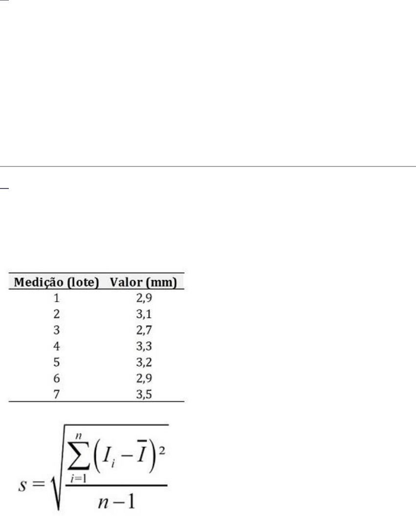 Disciplina: Análise dos Sistemas de Medição (CGQ05) Avaliação: Avaliação Final (Discursiva) - Individual FLEX ( Cod.:454652) ( peso.:4,00) Prova: 14610390 Nota da Prova: 7,50 Parte superior do formulário 1. O principal problema de se controlar um sistema é decidir quais sinais de entrada devem alterar o valor da variável manipulada (BAYER: ARAÚJO, 2010). Existem quatro tipos principais de controle: controle liga-desliga, controlador proporcional, controlador integral e controlador derivativo. Disserte sobre o controle integral. FONTE: BAYER, F. M.; ARAÚJO, O. C. B. Curso técnico em automação industrial: controle automático de processos. 3. ed. Santa Maria: UFSM, 2010. Resposta Esperada: O controle integral apresenta como principal vantagem a remoção do erro que permanece no controle. O controle integral corrige enquanto houver uma diferença entre o valor da variável do processo e o valor desejado, ou seja, enquanto houver uma diferença, o controle tentará corrigi-la. 2. Uma fábrica de sapatos realizou a medida da espessura das solas de sapado de lotes durante um dia de trabalho, apresentado na tabela a seguir. Verificou-se que há uma variação para mais e para menos nos valores das espessuras das solas de sapato. A fim de controlar essa variação, determine o valor do desvio padrão da espessura das solas da amostragem de sete lotes da empresa. Apresente o cálculo que foi utilizado para chegar ao valor final. Utilize a equação apresentada a seguir. Resposta Esperada: A resposta esperada deve estar de acordo com a imagem em anexo. Parte inferior do formulário Disciplina: Análise dos Sistemas de Medição (CGQ05) Avaliação: Avaliação Final (Discursiva) - Individual FLEX ( Cod.:454652) ( peso.:4,00) Prova: 14610390 Nota da Prova: 7,50 1. O principal problema de se controlar um sistema é decidir quais sinais de entrada devem alterar o valor da variável manipulada (BAYER: ARAÚJO, 2010). Existem quatro tipos principais de controle: controle liga - desliga, controlador proporcional, controlador integral e controlador derivativo. Disserte sobre o controle integral. FONTE: BAYER, F. M.; ARAÚJO, O. C. B. Curso técnico em automação industrial: controle automático de processos. 3. ed. Santa Maria: UFSM, 2010. Resposta Esperada: O controle integral apresenta como principal vantagem a remoção do erro que permanece no controle. O controle integral corrige enquanto houver uma diferença entre o valor da variável do processo e o valor desejado, ou seja, enquanto houver uma diferença, o controle tentará c orrigi - la. 2. Uma fábrica de sapatos realizou a medida da espessura das solas de sapado d e lotes durante um dia de trabalho, apresentado na tabela a seguir. Verificou - se que há uma variação para mais e para menos nos valores das espessuras das solas de sapato. A fim de controlar essa variação, determine o valor do desvio padrão da espessura da s solas da amostragem de sete lotes da empresa. Apresente o cálculo que foi utilizado para chegar ao valor final. Utilize a equação apresentada a seguir. Resposta Esperada: Disciplina: Análise dos Sistemas de Medição (CGQ05) Avaliação: Avaliação Final (Discursiva) - Individual FLEX ( Cod.:454652) ( peso.:4,00) Prova: 14610390 Nota da Prova: 7,50 1. O principal problema de se controlar um sistema é decidir quais sinais de entrada devem alterar o valor da variável manipulada (BAYER: ARAÚJO, 2010). Existem quatro tipos principais de controle: controle liga-desliga, controlador proporcional, controlador integral e controlador derivativo. Disserte sobre o controle integral. FONTE: BAYER, F. M.; ARAÚJO, O. C. B. Curso técnico em automação industrial: controle automático de processos. 3. ed. Santa Maria: UFSM, 2010. Resposta Esperada: O controle integral apresenta como principal vantagem a remoção do erro que permanece no controle. O controle integral corrige enquanto houver uma diferença entre o valor da variável do processo e o valor desejado, ou seja, enquanto houver uma diferença, o controle tentará corrigi-la. 2. Uma fábrica de sapatos realizou a medida da espessura das solas de sapado de lotes durante um dia de trabalho, apresentado na tabela a seguir. Verificou-se que há uma variação para mais e para menos nos valores das espessuras das solas de sapato. A fim de controlar essa variação, determine o valor do desvio padrão da espessura das solas da amostragem de sete lotes da empresa. Apresente o cálculo que foi utilizado para chegar ao valor final. Utilize a equação apresentada a seguir. Resposta Esperada:
