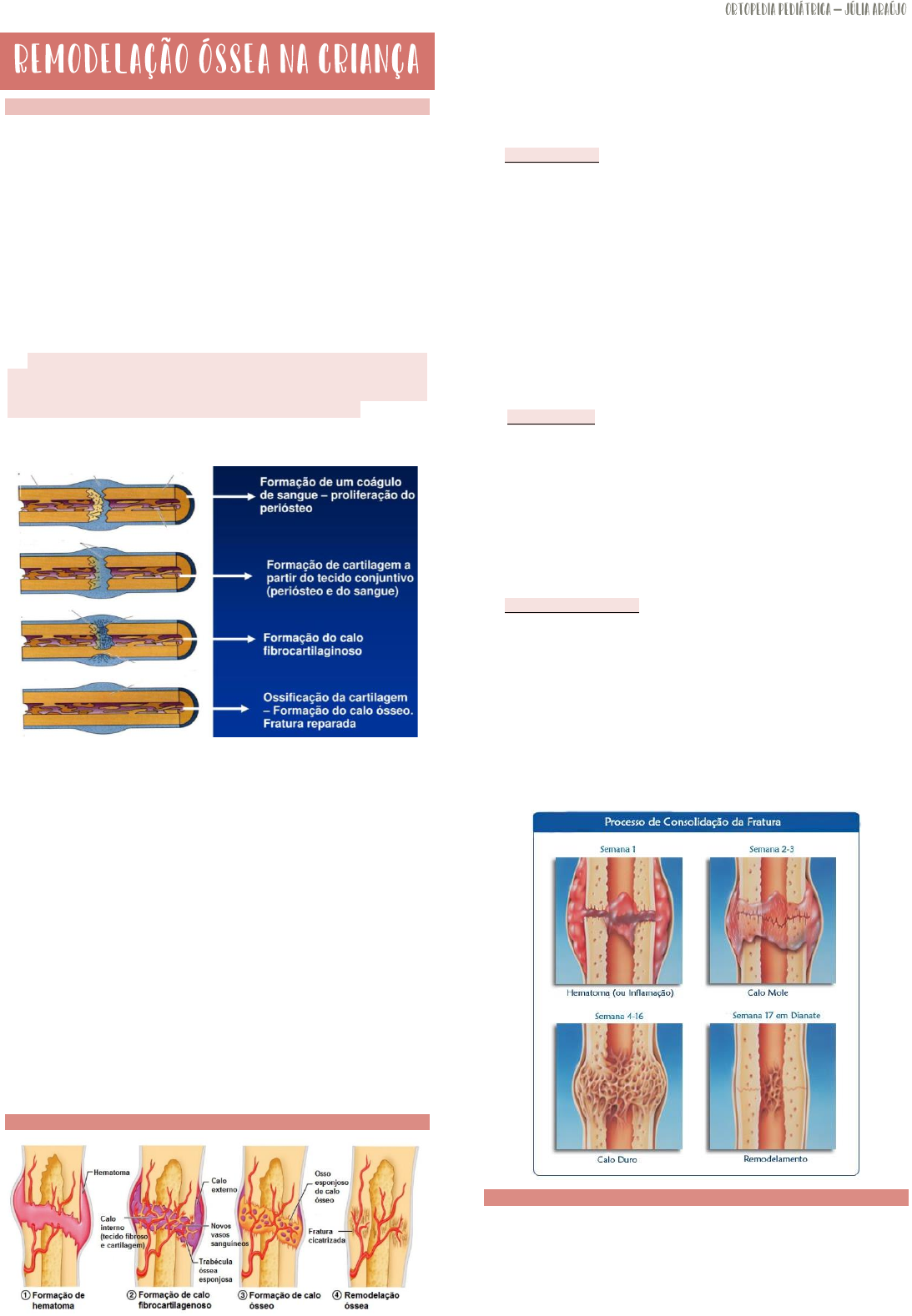 → CONSOLIDAÇÃO ÓSSEA - FASES . Inflamação -> inicia-se logo após a fratura, com o aparecimento do hematoma formado pela ruptura dos vasos sanguíneos, o qual é substituído por tecido de granulação e onde se forma uma matriz de colágeno que irá sustentar o crescimento do novo tecido ósseo. * Hematoma cria um ambiente propício para a migração de mediadores químicos e de proteínas de superfície e de ligação, que estimularão a diferenciação de células mesenquimais indiferenciadas em angioblastos, fibroblastos, condroblastos e osteoblastos. . Reparação -> formação do calo ósseo a partir da formação de um tecido fibrovascular, que se origina de células do endósteo e do periósteo, que dará origem ao osso imaturo pela ossificação endocondral e intramembranosa. . Remodelação -> inicia durante os primeiros dois meses do processo de consolidação e pode durar por vários anos, até que todo calo provisório seja removido e substituído pelo osso maduro ou lamelar, de acordo com as linhas de força geradas pela solicitação mecânica das atividades diárias. . As fraturas apresentam potencial diferente de remodelação e algumas, inclusive, não remodelam. - PRINCÍPIOS BÁSICOS DA REMODELAÇÃO ÓSSEA . Crescimento longitudinal -> determinado pela proliferação das células germinativas na porção epifisária da placa de crescimento . Crescimento na largura -> resultado do crescimento intersticial pela proliferação da MEC na placa de crescimento, originado nos nódulos de Ranvier e limitado em parte pelo anel pericondral. . Crescimento ósseo é mais intenso na região da metáfise para manter a forma tubular do segmento ósseo. . Remodelação óssea é mais intensa no esqueleto imaturo e apresenta maior atividade ao redor das placas de crescimento. . Capacidade de remodelação de uma deformidade causada por fratura depende de três fatores: idade óssea da criança, localização da fratura no segmento ósseo e intensidade da deformidade. . Deformidades rotacionais -> praticamente não corrigem . Deformidades no eixo do movimento articular -> corrigem mais do que as que não estão nesse plano . Fraturas que envolvem a epífise (fraturas articulares) devem ser tratadas com redução anatômica → CONSOLIDAÇÃO ÓSSEA 1) 6- 8hrs 2) até 3 semanas 3) até 3- 4 meses - Processo de Consolidação . Descrição de Cruess e Dumont . Fase Inflamatória- 10% * Inicia-se logo após a fratura * Hematoma formado pela ruptura dos vasos sanguíneos -> substituído por tecido de granulação * Forma uma matriz de colágeno que vai suportar o crescimento do novo tecido ósseo . Hematoma * Cria um ambiente propício para a migração de mediadores químicos e de proteínas de superfície e de ligação * Estimular a diferenciação das células mesenquimais indiferenciadas em angioblastos, fibroblastos, condroblastos e osteoblastos * Essenciais para a formação do calo ósseo . Fase Reparativa- 30% a 40% - calo mole (fibrocartilagem) e calo duro (ósseo) * Formação do calo ósseo propriamente dito * Formação de tecido fibrovascular -> origina as células do endósteo e do periósteo * Dará origem ao osso imaturo pela ossificação endocondral e intramembranosa * Na fase precoce de formação do calo, forma-se inicialmente tecido fibroso, subsequente fibrocartilaginoso, cartilaginoso e ósseo . Fase de Remodelamento- 60% a 70% * Inicia-se durante os dois primeiros meses do processo de consolidação * Consolidação óssea- Conjunto de tecidos que promovem a estabilização temporária da fratura até que a estabilidade seja atingida * Pode durar por vários anos, ate que todo o calo provisório seja removido e substituído pelo osso maduro ou lamelar. * De acordo com as linhas de força geradas pela solicitação mecânica das atividades diárias. - Duração de cada estágio varia dependendo da localização, gravidade da fratura, lesões associadas e idade do paciente → DEFORMIDADE ANGULAR - METÁFISE . 75% da remodelação óssea . Placas de crescimento adjacentes à fratura tendem a corrigir a deformidade, tornando-se perpendiculares às forças que atuam por meio delas por um processo de crescimento simétrico . Lado côncavo é estimulado a crescer mais rapidamente para alinhar a fise, fazendo com que ela adquira posição perpendicular ao longo do eixo da diáfise do osso e, assim que realinha o crescimento longitudinal, passa a ser simétrico - DIÁFISE . 20% da remodelação óssea . Há formação de uma região côncava, submetida à compressão, e outra convexa, estímulo para reabsorção óssea. . Na face submetida a compressão, formam-se cargas negativas que estimulam a deposição óssea e, na fase de tração, cargas positivas que estimulam a reabsorção. . Extremidade proximal do úmero e a extremidade distal do rádio são as regiões do esqueleto com maior capacidade de remodelação, já que as placas de crescimento dessas regiões contribuem com cerca de 80% do crescimento do segmento ósseo. . As placas de maior crescimento são a distal do fêmur e a proximal → Lei de Julius Wolf -> relação entre a deformidade mecânica exercida sobre o tecido ósseo com a arquitetura de suas trabéculas - Ocorrendo um impacto transversal no osso, a atividade osteoclástica aumenta do lado do impacto e a atividade osteoblástica aumenta do lado oposto do impacto. - Estado contínuo de fluxo ou remodelagem (força), no qual as células responsáveis pela destruição do osso (osteoclastos) acarretam o fracionamento (reabsorção) do osso sob a influência do paratormônio. - Disponibilidade de cálcio → Lei de Hueter-Volkmann - Forças longitudinais - Crescimento retardado pelo aumento da compressão mecânica e acelerado pela carga reduzida em comparação com os valores normais. - A compressão sustentada de magnitude fisiológica inibe o crescimento em 40% ou mais. - Área de maior compressão-> menor crescimento → PRINCÍPIOS BÁSICOS