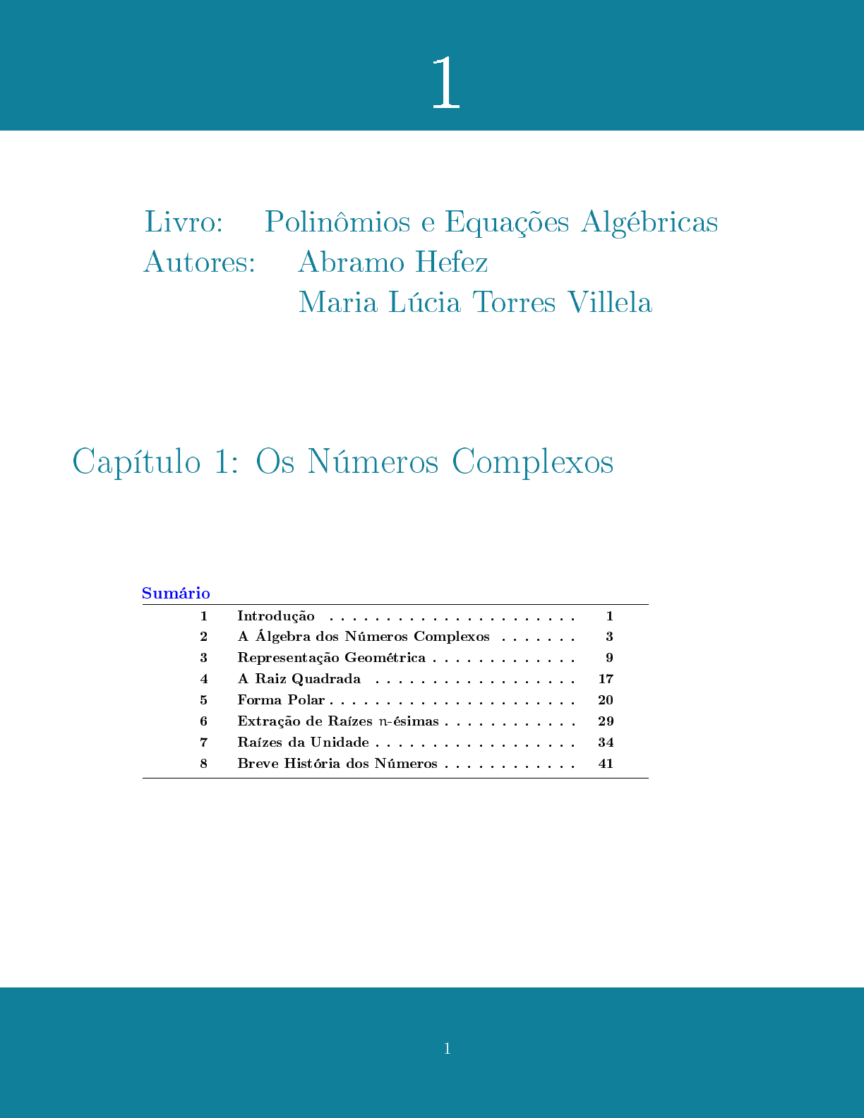 i i �fpolinomios� � 2012/3/18 � 12:03 � page 1 � #1 i i i i i i 1 1 Livro: Polinômios e Equações Algébricas Autores: Abramo Hefez Maria Lúcia Torres Villela Capítulo 1: Os Números Complexos Sumário 1 Introdução . . . . . . . . . . . . . . . . . . . . . . 1 2 A Álgebra dos Números Complexos . . . . . . . 3 3 Representação Geométrica . . . . . . . . . . . . . 9 4 A Raiz Quadrada . . . . . . . . . . . . . . . . . . 17 5 Forma Polar . . . . . . . . . . . . . . . . . . . . . . 20 6 Extração de Raízes n-ésimas . . . . . . . . . . . . 29 7 Raízes da Unidade . . . . . . . . . . . . . . . . . . 34 8 Breve História dos Números . . . . . . . . . . . . 41 i i �fpolinomios� � 2012/3/18 � 12:03 � page 1 � #2 i i i i i i Seção 1 Introdução 1 1 Introdução Jerônimo Cardan (Itália, 1501-1576), um dos mais destacados matemá- ticos do Renascimento, em 1545, achou a resposta α = 5+ √ −15 e β = 5− √ −15, para o problema de determinar dois números cuja soma vale 10 e cujo produto vale 40. De fato, os números procurados são as raízes da equação do segundo grau x2 − 10x+ 40 = 0, que produz as soluções acima, quando resolvida pela fórmula resolvente das equações do segundo grau. Mas, na época em que vivia Cardan, só se conheciam os números reais e, portanto, as raízes quadradas de números negativos eram consideradas inexistentes, logo essas soluções eram tidas como absurdas. Naqueles tem- pos, a situação era ainda mais dramática, pois os matemáticos tinham até di�culdade em operar com os números negativos. O que é notável, é que se operarmos formalmente com essas raízes, como se tivessem as propriedades aritméticas da adição e da multiplicação dos números reais e convencionarmos que ( √ −15)2 = −15, podemos mostrar, sem di�culdade, que α+ β = 10 e α · β = 40. Podemos ainda escrever esses �números� na forma α = 5+ √ 15 √ −1, β = 5− √ 15 √ −1, que quando somados dão 10 e quando multiplicados dão 40, desde que con- vencionemos que ( √ −1)2 = −1. Façamos um outro experimento. Para determinar dois números cuja soma vale 10 e cujo produto vale 26, devemos resolver a equação x2 − 10x+ 26 = 0, cujas raízes são 5 + √ −1 e 5 − √ −1. Novamente, se adicionarmos e multiplicarmos esse �números�, obtemos os números 10 e 26. i i �fpolinomios� � 2012/3/18 � 12:03 � page 2 � #3 i i i i i i 2 Os Números Complexos Cap. 1 Portanto, não parece ser uma simples coincidência que se consiga dessa forma resolver as equações que não têm soluções reais, a custo de introduzir novos �números� que são da forma a+ b √ −1, onde a e b são números reais e √ −1 é um símbolo sujeito à seguinte regra operatória: ( √ −1)2 = −1. A ideia de tratar esses novos entes como números sem as áspas foi de Rafael Bombelli (1726-1772), outro matemático renascentista italiano como o seu contemporâneo Cardan. Motivado pelo trabalho de Cardan e pelo esforço desse em compreender o caso irredutível da equação cúbica (cf. Capítulo 5), Bombelli começou a estudar esses números por volta de 1550, estabelecendo as seguintes regras operatórias: ( √ −1)( √ −1) = −1, (− √ −1)( √ −1) = 1, (− √ −1)(− √ −1) = −1, −1( √ −1) = − √ −1, bem como as fórmulas para a sua adição e multiplicação: (a+ b √ −1) + (c+ d √ −1) = (a+ c) + (b+ d) √ −1, (a+ b √ −1) · (c+ d √ −1) = (ac− bd) + (ad+ bc) √ −1. Os resultados desses estudos foram publicados por Bombelli em 1572 no livro L'Algebra, onde, também, pela primeira vez, foram estabelecidas as regras operatórias com os números negativos. Um fato que intrigou Cardan até o �nal de sua vida foi que equações do terceiro grau da forma x3 = 15x + 4, quando resolvida pelas fórmulas que levam o seu nome, e que estudaremos no Capítulo 5, dava a solução 3 √ 2+ √ −121+ 3 √ 2− √ −121. Por outro lado, uma veri�cação direta mostra que 4 é raiz da equação. Por- tanto, 3 √ 2+ 11 √ −1+ 3 √ 2− 11 √ −1 = 4. Por mais que tentasse, Cardan não conseguia evitar nas suas fórmulas o uso dos radicais quadráticos de números negativos para expressar soluções reais de algumas equações do terceiro grau como esta. Portanto, tinha que passar por soluções �absurdas� para expressar soluções verdadeiras. i i �fpolinomios� � 2012/3/18 � 12:03 � page 3 � #4 i i i i i i Seção 2 A Álgebra dos Números Complexos 3 Vejamos, neste exemplo, a proposta de Bombelli para lidar com tal situ- ação: ( 2+ √ −1)3 = 23 + 3 · 22 √ −1+ 3 · 2( √ −1)2 + ( √ −1)3 = 8+ 12 √ −1− 6− √ −1 = 2+ 11 √ −1,( 2− √ −1)3 = 23 − 3 · 22 √ −1+ 3 · 2(− √ −1)2 + (− √ −1)3 = 8− 12 √ −1− 6+ √ −1 = 2− 11 √ −1. Portanto, 3 √ 2+ 11 √ −1+ 3 √ 2− 11 √ −1 = (2+ √ −1) + (2− √ −1) = 4. O tratamento formal dos números da forma a + b √ −1, dado por Bom- belli, não satisfazia minimamente os matemáticos da época, que os olhavam com muita descon�ança, admitindo-os apenas como artifício de cálculo, sem uma existência efetiva, tendo o próprio Cardan como feroz oponente. Os ma- temáticos da época, pela in�uência da cultura helenística predominante na área, relutavam em aceitar entidades matemáticas que não tivessem algum signi�cado geométrico. Esse signi�cado geométrico foi delineado no �nal do Século 18, início do Século 19. Retornaremos a esse assunto na Seção 3. 2 A Álgebra dos Números Complexos Leonhard Euler (Suiça, 1707-1783), em 1777, denotou o �número� √ −1 por i e determinou várias propriedades dos números introduzidos por Bom- belli, sendo dele a sua representação polar que estudaremos na Seção 5. O fato de chamar √ −1 de i já ajuda a desfazer so�smas que surgiam ao atri- buir, inc