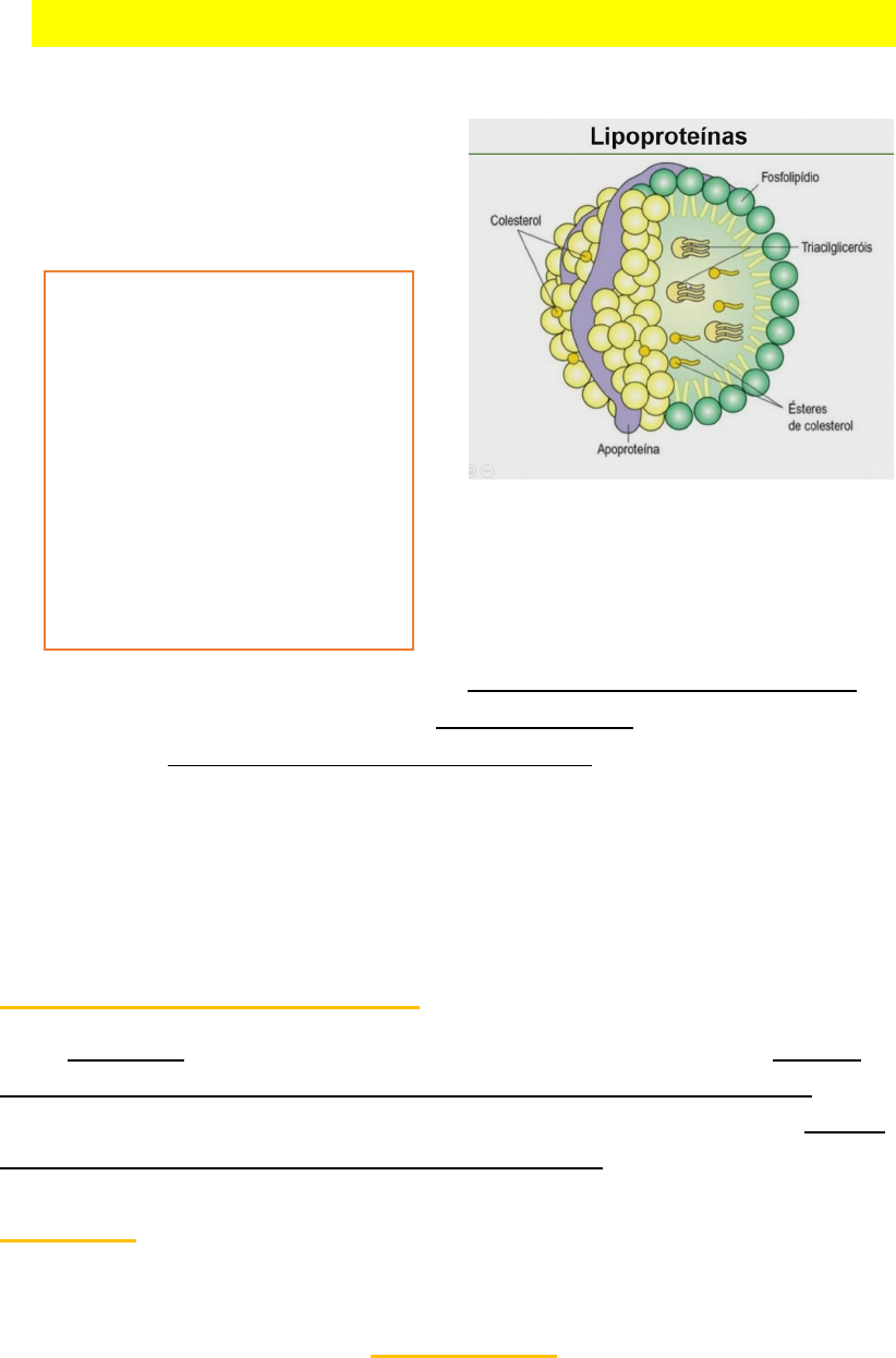 Lipoproteínas BCM I – BASES CELULARES E MOLECULARES· O que são lipoproteínas? · Qual a sua função? · Quais os seus nomes? · Onde são encontradas? · O que são apoliproteínas? — A lipoproteína é o agregado molecular responsável pelo transporte de lipídeos em meios líquidos; — Não se misturam facilmente com o plasma sanguíneo e promovem um eficiente mecanismo de transporte de lipídeos entre os tecidos. —Uma partícula lipoproteica é composta por um centro contendo lipídeos apolares (triglicerídeos e ésteres do colesterol obtidos da dieta) e uma membrana de fosfolipídios que constitui o limite externo da partícula e sua interface com o plasma. — Na membrana são inseridas as várias apoproteínas, que diferem segundo o tipo de partícula. Tamanho e densidade das lipoproteínas — Os quilomicra são a classe de lipoproteínas com a menor densidade e o maior tamanho, e contêm a maior porcentagem de lipídeos e a menor de proteínas. (Menor densidade e maior tamanho.) —Em ordem crescente de densidade estão as VLDL e LDL, que apresentam uma maior razão proteínas/lipídeos. —As partículas de HDL são as mais densas. lipoproteínas: ↓ densidade= ↑ tamanho ↑ lipídeos = ↓proteína. Maior densidade= maior participação de proteínas na formação do complexo. Apolipoproteínas As apolipoproteínas associadas às lipoproteínas exercem funções diversas: — Fornecem sítios de reconhecimento para receptores nas superfícies celulares; - Ativadoras para enzimas envolvidas no metabolismo das lipoproteínas. — Algumas das apolipoproteínas são componentes estruturais essenciais das lipoproteínas e não podem ser removidas, enquanto outras são transferidas livremente entre as lipoproteínas. — As apolipoproteínas podem ser classificadas segundo sua estrutura e função em cinco classes principais, de A até E e subdivididas em subclasses, por exemplo, apolipoproteina (ou apo) A-1 e apo C-11. TAG = triacilglicerol EC= colesterol éster≠C por causa do ác graxo. — Os quilomicra são formados nas células da mucosa intestinal e transportam triacilgliceróis, colesterol, vitaminas lipossolúveis e ésteres de colesterol da dieta para o sistema linfático e sangue. — Destino : degradação de TAG por lipase lipoproteica extracelular; remanescentes para o fígado. — Os TAG perfazem cerca de 90% dos lipídeos em um quilomicra e baixa quantidade de colesterol. — A apolipoproteína B-48 é exclusiva dos quilomicra ( função de transporte). — Sua síntese inicia no retículo endoplasmático rugoso (RER) — Quando a quilomicra alcança o plasma, a partícula é rapidamente modificada, recebendo as apolipoproteínas E (que são reconhecidas por receptores hepáticos) e C. - A apo C-11 é necessária para a ativação da lipase lipoproteica , enzima que degrada os triacilgliceróis dos quilomicra nos capilares. — Forma-se ácidos graxos livres e glicerol. —Os ácidos graxos são armazenados (no adipócito) ou usados para gerar energia (no músculo). —A fonte dessas apolipoproteínas é a HDL circulante. As apolipoproteínas, os ésteres de colesterol e os outros componentes dos remanescentes de quilomicra endocitados são degradadas por hidrólise no fígado, liberando aminoácidos, colesterol livre e ácidos graxos. —O receptor é reciclado. Apolipoproteína é uma proteína que liga lipídeos, formando uma lipoproteína. É classificada em dois tipos principais: Apolipoproteína-A e Apolipoproteína-B. A Apo-A está associada ao colesterol-HDL, facilitando o transporte de colesterol dos tecidos para o fígado ("bom colesterol"). Já a Apo-B é constituinte do colesterol-LDL e é a responsável pela ligação destes aos receptores celulares, podendo levar a acumulação nas artérias e entupimento das mesmas (aterosclerose). Apo-B 48= quilomicra. Quilomícron VLDL LDL HDL Densidade Muito baixa (menor de todas) Muito baixa Baixa Alta Apolipoproteinas associadas Apob48 ApoE Apoc2 Apoc3 ApoA-4 Apop-100(reconhecimento de receptor) Apoc-1 Apoc-2 Apoc3 ApoE Apop100 Apo-A-1 Apo-A-2 Apo-A-4 ApoC-3 ApoD Apo-CII e Apo-E Origem Células da mucosa intestinal. Intestino (intracelular, a partir da alimentação.) Fígado Plasma. Fígado e células da parede intestinal. Destino Plasma. (Degradação de TAG por lipase lipoproteica extracelular; para o fígado.) Plasma (degradação de TAG por lipase lipoproteica). Endocitose em tecidos periféricos. Captam C dos tecidos extra-hepáticos e os transportam novamente para o fígado. Conteúdo lipídico TAG(alto) + colesterol(muito baixo). TAG (alto) + C baixo. CE+C TAG baixo; Colesterol muito alto. TAG muito baixo, colesterol baixo. Caso clínico Homem, 39 anos, em retorno a uma consulta de rotina com seu endocrinologista, recebeu uma má notícia de seu médico. Abaixo estão descritos os resultados de Triglicerídeos (TG), Colesterol total, LDL-c, HDL-c. A partir da análise dos resultados desses exames, a má notícia deve-se ao fato de que: a. Os exames apontam para uma hipercolesterolemia, doença relacionada a alto risco de desenvolvimento de doença coronariana. Responder no caderno Dietas ricas em ácidos graxos saturados estão relacionadas ao aparecimento de doenças cardiovasculares; assim como dietas ricas em ácidos graxos poli-insaturados estão relacionadas à diminuição do risco de ataques cardíacos e derrames. A manteiga apresenta aproximadamente 65% de ácidos graxos saturados. Dessa maneira a indústria de alimentos, na busca por alternativas mais interessantes, passou a hidrogenar óleos vegetais, ricos em ácidos graxos insaturados (na produção de margarinas), contudo essa reação apresenta como subproduto os ácidos graxos trans. Um dos efeitos bioquímicos do consumo de ácidos graxos trans é o aumento de LDL (lipoproteína de baixa densidade) e a redução do HDL (lipoproteína de alta densidade). Qual a principal diferença entre as funções do HDL e do LDL? R: HDL t