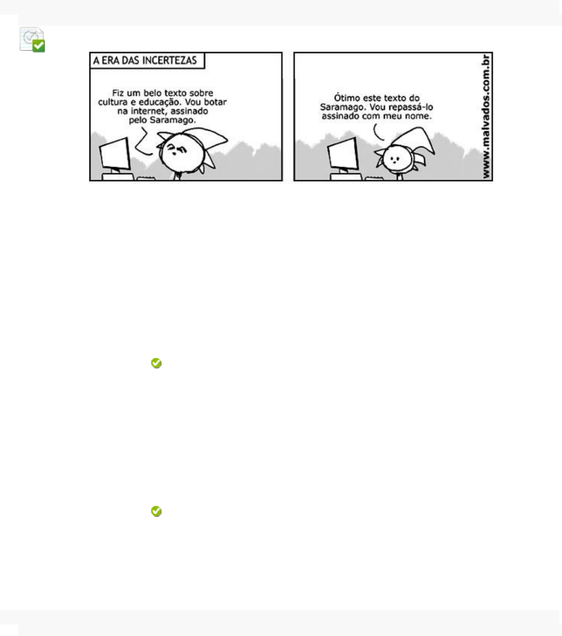 · Pergunta 1 0,5 em 0,5 pontos Os quadrinhos a seguir mostram um problema na disseminação de informações via rede. Fonte: www.malvados.com.br. Acesso em: 19 jul. 2015. Com base na leitura e nos seus conhecimentos, analise as asserções. I. As facilidades de propagação de informações na sociedade em rede possibilitam a divulgação de textos sem a correta referência, o que invalida a internet como forma de obtenção de conhecimento. PORQUE II. As redes sociais permitem o compartilhamento de textos sem a checagem de fontes, o que provoca, muitas vezes, a disseminação de informações incorretas. Assinale a alternativa correta. Resposta Selecionada: d. A asserção I é falsa e a II é verdadeira. Respostas: a. As duas asserções são verdadeiras e a segunda justifica a primeira. b. As duas asserções são verdadeiras e a segunda não justifica a primeira. c. A asserção I é verdadeira e a II é falsa. d. A asserção I é falsa e a II é verdadeira. e. As duas asserções são falsas. Feedback da resposta: Comentário: a disseminação de informações incorretas na internet não a invalida como forma de obtenção de conhecimento. · Pergunta 2 0,5 em 0,5 pontos Leia os quadrinhos e o texto do sociólogo Zygmunt Bauman. Fonte: acervo pessoal “A ‘sociedade de consumidores’ é um tipo de sociedade (recordando um termo, que já foi popular, cunhado por Althusser) que ‘interpela’ seus membros (ou seja, dirige-se a eles, saúda-os, apela a eles, questiona-os, mas também os interrompe e ‘irrompe sobre’ eles) basicamente na condição de consumidores. [...] Ela avalia – recompensa e penaliza – seus membros segundo a prontidão e adequação da resposta deles à interpelação. Como resultado, os lugares obtidos ou alocados no eixo da excelência/inépcia do desempenho consumista se transformam no principal fator de estratificação e no maior critério de inclusão e exclusão, assim como orientam a distribuição do apreço e do estigma sociais, e também de fatias da atenção do público.” BAUMAN, Z. Vida para consumo. São Paulo: Nacional, 2008. Com base na leitura, analise as afirmativas. I. Os quadrinhos e o trecho de Bauman tratam do valor do indivíduo na nossa sociedade, em que o consumo é considerado um critério para inclusão ou exclusão social. II. O personagem dos quadrinhos está lendo uma frase de Bauman, com a qual concorda, pois a essência de um indivíduo encontra-se em seu caráter. III. Segundo o sociólogo, a incapacidade de consumir implica a penalização social do indivíduo. Assinale a alternativa correta. Resposta Selecionada: b. I e III são corretas. Respostas: a. I, II e III são corretas. b. I e III são corretas. c. Somente a afirmativa III é correta. d. Nenhuma afirmativa é correta. e. Somente a afirmativa I é correta. Feedback da resposta: Comentário: os quadrinhos e o trecho de autoria de Bauman criticam a sociedade de consumidores, na qual o valor do indivíduo está no que “ele possui”, e não no que “ele é”. Esse critério de valoração é um fator de estratificação e de inclusão ou exclusão social. De acordo com o sociólogo, nesse tipo de sociedade, indivíduos incapazes de consumir são penalizados. Além disso, o personagem dos quadrinhos não acredita que, na sociedade de consumidores, o indivíduo seja valorizado pelo que é, e sim pelo que possui. Esse personagem chega a dizer que aquele que “não possui” nem mesmo “é um indivíduo”. · Pergunta 3 0,5 em 0,5 pontos Leia o artigo de Mônica Sousa, filha do desenhista Mauricio de Sousa e inspiradora da personagem Mônica das histórias em quadrinhos. Em seguida, observe a tirinha. Somos todas donas da rua 08/03/2016 “No começo, a Turminha era formada só de meninos: Franjinha, Cebolinha, Chico Bento. Até que começaram a perguntar para o meu pai: ‘Cadê as meninas?’. Mauricio conhecia mais o universo dos garotos. Foi aí que ele começou a olhar em volta e percebeu que poderia se inspirar nas filhas. Em 1963, Mônica estreou na tirinha do Cebolinha e encantou todo mundo com um jeito que não era considerado exatamente feminino para a época. Ela era forte, decidida, dona da rua. Eu era também. Meu pai sempre me deixou ser do meu jeito, sem me limitar por ser menina. Para ele, minha autenticidade (e de todos nós, seus dez filhos) sempre foi importante. É só ver, nos gibis, as peculiaridades de cada personagem baseado em nós. Quando uma menina ou mulher é mais, digamos, assertiva, logo leva a fama de mandona. Mas, para mim, o que a Mônica sempre teve foi uma autoconfiança enorme, além de um grande sentimento de responsabilidade em relação a seus amigos. Meninas em todo o Brasil e em vários países do mundo se identificam com a dentucinha, cuja força maior não é a física: é a força de quem acredita em seus sonhos e capacidades. Na época em que a personagem nasceu, os anos 1960, as mulheres começavam a ganhar mais espaço no mercado de trabalho. No ano de publicação da primeira tirinha em que a Mônica aparece, a russa Valentina Tereshkova foi a primeira mulher a viajar ao espaço. Mas o caminho foi longo. Fazia pouco menos de três décadas que as brasileiras haviam conquistado o direito ao voto. Em 1964, foi criada a Magali, mais delicada, conciliadora (além de comilona, claro!). Mais alguns anos e chegou a Rosinha e tantas outras. Cada uma com seu jeito. Os meninos e meninas da Turma são diferentes? Com certeza. Mas brincam de casinha, de futebol, de viagem espacial, do que quiserem brincar. Juntos. E, como a Mônica nunca foi limitada pelo fato de ser menina, elas e eles também não são. Têm os mesmos direitos e oportunidades. São iguais na diferença. Como são, naturalmente, as crianças. Ou como deveriam ser. Mas as crianças, também naturalmente, seguem os exemplos dos adultos, não é? Por isso precisamos ser bons exemplos para eles. Pois é, em pleno século 21, ainda há muito a conquistar. C