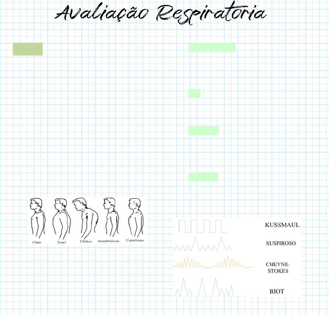 Inspeção: Ve X Vm ( TOT, TQT, Oxigenioterapia.→ → Sinais de desconforto ( uso de musculatura acessória, aleteo nasal). → Atividade expiratória. ( força da musculatura expiratória) → Assimetria do tórax → Tipo de tórax (normal, barril, cifose, cariniforme, infundibiliforme) → Ritmo respiratório ( regular, cheyne-stokes, biot, kussmaul, suspirosa). * PMV (torácico, abdominal, combinado, paradoxal). → • Cheyne-Stokes: fase de apneia seguida de incursões respiratoria até atingir o maximo, até nova pausa. Causado por IR, AVC que lesa o centro respiratório ou lesão na caixa torácica. • Biot: respiração em amplitude variável (anárquica), períodos de apneia, as causas são as mesmas da cheyne- stokes. • Kussmaul: inspirações profundas seguidas de pausa e expirações curtas seguidas de pausa, principal causa é a acidose metabólica causada pela diabetes. • Suspiroso: movimentos respiratório seguida por suspiros, causada por ansiedade e emoção. Página 1 de Avaliação Respiratoria