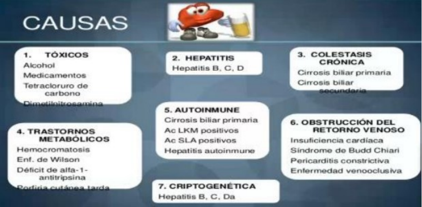 Luana Soares (67)98481-6271 Cirrosis e hipertensión portal Definición cirrosis: proceso crónico, caracterizado por formación de nódulos de regeneración y fibrosis del parénquima que distorsionan la arquitectura hepática y daña al hepatocito. La cirrosis es un proceso crónico y progresivo caracterizado por la formación de nódulos de regeneración y la fibrosis del parénquima que producen distorsión de la arquitectura hepática, alteración de la circulación portal e insuficiencia funcional del hepatocito. Clínicamente puede variar desde la ausencia completa de síntomas hasta la presentación de las siguientes manifestaciones: 1. Hipertensión portal: es el aumento de la presión en el territorio de la vena porta que ocasiona la formación de líquido en la cavidad abdominal (ascitis) y colaterales portosistémicas (várices esofágicas). 2. Encefalopatía hepática: alteración neuropsiquiátrica producida por la circulación de sustancias no metabolizadas por el hígado que acceden al SNC. 3. Insuficiencia hepática: estadio final caracterizado por la incapacidad del hígado para ejercer sus funciones de metabolismo y síntesis. Manifestaciones clínicas Hígado sano + alcohol= cirrosis Etiología En occidente representa el 60% (cirrosis de Laennec) A mayor cantidad de consumo mayor posibilidad de cirrosis. Se deberá demostrar la relación directa entre consumo de OH y cirrosis. En los bebedores severos se puede desarrollar la enfermedad en uno o dos años, aunque habitualmente ocurre luego de varios años de ingesta intensa. Si bien no siempre se puede demostrar, en la mayoría de los casos existe una relación clara entre la ingestión de alcohol y la producción de cirrosis; Cuando se consume 80 y 160 gramos diarios se cree que el riesgo de cirrosis aumenta en 5x mas. Factores que producen dependen de: a. Cantidad y duración 80g diarios por 20 años. b. Sexo mujeres c. Asociación con virus de la hepatitis B y C. la ingesta de alcohol en pacientes con compromiso hepático previo favorece el daño hepático. d. Estado nutricional (alcohólico es un paciente desnutrido) Luana Soares (67)98481-6271 Manifestaciones de alcoholismo crómico • Neuropatías periféricas, glositis, anemias macrocíticas, ferropenia, edemas. • Hipertrofia parotídea bilateral • Ginecomastia bilateral • Nauseas secas matutinas, anorexia • Contractura palmar de DUPUYTREN • Deterioro cognitivo *Disminución de la memoria y concentración.) • Trastornos de sueno e irritabilidad. Cirrosis pos hepática Hepatites B y C (2 cada causas mas importante de cirroses em ocidente y primera em asia y africa) (importante) Pregressa a cirroses 20-30% La aparición de cirrosis se halla en relación con la distorsión de la arquitectura lobulillar que produce el virus, el consumo de alcohol y la superposición de la infección por el virus de la hepatitis delta (HDV). El carcinoma hepatocelular es una complicación que se puede presentar aun en ausencia de cirrosis. Hígado graso no alcohólico Obesidad mundial e hígado graso ESTEATOHEPATITIS NO OH (puede desarrollar fibrosis y progresar a la cirrosis) ENFERMEDADES AUTOINMUNES 1. Cirrosis biliar primaria: mujeres de mediana edad, se caracteriza por la presencia de enzimas de colestasis elevadas y de anticuerpos antimitocondriales (produce por la destrucción de los conductos biliares intrahepáticos. 2. Colangitis esclerosante primaria: hombres jóvenes, asociado a Colitis ulcerosa. (diagnostico se hace demostrando la deformación de los conductos biliares por colangiopancreatografia retrograda endoscópica o por colangiografía por RM) 3. Hepatitis autoinmune: causa desconocida, mujeres, presenta anticuerpos anti musculo liso, Antinucleares e hipergamabloulinemia y se asocia con otras enfermedades autoinmune. ENFERMEDADES GENETICAS 1. Déficit de alta 1 anti tripsina (debe investigarse en los pacientes cirróticos con enfisema o en los niños con colestasis.) 2. Enfermedad de Wilson (son pacientes jóvenes con aumento de las transaminasas, hemólisis, trastornos neuropsiquiátricos y anillo de Kayser-Fleischer en la córnea observable con lámpara de Luana Soares (67)98481-6271 hendidura. Presentan elevados niveles de cobre en orina de 24 horas y descenso de la ceruloplasmina.) 3. Hemocromatosis (se produce por una alteración en el metabolismo del hierro que ocasiona disfunción hepática, cardíaca, pancreática y/o articular. Presenta niveles elevados de ferritina y de saturación de la transferrina. Se confirma con el estudio genético que demuestra la mutación del gen HFE.) Síntomas Cirrosis compensada La cirrosis puede permanecer latente durante períodos prolongados y ser diagnosticada en un examen clínico o de laboratorio de rutina o en el curso de una laparotomía o una necropsia. Durante este periodo, los pacientes pueden permanecer sin síntomas o presentar signos inespecíficos que suelen atribuirse a otras enfermedades, lo que explica que solo en un tercio de los casos el diagnóstico se realiza en esta etapa. En este estadio, el diagnóstico de certeza se realiza por la biopsia hepática, que muestra los típicos nódulos de regeneración y la fibrosis. Cirrosis descompensada En esta etapa, el paciente por lo general realiza la consulta médica debido a las manifestaciones provocadas por la hipertensión portal o por insuficiencia hepática. Existe decaimiento general y puede aparecer febrícula de 37ºC (probablemente a causa de bacteriemia por gramnegativos o de la necrosis hepatocelular). Puede haber aliento hepático e ictericia, que aumenta en relación directa con la incapacidad de las células hepáticas para metabolizar la bilirrubina. Son típicos de esta etapa descompensada los hallazgos cutaneomucosos y las alteraciones de la semiología abdominal, asi como las manifestaciones neurológicas. La posibilidad de descompensación para el paciente individual es difícil de predecir, ya que en ello inciden la etiología de 