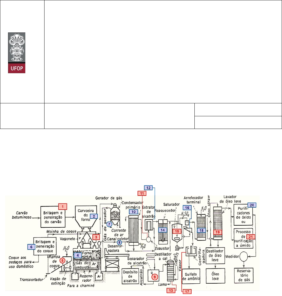 UNIVERSIDADE FEDERAL DE OURO PRETO ICEB - DEPARTAMENTO DE QUÍMICA EXERCÍCIO 1– PROCESSOS INDUSTRIAIS ORGANICOS-QUI291 EXERCICIO AVALIATIVO EM GRUPO DE TRÊS ALUNOS 5 PONTOS EM 100 PONTOS-REMOTO PROFESSORA: VIVIANE MARTINS UTILIZE O ESPAÇO DESTA FOLHA Alunos Adriano Felipe Alves, Barbara Fonseca Caires, Daiana Rocha e Wellington Reis Turma: 11 Data: 27-01-2021 1) Explique o fluxograma do processo industrial orgânico da indústria carboquímica. Detalhe os produtos que estão saindo, temperatura e cada processo. (2,5 PONTOS) Para melhor compreensão de todo processo, enumerando-se as unidades temos que: 1. O carvão betuminoso passa por um processo de britagem e peneiração, garantindo assim que a matéria-prima tenha granulometria ideal para prosseguir. 2. Na carvoeira há um pré-aquecimento que evita choques térmicos e diminui a quantidade de energia que o forno precisa para operar. 3. O carvão pré-aquecido é depositado sobre as vagonetas e então são transportados pelos trilhos até o forno. 4. Onde ocorre a carbonização/coqueificação do carvão que utiliza o próprio gás de combustão gerado pela queima dos finos de coque (7) que saem da moinha de coque (6) como fonte de aquecimento, iniciando o processo a 700º C até 1100º C operando 24h. Duas correntes saem da unidade, uma com gás de coqueria que passa pelo canal coletor em direção ao condensador primário e outra corrente com o coque sai pela desenfornadora e é transportada por um operador até o vagão de extinção (5). 5. No vagão de extinção o coque é resfriado com mangueiras de água provocando solidificação do coque, em seguida o coque é transportado para uma unidade de britagem e peneiração (6). 6. O coque que não sofre britagem, nem peneiração é designado para uso doméstico. Já o coque processado na unidade (moinha de coque) com granulometria ideal é transportado para o gerador de gás (7). 7. O gás de combustão gerado nesta unidade é utilizado como fonte de aquecimento para o forno. 8. A corrente do canal coletor tem uma solução amonical, levando a condensação do componente mais pesado, que neste caso é o alcatrão, sendo que uma parte dessa solução sai junto com o alcatrão. 9. A solução amonical que saiu junto com o alcatrão é separada. 10. O alcatrão é condensado após o contato com a solução amoniacal. 11. O gás de coqueria passa por esse exaustor para comprimir o gás e assim extrair qualquer resíduo de alcatrão (separar alcatrão médio). 12. Também chamado de precipitador eletrostático, possui barras metálicas com o intuito de separar o alcatrão residual do gás de coqueria. 13. Onde ocorre o tratamento da solução amoniacal, que foi utilizada para condensar o alcatrão, aumentando o pH através da solução da cal convertendo hidróxido de amônia em amônia. Podendo assim ser utilizado para fertilizantes. 14. O gás de coqueria resfriado é reaquecido antes de ir para o saturador (15). 15. É onde ocorre a entrada do ácido (sulfúrico ou fosfórico) que vai reagir com a amônia presente no gás de coqueria. Com isso, se obtém um sal inorgânico, que pode ser o (NH4)2SO4 ou o (NH4)3PO4, a depender do ácido utilizado. Esse produto é utilizado na indústria de fertilizantes. Na corrente superior sai o gás de coqueria sem a amônia e na corrente inferior sai o sal inorgânico e o alcatrão. 16. Etapa de lavagem do sal inorgânico, ocorrendo a sua cristalização. 17. Centrifugação dos cristais. Esses cristais se depositam no fundo e são coletados por um processo de filtração. 18. Resfriamento da carga de entrada do lavador com óleo. 19. Lavagem em contracorrente com óleo straw que solubiliza os solutos solúveis em óleo e depois é separado por destilação (gás de coqueria por baixo e óleo de lavagem por cima) para retirar o óleo leve. Para reter as cinzas e o enxofre podem ser utilizadas a unidade 20 ou 21 20. É utilizado um leito de óxido de ferro que transforma o enxofre em sulfeto férrico/sulfeto ferroso. 21. Ocorre a retirada de umidade, liberando gás seco (sem água e sem enxofre). Posteriormente, os gases são armazenados em reservatórios de gás. 2) Explique o fluxograma de destilação do alcatrão e indique os produtos obtidos. (2,5 PONTOS) Para uma melhor compreensão de todo o processo, enumerando-se as unidades temos que: 1. O alcatrão entra bruto nesta unidade, onde é filtrado e bombeado para o a de calor. 2. Neste primeiro trocador de calor, o alcatrão é aquecido pelo vapor de refluxo que sai da coluna de fracionamento (5). Este vapor de refluxo resfria-se ao aquecer o alcatrão e sai como água líquida. 3. Neste trocador de calor ocorre mais aquecimento do alcatrão pelo piche, que sai da coluna de destilação. O piche sai mais frio, devido a troca de calor com o alcatrão, e segue para o armazenamento. O alcatrão sai mais quente e vai para a coluna de destilação. 4. Na parte superior desta coluna de destilação sai os vapores arrastados pelo vapor de água e superaquecidos. Estes vapores seguem para a coluna de fracionamento. O piche sai desta coluna em retornando ao trocador de calor (3) e o alcatrão sai no fundo da coluna em direção a Retorta Tubular. 5. Os vapores arrastados entram na base da coluna de fracionamento onde são separados em 4 frações (corrente 1, 2, 3 e 4) e uma fração residual que sai na base da coluna. No topo da coluna sai um vapor que pode conter alcatrão, este vapor segue em direção ao condensador de refluxo. 1 2 3 4 5 6 7 6. No condensador de refluxo o vapor que sai do topo da coluna é resfriado e retorna para a coluna de fracionamento. Sendo que o vapor de refluxo sai deste condensador e segue para o 1 trocador de calor. 7. O alcatrão que sai no fundo da coluna de destilação entra na retorta tubular a calor radiante onde é reaquecido e retorna para a coluna de destilação para uma maior purificação e consequentemente para gerar mais vapores que seguirão para a co