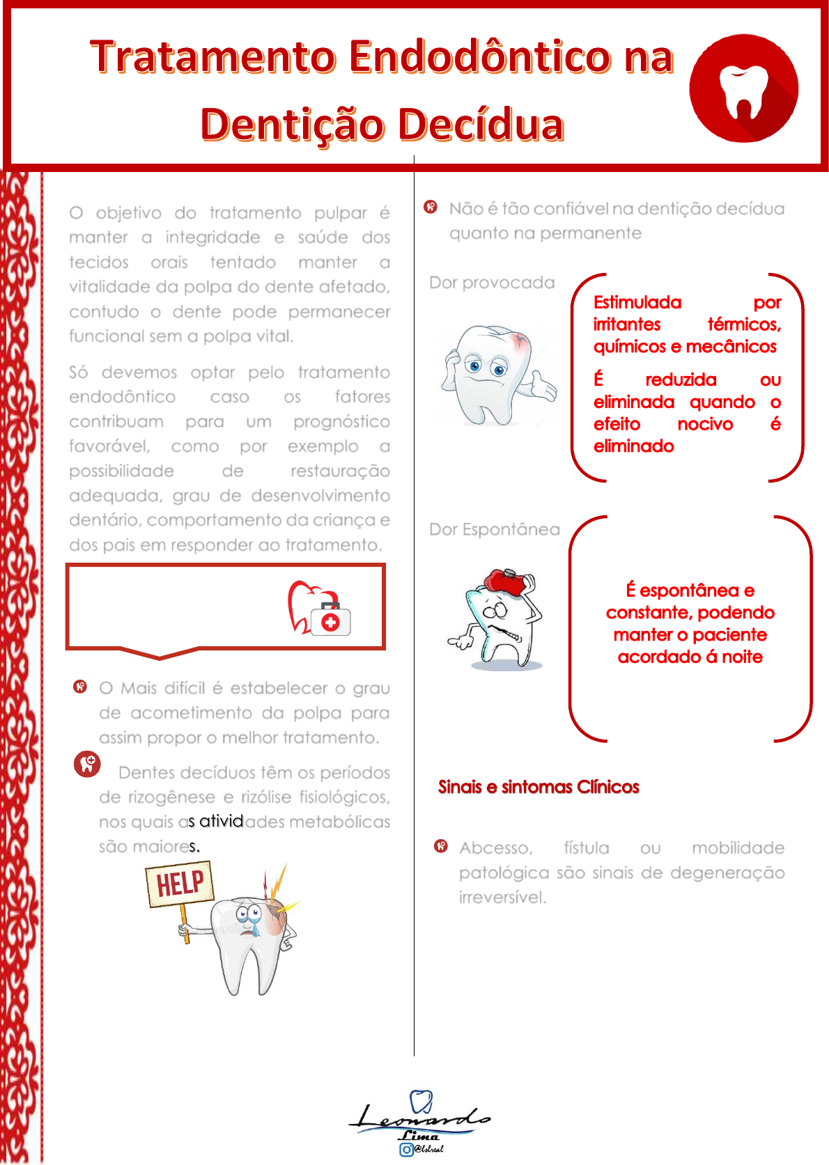 O objetivo do tratamento pulpar é manter a integridade e saúde dos tecidos orais tentado manter a vitalidade da polpa do dente afetado, contudo o dente pode permanecer funcional sem a polpa vital. Só devemos optar pelo tratamento endodôntico caso os fatores contribuam para um prognóstico favorável, como por exemplo a possibilidade de restauração adequada, grau de desenvolvimento dentário, comportamento da criança e dos pais em responder ao tratamento. O Mais difícil é estabelecer o grau de acometimento da polpa para assim propor o melhor tratamento. Dentes decíduos têm os períodos de rizogênese e rizólise fisiológicos, nos quais as atividades metabólicas são maiores. Não é tão confiável na dentição decídua quanto na permanente Dor provocada Dor Espontânea Abcesso, fístula ou mobilidade patológica são sinais de degeneração irreversível. DIAGNÓSTICO A sensibilidade á percussão normalmente representa uma inflamação aguda, mais deve se avaliar fatores em conjunto como profundidade da cárie, restauração mais alta. Os testes de vitalidade não são muito confiáveis em crianças. No teste elétrico, pode ocorrer resposta positiva em polpas necrosadas se o conteúdo do canal for líquido. Já nos testes térmicos e de percussão já dificuldade de resposta adequada da criança. Alterações gengivais (Coloração/fístula/edema/ulcerações) Cárie Fratura Abrasão Erosão Restaurações perdidas Testes Térmicos – Não realizar Resultado falso positivo: estimulo da gengiva ou ligamento periodontal. Apreensão da criança (dor provocada) Pequena Exposição pulpar (vivo) circundada por dentina sadia = Hemorragia excesiva = Grande destruição coronária sem sintomatologia podendo ou não apresentar alteração de cor = EXAME CLÍNICO Resultado falso positivo: estimulo da gengiva ou ligamento periodontal Apreensão da criança (dor provocada) Avaliar alterações periapicais e perirradiculares, espessamento do ligamento peridontal, rarefação óssea, profundidade de cárie, calcificação intrapulpar e estágio de rizólize. Modificaçoes Volumétricas e morfológicas da cavidade pulpar Integridade do dente em relação aos dentes adjacentes em relação ao s Aspectos periodontais e periapicais e lâmina dura. Capeamento indireto Capeamento direto Pulpotomia Pulpectomia parcial e pulpectomia total Capeamento pulpar indireto Capeamento pulpar direto Pulpotomia Pulpectomia POSSIBILIDADE TERAPÊUTICAS Grau de rizólise (2/3 da raiz) Diagnóstico pulpar Diagnóstico perirradicular (extensão de alterações ósseas) Saúde geral do paciente Processo infeccioso que não pode ser controlado O suporte ósseo não pode ser recuperado O dente não apresenta condições de ser reabilitado Grau de cooperação inadequado da criança Falta de motivação e colaboração dos pais para manutenção da higiene bucal. Dificuldades previstas para executar de modo adequado o tratamento. Etiologia da patologia pulpar Técnica de tratamento endodôntico Pasta Guedes – Pinto Finalidade: Induzir a mineralização Reduzir a presença de microrganismos Indicado para dentes com cáries profundas livres e sintomas de pulpite dolorosa. Parte da cárie é removida e a cavidade é selada por um período com um material biocompatível radiopaco normalmente óxido de zinco e eugenol ou hidróxido de cálcio em pasta. Pode reabrir o dente para se avaliar a dentina remanescente, mais não é necessário caso o tratamento tenha sido adequado. Deve se aguardar de 6 a 8 semanas para reabri-lo. Remoção da camada de dentina amolecida Limpeza da cavidade Colocação de material capeador Biocompatível, indutor de mineralização selamento Dentes antes do início da rizólize com exposição acidental durante o preparo cavitário com pequeno sangramento sem contaminação com saliva. Menor índice de sucesso que permanentes (dificuldade de diagnóstico) Isolamento absoluto Limpeza da cavidade Colocação de material capeador Controle radiográfico Remoção da polpa coronária e uso de medicamentos que mantêm a polpa radicular com saúde, permitindo que o ciclo biológico de reabsorção se processe naturalmente. Inflamação pulpar restrita á polpa coronária. DENTES decíduos em FASE DE RIZOGENESE Dentes com evidência radiográfica de reabsorção interna e externa Evidência patológica periapical ou de região de furca. Dentes irrestauráveis ou com mais de 2/3 de reabsorção radicular Formocresol de buckley (concentrado) (formaldeído 19%/ cresol 35% / glicerima 15%) fixa a polpa subjacente pela interação química com proteínas celulares, provocando trombose e formando uma área isquêmica, é bactericida, mais também é prejudicial ao tecido vital. O cresol é antisséptico e a glicerina é o veículo sendo que ambos atentam o poder irritante do formol. (1:5) – (3 PARTES de glicerina, 1 parte de formocresol de Buckley). Mais aceitável pelos tecidos por ser menos irritante e tóxico para polpa. – Os decíduos não respondem favoravelmente ao tratamento de pulpotomia com hidróxido de cálcio, pois pode estimular a reabsorção interna. Têm alta alcalinidade (ph 12), causa necrose de coagulação, provocando irritação da polpa subjancente que estimula a formação de tecido calcificado (ponte de dentina) – também fixa o tecido superficialmente, unindo as moléculas de proteínas, não alterando a estrutura básica dos tecidos modificando sua atividade química e aumentado a dureza dos tecidos. PULPOTOMIAS PULPOTOMIA COM FORMOCRESOL Toxicidade Potencial carcinogênico (em desuso) Medicamento mais utilizado em instituições de Ensino. Medicamentos alternativos Glutaraldeído: Não é clinicamente superior ao formocresol Hidróxido de Cálcio: Clinicamente inferior ao formocresol MTA: Resultados favoráveis – Custo Sulfato Férrico: Poucos estudos Causa trombose, isquemia e coagulação. Ele tem uma molécula maior que a do formocresol e não se difunde sistemicam