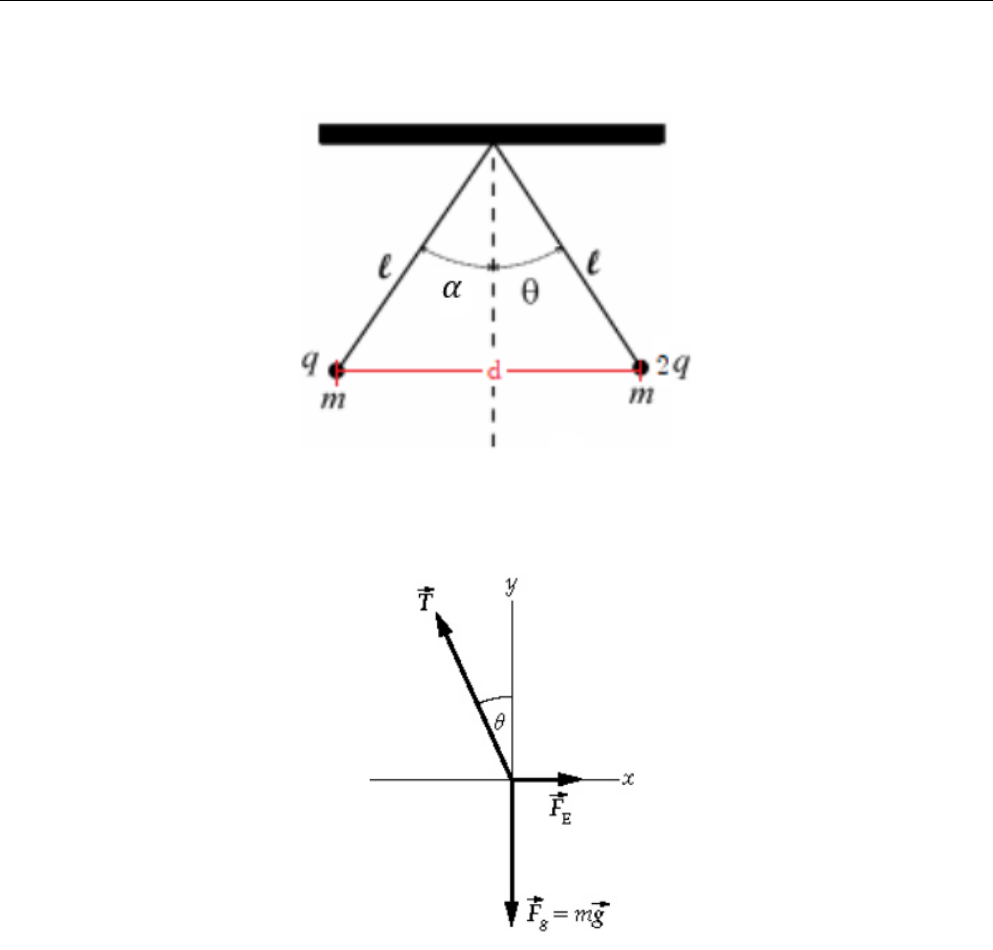 EJERCICIO ELECTRODINÁMICA Universidad Distrital Francisco José de Caldas, Facultad de Ciencias y Educación Sergio Andres Amado Holguin - 20152135033 saamadoh@correo.udistrital.edu.co Julio 22, 2020 Punto 1: Dos part́ıculas, cada una de masa m y cargas q y 2q respectivamente, están suspendidas por cuerdas de longitud l a partir de un punto en común. Encuentre el ángulo θ que forma cada una de las cuerdas con la vertical. Solución: Figura 1: Representación gráfica del problema donde d es la distancia de separacion entre part́ıculas. Cada part́ıcula está en equilibrio estático bajo la influencia de la tensión ~T , la fuerza gravitacional ~Fg y la fuerza eléctrica ~FE . Tomando la part́ıcula de la derecha (part́ıcula 2) el diagrama de fuerzas seŕıa: Figura 2: Diagrama de fuerzas para la part́ıcula derecha. 1 Universidad distrital Francisco José de Caldas. Facultad de ciencias y educación. Realizando la sumatoria de fuerzas para el equilibrio estático en la part́ıcula de la derecha tenemos que:∑ Fy = T cos θ −mg = 0 (1)∑ Fx = FE12 − T sin θ = 0 (2) Podemos usar la ley de Coulomb para relacionar la fuerza eléctrica que le produce la part́ıcula de la izquierda (part́ıcula 1) a la part́ıcula de la derecha con la carga en cada part́ıcula y la separación entre ellas, quedandonos la ecuación 2 como: 2kq2 d2 − T sin θ = 0 (3) Al despejar la tensión de la ecuación 1, obtenemos: T = mg cos θ Ingresando el resultado anterior en la ecuación 3: 2kq2 d2 − ( mg cos θ ) sin θ = 0 2kq2 d2 − (tan θ)mg = 0 tan θ = 2kq2 d2mg (4) Para la part́ıcula de la izquierda (part́ıcula 1), el diagrama de fuerzas seŕıa: Figura 3: Diagrama de fuerzas para la part́ıcula de la izquierda. Realizando la sumatoria de fuerzas para el equilibrio estático en la part́ıcula de la izquierda tenemos que:∑ Fy = T cosα−mg = 0 (5)∑ Fx = T sinα− FE21 = 0 (6) Utilizando nuevamente la ley de Coulomb podemos hallar la fuerza electrica que le produce la paŕıcula de la derecha a la de la izquierda: T sinα− 2kq 2 d2 = 0 (7) Despejando la tensión de la ecuación 5 tenemos que: T = mg cosα Electrodinámica 2 Sergio Andres Amado Holguin Universidad distrital Francisco José de Caldas. Facultad de ciencias y educación. Ingresando el resultado en la ecuación 10 tenemos:( mg cosα ) sinα− 2kq 2 d2 = 0 Llegando al mismo resultado de la ecuación 4: tanα = 2kq2 d2mg (8) Si observamos la ecuación (4) y la ecuación (8) podemos ver que el ángulo θ formado por la cuerda que contiene la part́ıcula 2 con la vertical y el ángulo α formado por la cuerda que contiene la part́ıcula 1 con la vertical son iguales. Ahora si observamos la figura 4 podemos llegar a la siguiente relación: Figura 4: Diagrama de mitad de la configuración inicial. sin θ = d 2l ⇒ d = 2l sin θ (9) Si ingresamos la ecuación (9) en (4) tenemos que: tan θ = � 2kq2 �4mgl2 sin 2 θ sin2 θ tan θ = kq2 2mgl2 (10) Si realizamos aproximaciones de ángulos pequeños tenemos que sin θ ≈ tan θ ≈ θ entonces: θ3 ≈ kq 2 2mgl2 θ ≈ 3 √ kq2 2mgl2 θ = α ≈ [ k 2mg ] 1 3 [q l ] 2 3 (11) Si no hacemos aproximaciones de ángulos pequeños, retomemos desde la ecuación 10: sin2 θ ( sin θ cos θ ) = kq2 2mgl2 sin3 θ cos θ = kq2 2mgl2 Reestructurando: ( sin3 θ cos3 θ ) cos2 θ = kq2 2mgl2 Electrodinámica 3 Sergio Andres Amado Holguin Universidad distrital Francisco José de Caldas. Facultad de ciencias y educación. tan3 θ ( cos2 θ ) = kq2 2mgl2 tan3 θ 1 cos2 θ = kq2 2mgl2 A partir de la identidad cos2 θ + sin2 θ = 1 podemos reorganizar la anterior expresión como: tan3 θ cos2 θ+sin2 cos2 θ = kq2 2mgl2 tan3 θ 1 + tan2 θ = kq2 2mgl2 Para facilidades de cálculos llamaremos ahora x = tan θ y a = kq 2 2mgl2 quedando: x3 1 + x2 = a x3 = a(1 + x2) x3 = a+ ax2 x3 − ax2 − a = 0 (12) A partir de la ecuación (12) lo que resta es obtener el valor de x, sin embargo solo se puede obtener conociendo el valor númerico de a = kq 2 2mgl2 . Al obtener x podemos obtener el valor del ángulo θ mediante la relación que anteriormente se hab́ıa definido: x = tan θ = tanα θ = α = tan−1 x (13) En conclusión hemos obtenido el valor del ángulo θ que es igual al ángulo α con la aproximación de ángulos pequeños (ecuación 11) y sin ninguna aproximación (ecuación 13), además se observa que sin importar la magnitud de las dos cargas el ángulo θ y α es el mismo. Electrodinámica 4 Sergio Andres Amado Holguin