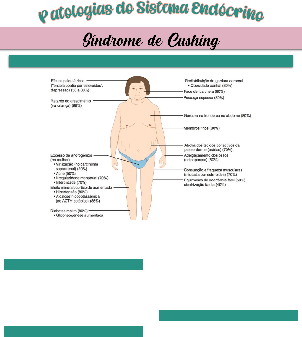 Beatriz Tianeze de Castro | SOI IV | P4 - MEDICINA Introdução Definição Condição que resulta de uma exposição prolongada a quantidades excessivas de glicocorticoides. Causas Síndrome de Cushing exógena ou iatrogênica Resultante da administração prolongada de doses suprafisiológicas de glicocorticoides. Síndrome de Cushing endógena ♦ Resulta da hiperprodução crônica de cortisol. ♦ Pode ser classificado em ACTH dependentes e ACTH independentes. Epidemiologia Mais comum em adultos na faixa de 40 a 50 anos de idade. E, é predominante no sexo feminino. Fonte: Fisiopatologia da Doença Beatriz Tianeze de Castro | SOI IV | P4 - MEDICINA Genética Introdução A maioria dos casos têm uma expressão anômala nessas glândulas de receptores hormonais, sendo uma expressão ectópica ou eutópica. Expressão Ectópica Não há receptores hormonais presentes. Expressão Eutópica Expressão aumentada dos receptores hormonais. Secreção de Cortisol Mediada por receptores para o peptídeo inibidor gástrico (GIP), vasopressina, catecolaminas, interleucina-1, leptina, hormônio luteinizante (LH), serotonina e por outros ligantes não reconhecidos. Síndrome de Cushing ACTH-dependente Definição O hipercortisolismo se origina do excesso de secreção de ACTH. Fator Etiológico ♦ Adenoma hipofisário secretor de ACTH, correspondendo a cerca de 80% dos casos. ♦ Secreção ectópica de ACTH, correspondendo aos casos restantes. Doença de Cushing Fatores de risco ♦ Predomínio no sexo feminino, entre 20 e 40 anos de idade. ♦ Na fase pré-puberal, há maior ocorrência no sexo masculino. Etiologia ♦ Microadenoma hipofisário secretor de ACTH, correspondendo a 80% dos casos. ♦ Macroadenoma hipofisário secretor de ACTH, correspondendo a 20% dos casos. Síndrome de ACTH Ectópico Fatores de risco Prevalência em homens, entre 40 e 60 anos de idade. Etiologia ♦ Carcinoides tímicos. ♦ Feocromocitoma. ♦ Carcinoma pulmonar de células pequenas, correspondendo a 12% dos casos. Beatriz Tianeze de Castro | SOI IV | P4 - MEDICINA ♦ Carcinoma de ilhotas pancreáticas. ♦ Carcinoma medular da tireoide, correspondendo a 0,6% dos casos. Síndrome de CRH Ectópico Síndrome rara, com menos de 30 casos já descritos e dificilmente diagnosticado. Além disso, é resultante da produção de CRH por tumor pancreático, feocromocitoma, carcinoma pulmonar metastático e entre outras causas. Síndrome de Cushing ACTH-independente Distúrbios Adrenais São ocasionados por um adenoma (cerca de 80%) ou um carcinoma produtor de cortisol. Carcinomas Adrenocorticais Tamanho São grandes (>6 cm) e bilaterais. Epidemiologia Representam cerca de 20% dos casos. Fatores de risco Mais comuns em mulheres, tendo picos na infância, na adolescência e ao final da vida. Adenomas Tamanho São pequenos (<3 cm) e unilaterais. Fatores de risco Ocorre com maior frequência aos 35 anos de idade em mulheres. Aspectos Clínicos Gerais ♦ Obesidade ou ganho de peso. ♦ Face de lua cheia. ♦ Fraqueza. ♦ Aumento da gordura supraclavicular/retrocervical ou giba de búfalo. Cutâneos ♦ Adelgaçamento da pele. ♦ Pletora facial. ♦ Hirsutismo/alopecia. ♦ Calvície feminina. ♦ Estrias violáceas ou purpúricas. ♦ Acne. Beatriz Tianeze de Castro | SOI IV | P4 - MEDICINA Inibição de Fibroblastos O excesso de glicocorticoides inibe os fibroblastos, resultando na perda de colágeno e tecido conectivo; e, como resultado, ocorrem adelgaçamento da pele, estrias abdominais, formação fácil de equimoses, cicatrização deficiente de feridas e infecções cutâneas frequentes. Gonadal ♦ Irregularidade menstrual. ♦ Diminuição da libido. ♦ Disfunção erétil. Neuropsiquiátricos ♦ Depressão, ansiedade ou instabilidade emocional. ♦ Cefaleia. ♦ Psicose/mania. ♦ Disfunção cognitiva. ♦ Distúrbios do sono. Musculoesqueléticos ♦ Fraqueza/atrofia muscular. ♦ Osteopenia ou fraturas. ♦ Diminuição do crescimento linear em crianças. Metabolismo Ósseo Os glicocorticoides inibem a diferenciação dos osteoblastos, induzindo a apoptose dos osteoblastos e osteócitos, enquanto prolongam a sobrevida dos osteoclastos. Metabólicos ♦ Hipertensão. ♦ Intolerância à glicose. ♦ Dislipidemia. ♦ Esteatose hepática. ♦ Nefrolitíase. ♦ Alcalose hipocalêmica. Intolerância à Glicose O excesso de cortisol promove a síntese de glicose no fígado a partir dos aminoácidos liberados pelo catabolismo das proteínas. Hipertensão Pode ocorrer pela retenção de sal e água, que é ocasionada pelos efeitos mineralocorticoides dos glicocorticoides; ou, então, pela secreção aumentada de angiotensinogênio. Beatriz Tianeze de Castro | SOI IV | P4 - MEDICINA Tratamento Cetoconazol Inibe a síntese de colesterol e os níveis de colesterol circulante. Levocetoconazol Inibe a síntese de colesterol e os níveis de colesterol circulante. Fluconazol Inibe a 11β-hidroxilase e a atividade da 17β-hidroxilase, além de bloquear a produção de cortisol em culturas primárias do córtex adrenal humano. Metirapona Inibe a conversão do desoxicortisol, bem como da desoxicorticosterona em corticosterona, por inibição da 11β- hidroxilase. Osilodrostat Inibidor da 11β-hidroxilase e da aldosterona sintase, ou seja, inibidor das etapas finais na síntese de cortisol e aldosterona. Etomidato Age como o cetoconazol, mas é o único que inibe a esteroidogênese adrenal. Referência HAMMER, G. D.; MCPHEE, S. J. Fisiopatologia da doença: uma introdução à medicina clínica. 7. ed. Porto Alegre: AMGH, 2016. VILAR, L.; KATER, C. E. Endocrinologia Clínica. 7ª edição. Guanabara Koogan. Rio de Janeiro, 2021.