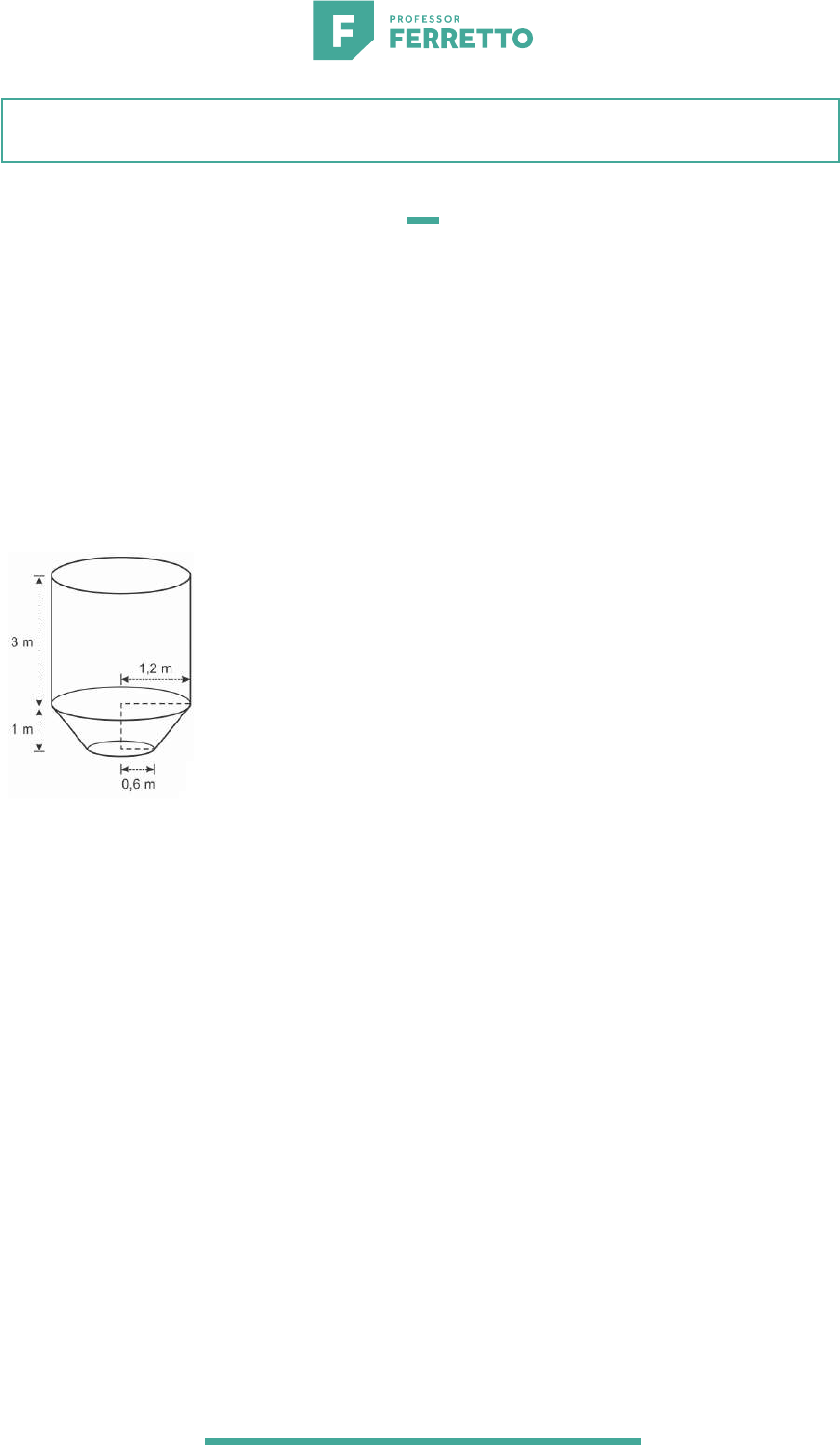 1 Questão 1 – Cilindro / tronco de cone (Upf) Um reservatório de água tem formato de um cilindro circular reto de 3 m de altura e base com 1,2 m de raio, seguido de um tronco de cone reto cujas bases são círculos paralelos, de raios medindo 1,2 m e 0,6 m respectivamente, e altura 1 m, como representado na figura a seguir. Nesse reservatório, há um vazamento que desperdiça 1/3 do seu volume por semana. Considerando a aproximação 𝜋 ≅ 3, esse vazamento semanal é de: a) 4.320 litros. b) 15,48 litros. c) 15.480 litros. d) 12.960 litros. e) 5.160 litros. SUPER AULA DE GEOMETRIA ESPACIAL 2 Questão 2 – Cilindro / esfera (Unesp) Um troféu para um campeonato de futebol tem a forma de uma esfera de raio R = 10 cm cortada por um plano situado a uma distância de 5 √3 cm do centro da esfera, determinando uma circunferência de raio r cm, e sobreposta a um cilindro circular reto de 20 cm de altura e raio r cm, como na figura (não em escala). O volume do cilindro, em cm3, é a) 100 𝜋 b) 200 𝜋 c) 250 𝜋 d) 500 𝜋 e) 750 𝜋 Questão 3 – Tetraedro regular / triângulo retângulo (Fuvest) Em um tetraedro regular de aresta medindo 𝑎, a distância entre os pontos médios de duas arestas não adjacentes é igual a a) a√3 b) a√2 c) (√) * d) (√* * e) (√* + 3 Questão 4 – Cone / semelhança de triângulos / função (Uerj) Um recipiente com a forma de um cone circular reto de eixo vertical recebe água na razão constante de 1 cm3/s. A altura do cone mede 24 cm, e o raio de sua base mede 3 cm. Conforme ilustra a imagem, a altura h do nível da água no recipiente varia em função do tempo t em que a torneira fica aberta. A medida de h corresponde à distância entre o vértice do cone e a superfície livre do líquido. Admitindo 𝜋 ≅ 3, a equação que relaciona a altura h, em centímetros, e o tempo t, em segundos, é representada por: a) h = 4√𝑡- b) h = 2√𝑡- c) h = 2√𝑡 d) h = 4√𝑡 Questão 5 – Paralelepípedo / trapézio (Fuvest) Uma empresa estuda cobrir um vão entre dois prédios (com formato de paralelepípedos reto-retângulos) que têm paredes laterais paralelas, instalando uma lona na forma de um quadrilátero, com pontas presas nos pontos A, B, C e D, conforme indicação da figura. 4 Sabendo que a lateral de um prédio tem 80 m de altura e 28 m de largura, que a lateral do outro prédio tem 60 m de altura e 20 m de largura e que essas duas paredes laterais distam 15 m uma da outra, a área total dessa lona seria de a) 300 m2 b) 360 m2 c) 600 m2 d) 720 m2 e) 1.200 m2 Questão 6 – Esfera / razões trigonométricas no triângulo retângulo / setor circular (Unesp) Observe a figura da representação dos pontos M e N sobre a superfície da Terra. Considerando a Terra uma esfera de raio 6.400 km e adotando 𝜋 = 3, para ir do ponto M ao ponto N, pela superfície da Terra e no sentido indicado pelas setas, a distância percorrida sobre o paralelo 60° Norte será igual a a) 2.100 km. b) 1.600 km. c) 2.700 km. d) 1.800 km. e) 1.200 km. 5 Questão 7 – Cone / círculo / setor circular (Fuvest) Deseja-se construir um cone circular reto com 4 cm de raio da base e 3 cm de altura. Para isso, recorta-se, em cartolina, um setor circular para a superfície lateral e um círculo para a base. A medida do ângulo central do setor circular é: a) 144° b) 192° c) 240° d) 288° e) 336° Questão 8 – Pirâmide / paralelepípedo (Fuvest) O sólido da figura é formado pela pirâmide SABCD sobre o paralelepípedo reto ABCDEFGH. Sabe-se que S pertence à reta determinada por A e E e que 𝐴𝐸 = 2 cm, 𝐴𝐷 = 4 cm e 𝐴𝐵 = 5 cm. A medida do segmento SA que faz com que o volume do sólido seja igual a 4/3 do volume da pirâmide SEFGH é a) 2 cm b) 4 cm c) 6 cm d) 8 cm e) 10 cm 6 Questão 9 – Cone / tronco de cone (Fuvest) Um reservatório de água tem o formato de um cone circular reto. O diâmetro de sua base (que está apoiada sobre o chão horizontal) é igual a 8 m. Sua altura é igual a 12 m. A partir de um instante em que o reservatório está completamente vazio, inicia-se seu enchimento com água a uma vazão constante de 500 litros por minuto. O tempo gasto para que o nível de água atinja metade da altura do reservatório é de, aproximadamente, a) 4 horas e 50 minutos. b) 5 horas e 20 minutos. c) 5 horas e 50 minutos. d) 6 horas e 20 minutos. e) 6 horas e 50 minutos. Questão 10 – Cilindro (Fuvest) Uma metalúrgica fabrica barris cilíndricos de dois tipos, A e B, cujas superfícies laterais são moldadas a partir de chapas metálicas retangulares de lados a e 2a, soldando lados opostos dessas chapas, conforme ilustrado a seguir. 7 Se VA e VB indicam os volumes dos barris do tipo A e B, respectivamente, tem-se: a) VA = 2VB b) VB = 2VA c) VA = VB d) VA = 4VB e) VB = 4VA Anotações: