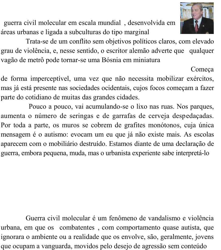 A GUERRA CIVIL MOLECULAR (1) Jorge P. Mones Ruiz Traduzido por Luís Mauro Ferreira Gomes Hans Magnus Enzensberger, em seu ensaio “Pers- pectiva de uma Guerra Civil” (1994), lançou o conceito de “guerra civil molecular em escala mundial”, desenvolvida em áreas urbanas e ligada a subculturas do tipo marginal. Trata-se de um conflito sem objetivos políticos claros, com elevado grau de violência, e, nesse sentido, o escritor alemão adverte que “qualquer vagão de metrô pode tornar-se uma Bósnia em miniatura”. O desenvolvimento dessa guerra é, no início, incruento. Começa de forma imperceptível, uma vez que não necessita mobilizar exércitos, mas já está presente nas sociedades ocidentais, cujos focos começam a fazer parte do cotidiano de muitas das grandes cidades. “Pouco a pouco, vai acumulando-se o lixo nas ruas. Nos parques, aumenta o número de seringas e de garrafas de cerveja despedaçadas. Por toda a parte, os muros se cobrem de grafites monótonos, cuja única mensagem é o autismo: evocam um eu que já não existe mais. As escolas aparecem com o mobiliário destruído. Estamos diante de uma declaração de guerra, embora pequena, muda, mas o urbanista experiente sabe interpretá-lo”. O verdadeiramente mais grave nesse tipo de conflito é que não é regulado pelo direito internacional, uma vez ocorre dentro dos Estados, pelo que a aplicação do direito humanitário se torna impraticável; e o que é pior, o agressor não reconhece as leis reguladoras, nem lhe interessa a ilicitude de seus atos. As Características (2) Guerra civil molecular é um fenômeno de vandalismo e violência urbana, em que os “combatentes”, com comportamento quase autista, que ignorara o ambiente ou a realidade que os envolve, são, geralmente, jovens que ocupam a vanguarda, movidos pelo desejo de agressão sem conteúdo. Ocorre em áreas caracterizadas pela degradação do meio ambiente, em favelas, em bairros negligenciados ou em regiões empobrecidas, que permitem o aparecimento dos espaços liberados, onde o controle pelo Esta- do é baixo ou mesmo nulo. Se este deixa de exercer o monopólio do poder, Suely Realce Suely Realce Suely Realce Suely Realce 2 e as instituições estatais abdicam das suas funções específicas, as opções da população afetada são fugir ou autoproteger-se. A Guerra Civil molecular é um grau de fragmentação social que põe em risco o exercício do monopólio da violência por parte do Estado. Para analisarmos como isso acontece, estabeleceremos as fases de seu desenvolvimento e de sua evolução. Esta especulação teórica nos per- mitirá determinar o estado atual da situação global, regional e, particular- mente como fenômeno, da Argentina. Da mesma forma que em qualquer construção teórica, os aspectos assinalados em cada fase não são estanques, admitem combinação interfásica. Cada fase é uma situação dinâmica de caos, onde se atravessam etapas, avançando ou retrocedendo, expandindo-se ou contraindo-se, de acordo com a resposta contentora imposta pelo aparato do Estado e com a percepção da relação caos versus ordem, captada por toda a sociedade. Fase Zero: A Paz Os habitantes do Estado vivem normalmente, planejam suas vidas sem grandes sobressaltos e ajustam suas condutas às normas vigentes. Existe um evidente império da lei e da ordem, sem conflitos ou eventos violentos que escapem do controle do Estado. Podem acontecer situações de crise, com a perda ou o enfraqueci- mento das capacidades políticas, burocráticas e administrativas para reali- zar, normalmente, as funções básicas do Estado (p. ex.: desastres climáti- cos, tropeços financeiros, epidemias, ataques externos, casos pontuais de corrupção em algum poder do Estado). Mas esses tipos de crise são transi- tórios e, por isso, reforçam confiança nas instituições públicas. Fase Um: A crise crônica ou a falsa normalidade Os problemas que não se resolvem geram mais problemas. Depois que a crise política (econômica ou social) se instala, ela se torna crônica. Essa crise gera um sentimento inicial de falsa normalidade, alimentado pela a vontade e pela esperança de se encontrar uma solução. Mas, logo, o povo percebe que o Estado não pode dar uma resposta imediata e decai a confiança. Podemos dizer que, nesta fase, a crise é de natureza cultural, já que começa a diminuir o grau de adesão às normas em vigor e se cria uma cultura anti- jurídica progressiva, baseada na transgressão às leis e no uso de remédios excepcionais. O Estado entra em crise com a deterioração de seus embasa- mentos morais e se retira. Embora a crise possa escalar para formas de Suely Realce Suely Realce Suely Realce 3 solução violentas, a guerra civil molecular começa a lançar as bases de maneira sutil. Fase dois: A crise A degradação do aparato estatal provoca a deterioração dos parâ- metros de segurança interna. A indolência, o desinteresse, a falta de incen- tivos, as ações preguiçosas e sem vocação começam a manifestar-se nas instituições do Estado que devem garantir a segurança. Evitar que a crise se estenda depende da liderança que se tenha. As responsabilidades das insti- tuições de segurança se não exercem, seja por omissão, seja por tolerância passiva, em troca de benefícios. Os funcionários do Estado envolvem-se de forma direta, como protagonistas, em operações delituosas. Deixa-se de confiar nas forças da ordem e na justiça. Fase três: Pré-“Guerra Civil Molecular” Nesta fase, multiplicam-se os espaços fora dos limites do Estado, as zonas liberadas. A indolência, seguida de omissão e comissão, conduz, inevitavelmente, à perda do manejo da segurança interna por parte do apa- rato estatal. Generalizam-se as medidas de autodefesa (posse de armas; grades; cadeados; portas, carros e coletes blindados), aumenta a formação de bairros fechados por setores de alto nível sócio-econômico, e torna-se habit