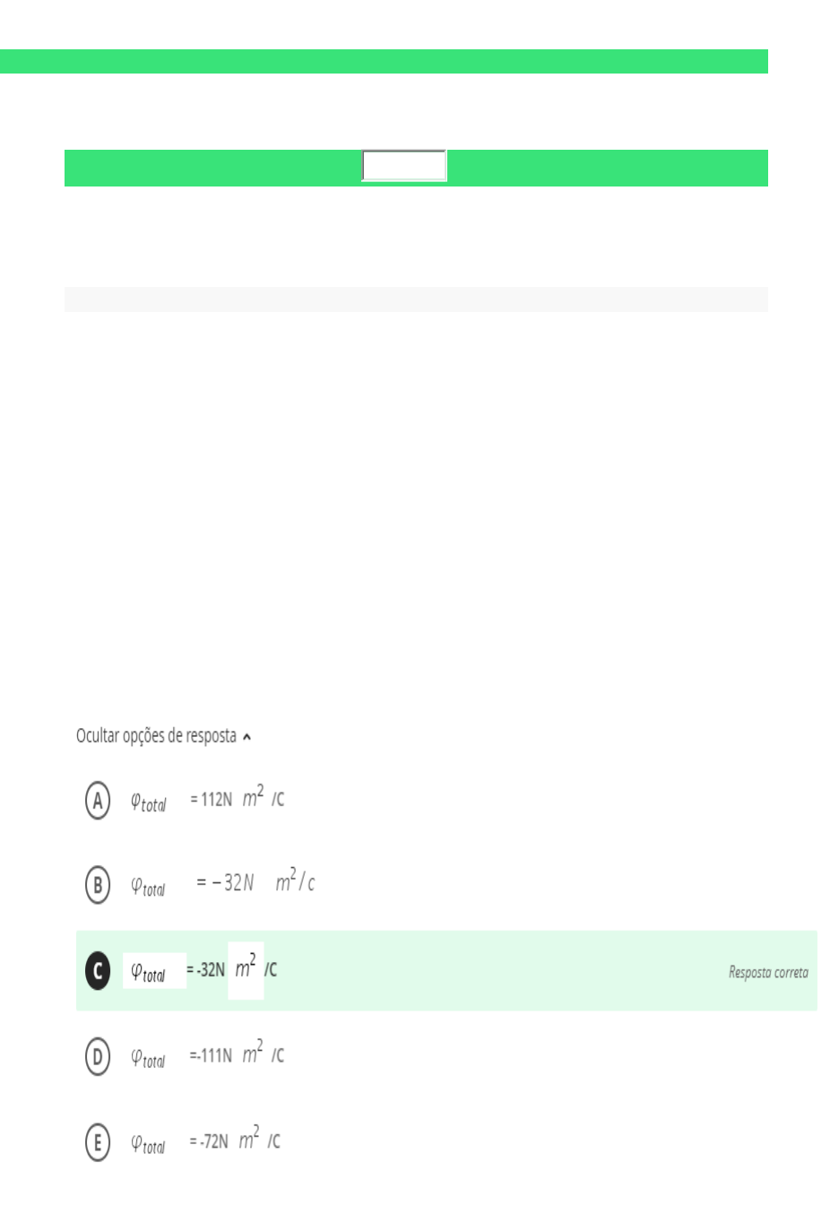 Avaliação On-Line 2 (AOL 2) Questionário 9/10 1. Pergunta 1 /1 Analise a figura a seguir: quetão 8.PNG A Lei de Gauss nos auxilia a descrever o fluxo do campo elétrico em uma superfície gaussiana. Um campo elétrico dado por , em que está em N/C (newtons/Coulomb) e y está em metros, atravessa um cubo gaussiano com 2,0 m de aresta, posicionado conforme mostra a figura. Considerando essas informações e o conteúdo estudado, em relação à situação apresentada, pode-se afirmar que o fluxo total ( ) que atravessa o cubo é de: Ocultar opções de resposta obs. Resposta correta e aquela que tem menor espaçamento entre o N,m² 2. Pergunta 2 /1 Capacitor é um disposto de armazenamento de carga elétrica. De forma genérica, os capacitores são formados por placas posicionadas paralelamente uma em relação a outra, onde as carga são armazenadas. Podem ter diferentes formatos geométricos e capacidades. Considerando essas informações e o conteúdo estudado sobre capacitores, analise as afirmativas a seguir: I. As placas de um capacitor são feitas de material isolante, por isso as cargas permanecem em sua superfície. II. A capacitância determina a quantidade de carga que deve ser acumulada para atingir determinada diferença de potencial. III. Um capacitor carregado possui carga total zero. IV. A capacitância depende da carga e da diferença de potencial entre as placas. V. A diferença de potencial entre as placas de um capacitor é proporcional a sua carga. Está correto apenas o que se afirma em: Ocultar opções de resposta 1. I, III e IV 2. II, III, IV e V 3. I, II e V 4. II, III e V Resposta correta 5. III, IV e V 3. Pergunta 3 /1 Analise o quadro a seguir: img_ELETRICIDADE E MAGNETISMO_02- QUESITO 20.PNG Os dielétricos são materiais isolantes, geralmente colocados entre as placas que constituem o capacitor para aumentar sua capacitância. Diferentes tipos de materiais dielétricos são disponibilizados comercialmente. Um determinado capacitor não possui preenchimento entre as placas condutoras, possuindo uma capacitância de 7,4 pF. Você deseja aumentar a energia potencial deste capacitor para 2,4 µJ, obtendo uma diferença de potencial de 500 V. Considerando a situação e o conteúdo estudado, qual alternativa representa um dos materiais dielétricos do quadro para obter o capacitor desejado? Ocultar opções de resposta 1. Água (25ºC) 2. Água (20ºC) 3. Porcelana 4. Pirex 5. Poliestireno Resposta correta 4. Pergunta 4 /1 O dipolo elétrico é um par de cargas de mesmo módulo, porém uma carga é positiva e outra é negativa. Em um dipolo, a distância entre as cargas é muito pequena em relação ao ponto onde se mede o campo elétrico, por isso a carga “q” do dipolo e a distância “d” entre elas dificilmente podem ser medidas separadamente. Assim, o que se mede em um dipolo elétrico é o produto entre “q” e “d”, sendo definido como momento dipolar. Considerando essas informações e o conteúdo estudado, analise as afirmativas a seguir e assinale V para a(s) verdadeira(s) e F para a(s) falsa(s): I. ( ) O momento dipolar é uma grandeza escalar. II. ( ) O momento dipolar pode ser medido em “C.m”. III. ( ) O momento dipolar combina duas propriedades intrínsecas de um dipolo elétrico, a distância entre as cargas e a carga dos objetos que formam o dipolo. IV. ( ) O momento dipolar aponta da carga positiva para a carga negativa do dipolo. V. ( ) A orientação do momento dipolar indica a orientação do dipolo. Agora, assinale a alternativa que apresenta a sequência correta: Ocultar opções de resposta 1. F, V, V, F, V Resposta correta 2. F, V, V, V, F 3. V, V, F, F, V 4. F, V, F, V, V 5. F, F, V, F, V 5. Pergunta 5 /1 Leia o excerto a seguir: “Calculamos a energia potencial gravitacional U de um objeto (1) atribuindo arbitrariamente o valor U = 0 a uma configuração de referência (como a posição de um objeto no nível do solo), (2) determinando o trabalho W que a força gravitacional realiza quando o objeto é deslocado para outro nível e (3) definindoa energia potencial pela equação: U = -W.” Fonte: HALLIDAY, D.; RESNICK, R.; WALKER, J. Fundamentos de física: Eletromagnetismo. 10. ed. Rio de Janeiro: Livros Técnicos e Científicos, 2016. v. 3. Considerando essas informações e o conteúdo estudado sobre energia potencial elétrica, analise as asserções a seguir e a relação proposta entre elas. I. A energia potencial elétrica é análoga à energia potencial gravitacional. Porque: II. A força elétrica e a força gravitacional são forças conservativas. A seguir, assinale a alternativa correta: Ocultar opções de resposta 1. As asserções I e II são proposições verdadeiras, e a II é uma justificativa correta da I Resposta correta 2. A asserção I é uma proposição falsa, e a asserção II é uma proposição verdadeira 3. As asserções I e II são proposições verdadeiras, mas a II não é uma justificativa correta da I 4. As asserções I e II são proposições falsas 5. A asserção I é uma proposição verdadeira, e a asserção II é uma proposição falsa 6. Pergunta 6 /1 Analise a figura a seguir: img_ELETRICIDADE E MAGNETISMO_02- QUESITO 17.PNG Os capacitores podem ser formados por um conjunto de capacitores, que podem estar associados em série, em paralelo ou ambos. A capacitância do conjunto de capacitores será dada por uma soma das capacitâncias de cada capacitor. A figura apresenta o esquema de três capacitores inicialmente descarregados. Cada um dos capacitores possui capacitância de 25 µF. Ao fechar a chave do circuito, uma diferença de potencial de 4200 V é estabelecida. Considerando essas informações e o conteúdo estudado sobre capacitância, pode-se afirmar que a carga total medida pelo medidor A é de: Ocultar opções de resposta 1. q = 105000 C 2. q = 0,315 C Resposta correta 3. q = 0,105 C 4. Incorreta: q = 315 µC 5. q = 315000 C 7. Pergunta 7 /1 Analise a figura a se