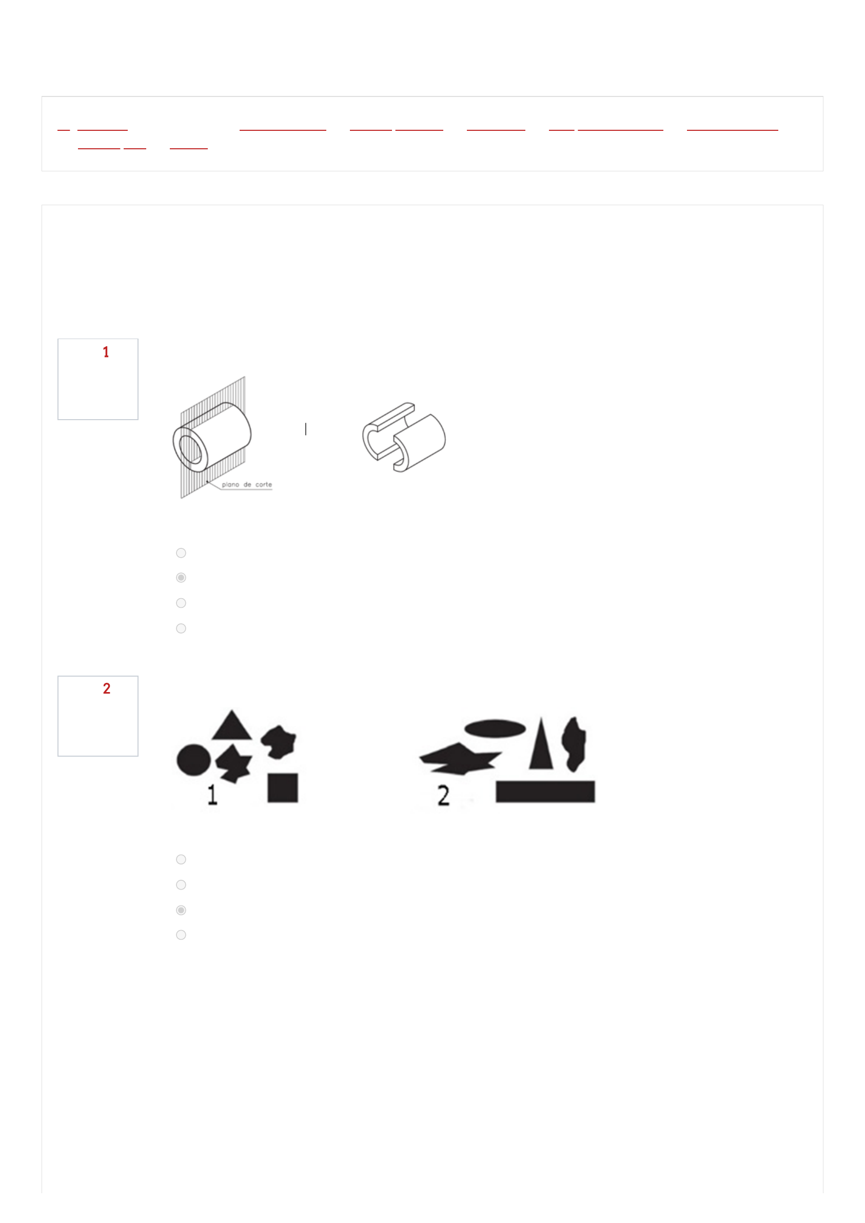 16/02/2021 PROVA https://ava.funec.br/mod/quiz/review.php?attempt=91099&cmid=5836 1/9 Página inicial / Meus cursos / CURSOS FUNEC / Graduação - EAD / Aluno EAD / JUNÇÕES DE TURMA / Desenho Técnico / AVALIAÇÕES / PROVA Questão 1 Completo Atingiu 3,00 de 3,00 Questão 2 Completo Atingiu 3,00 de 3,00 Iniciado em Tuesday, 16 Feb 2021, 21:14 Estado Finalizada Concluída em Tuesday, 16 Feb 2021, 22:24 Tempo empregado 1 hora 10 minutos Avaliar 57,00 de um máximo de 60,00(95%) Marque a alternativa que caracteriza sobre cortes no desenho técnico: Escolha uma opção: a. Corte é desenho de fachada para visualizar a altura do mesmo. b. Cortar quer dizer dividir, secionar, separar partes de um todo. Fazer o corte no desenho é visualizar. c. A vista de topo pode ser chamada de corte. d. A vista superior do desenho, tem como aspecto de corte mostrando sua altura. As formas abaixo representam quanto a direção, respectivamente: Escolha uma opção: a. Circulares e Lineares. b. Centroidais e Circulares. c. Centroidais e Lineares. d. Radiais e Circulares. https://ava.funec.br/ https://ava.funec.br/course/index.php?categoryid=10 https://ava.funec.br/course/index.php?categoryid=17 https://ava.funec.br/course/index.php?categoryid=19 https://ava.funec.br/course/index.php?categoryid=77 https://ava.funec.br/course/view.php?id=366 https://ava.funec.br/course/view.php?id=366#section-5 https://ava.funec.br/mod/quiz/view.php?id=5836 16/02/2021 PROVA https://ava.funec.br/mod/quiz/review.php?attempt=91099&cmid=5836 2/9 Questão 3 Completo Atingiu 3,00 de 3,00 Questão 4 Completo Atingiu 3,00 de 3,00 Com a parte anterior do modelo removida. Você poderá visualizar com maior facilidade os elementos atingidos pelo corte. Como é chamado essa projeção de acordo com desenho abaixo? Escolha uma opção: a. Projeção de linha. b. Projeção do Corte. c. Projeção de cobertura d. Projeção da Planta baixa Analise as perspectivas representada abaixo e assinale a alternativa correta com relação a vistas ortográficas correspondente: Coloque na sequência das letras correspondente a cada perspectiva. Escolha uma opção: a. Resposta b, c, e, f, a, d b. Resposta b, c, a, d, e, f c. Resposta b, c, f, e, a, d d. Resposta b, c, a, d, f, e 16/02/2021 PROVA https://ava.funec.br/mod/quiz/review.php?attempt=91099&cmid=5836 3/9 Questão 5 Completo Atingiu 3,00 de 3,00 Questão 6 Completo Atingiu 3,00 de 3,00 Marque a alternativa que caracteriza a figura abaixo, tendo como base a vista do observador no plano de Sistema de Representação Gráfica do 1º Diedro: Escolha uma opção: a. Vista Lateral Esquerda b. Vista frontal c. Vista Superior d. Vista de Topo Analise as vistas ortográficas abaixo e assinale a alternativa que corresponde ao mesmo modelo em perspectiva. Escolha uma opção: a. b. c. d. 16/02/2021 PROVA https://ava.funec.br/mod/quiz/review.php?attempt=91099&cmid=5836 4/9 Questão 7 Completo Atingiu 3,00 de 3,00 Questão 8 Completo Atingiu 0,00 de 3,00 Questão 9 Completo Atingiu 3,00 de 3,00 Conforme desenho abaixo. Analise a elementos de cotagem no desenho técnico. Marque a alternativa correta. Escolha uma opção: a. Face de Referência. b. Face de linha c. Linha básica d. Linha de Referência Conforme desenho abaixo. Analise e responda qual tipo de perspectiva é essa. Escolha uma opção: a. Perspectiva Cônica. b. Perspectiva com ponto de fuga. c. Perspectiva Isométrica. d. Perspectiva Cavaleira. Marque a alternativa que caracteriza a idealização e concepção da forma conforme desenho, conforme está apresentado dentro da apostila de Desenho Técnico: Escolha uma opção: a. Ponto. b. Volume. c. Linha. d. Plano. 16/02/2021 PROVA https://ava.funec.br/mod/quiz/review.php?attempt=91099&cmid=5836 5/9 Questão 10 Completo Atingiu 3,00 de 3,00 Questão 11 Completo Atingiu 3,00 de 3,00 Marque a alternativa que tem o nome das representações na sequência das figuras abaixo. Escolha uma opção: a. Isometria, cavaleira, Mongeano, axonometria cônica. b. Isometria, cavaleira, Axonometria cônica, e Mongeano. c. Axonometria cônica, Isometria, cavaleira e Mongeano. d. Axonometria cônica, cavaleira, isometria, Mongeano. O que indica as linhas com a seta e as letras AA ou BB. Marque a alternativa correta. Escolha uma opção: a. Indicam altura do pé direito no corte. b. Indicam linhas do desenho. c. Indicam altura da linha. d. Indicam a direção do corte. 16/02/2021 PROVA https://ava.funec.br/mod/quiz/review.php?attempt=91099&cmid=5836 6/9 Questão 12 Completo Atingiu 3,00 de 3,00 Questão 13 Completo Atingiu 3,00 de 3,00 No caso de uma perspectiva realizada com dois pontos de fuga. Como se caracteriza de acordo com a apostila os dois pontos de fuga. Escolha uma opção: a. A perspectiva de dois pontos de fuga, é mesma perspectiva cavaleira. b. Cada face da figura (neste caso o quadrado) se estendem com linhas imaginárias que se unem em dois pontos de fuga localizados a ambos lados do objeto e sobre a linha do Horizonte. Bem seja que o objeto esteja acima da linha do horizonte ou abaixo da mesma. c. A perspectiva de dois pontos de fuga, são linhas somente em ângulos de 30º. d. A perspectiva de dois pontos de fuga é mesma de isométrica. Analise a perspectiva representada abaixo e assinale a alternativa correta com relação a vistas ortográficas correspondente: Escolha uma opção: a. b. c. 16/02/2021 PROVA https://ava.funec.br/mod/quiz/review.php?attempt=91099&cmid=5836 7/9 Questão 14 Completo Atingiu 3,00 de 3,00 Questão 15 Completo Atingiu 3,00 de 3,00 Questão 16 Completo Atingiu 3,00 de 3,00 Conforme desenho abaixo. Analise a elementos de cotagem no desenho técnico. Marque a alternativa correta. Escolha uma opção: a. Cotagem linha básica. b. Face de referência. c. Anotação de linha. d. Somente linhas. Marque a alternativa que caracteriza as duas figuras abaixo, tendo como base a vista do observador no plano de Sistema de Representação Gráfica do 1º Diedro: Escolha uma opç