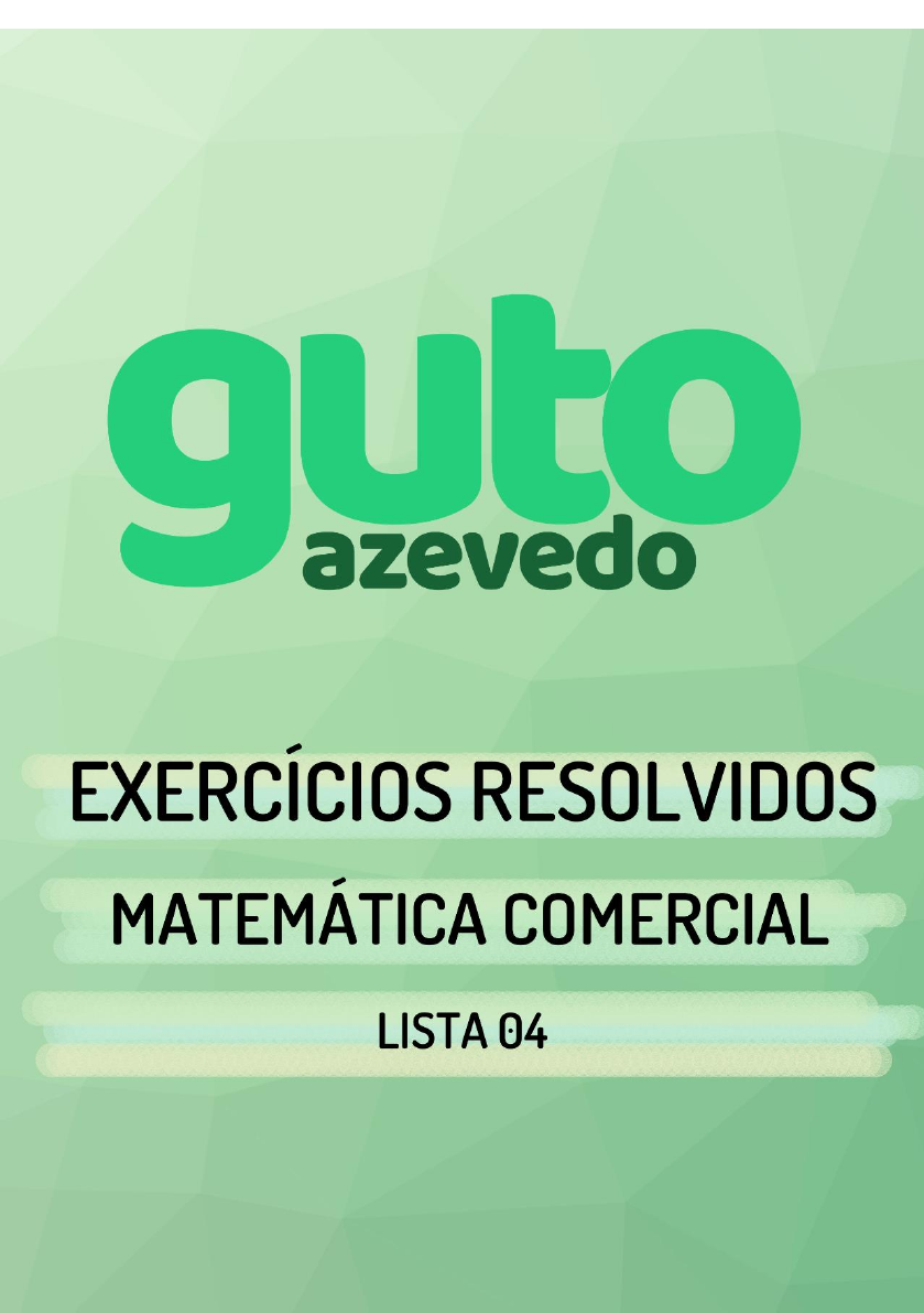 EXERCÍCIOS RESOLVIDOS Matemática Comercial | Lista 04 Clique nos ícones a seguir para acessar meu canal no YouTube, minha página no Instagram, Facebook, Pinterest e também para se inscrever no meu canal no Telegram: 1. (UFMG-2003) Um fabricante de papel higiênico reduziu o comprimento dos rolos de 40m para 30m. No entanto o preço dos rolos de papel higiênico, para o consumidor, manteve-se constante. Nesse caso, é CORRETO afirmar que, para o consumidor, o preço do metro de papel higiênico teve um aumento A) inferior a 25%. B) superior ou igual a 30%. C) igual a 25%. D) superior a 25% e inferior a 30%. 2. (UFMG) O preço à vista de uma blusa é de R$ 10,00. Um comprador pagou R$ 5,00 de entrada e R$ 6,00 após um mês. A taxa mensal de juros cobrada pela loja é A) 5%. B) 10%. C) 15%. D) 20%. E) 25%. https://goo.gl/i0yKEf https://instagram.com/auladoguto https://facebook.com/auladoguto http://pinterest.com/auladoguto http://t.me/auladoguto 3. (UFMG) No ano passado, uma equipe de 13 professores, com um ritmo de trabalho suposto constante, corrigiu 3000 provas em 6 dias. Este ano, o número de provas aumentou para 5500 e a equipe foi ampliada para 15 professores. Para se obter uma estimativa do número n de dias necessários para totalizar a correção, suponha que, durante todo o período de correção, o ritmo de trabalho da equipe deste ano será o mesmo da equipe do ano passado. O número n satisfaz a condição A) n 8. B) 8 < n 10. C) 10 < n 12. D) n > 12. 4. (PUC) Numa prova de Matemática, João ganhou 15 pontos a mais que Pedro. A diferença entre a média aritmética e a média geométrica desses pontos é 2 5 . Então, o número de pontos obtidos Por João, nessa prova, foi A) 20. B) 25. C) 30. D) 35. 5. (UFMG Um investidor aplicou R$ 500.000,00 em poupança. As taxas de juros foram 25% no primeiro mês e 28% no segundo mês. Nessas condições, o valor acumulado ao final desses 2 meses é A) R$ 765.000,00. B) R$781.250,00. C) R$ 800.000,00. D) R$819.200,00. E) R$ 900.000,00. GABARITO 1 2 3 4 5 B D B A C RESOLUÇÃO – QUESTÃO 01 RESOLUÇÃO – QUESTÃO 02 RESOLUÇÃO – QUESTÃO 03 RESOLUÇÃO – QUESTÃO 04 RESOLUÇÃO – QUESTÃO 05