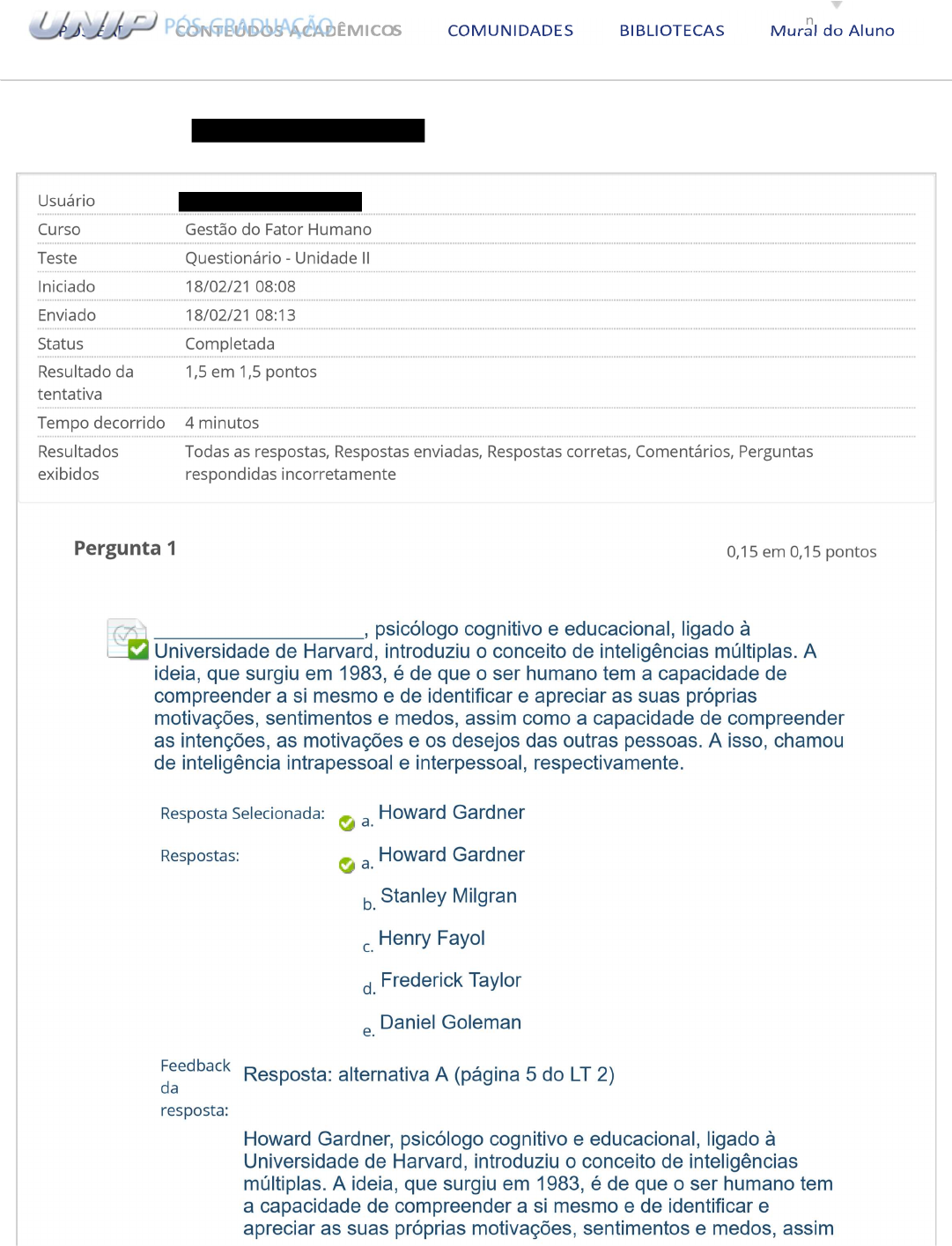 18/02/2021 Revisar envio do teste: Questionário - Unidade II – ... https://ava.ead.unip.br/webapps/assessment/review/review.jsp?attempt_id=_55170178_1&course_id=_93683_1&content_id=_1287924_1&return_co… 1/15 Gestão do Fator Humano 14569-40EI-ED11311_06_12-202032 Unidade II Revisar envio do teste: Questionário - Unidade II 1 18/02/2021 Revisar envio do teste: Questionário - Unidade II – ... https://ava.ead.unip.br/webapps/assessment/review/review.jsp?attempt_id=_55170178_1&course_id=_93683_1&content_id=_1287924_1&return_co… 2/15 como a capacidade de compreender as intenções, as motivações e os desejos das outras pessoas. A isso, chamou de inteligência intrapessoal e interpessoal, respectivamente Pergunta 2 0,15 em 0,15 pontos Mundo VUCA é um termo utilizado no mundo dos negócios e pode ser aplicado em todo tipo de organização. Originalmente, foi utilizado pelo exército americano. Basicamente, diz respeito: I. à gestão em cenários de riscos complexos; II. à relação com a capacidade de sobreviver ao caos; III. aos empregados se tornarem um fator de produção cujos custos deveriamser administrados tão racionalmente quanto os custos de outros fatores de produção; IV. à necessidade de investimento em treinamento e desenvolvimento. Estão corretas as alternativas: Resposta Selecionada: c. I e II Respostas: a. I e III b. II, III e IV c. I e II d. II e III e. III e IV Feedback Resposta: alternativa C. (Slides 8 e 9 – VD2 - unidade 1) da resposta: Podemos perceber muitas mudanças nas últimas décadas, em todas as áreas de nossas vidas, inclusive na forma como fazemos gestão e nos relacionamos. Se as coisas mudam a toda hora e cada vez mais rapidamente, não podemos continuar inertes sem acompanhar. Não podemos manter a mesma forma de fazer negócios, de comunicar, de se relacionar, de contratar etc. mundo vuca é um termo utilizado no mundo dos negócios e pode ser aplicado em todo tipo de organização. Originalmente foi utilizado 18/02/2021 Revisar envio do teste: Questionário - Unidade II – ... https://ava.ead.unip.br/webapps/assessment/review/review.jsp?attempt_id=_55170178_1&course_id=_93683_1&content_id=_1287924_1&return_co… 3/15 pelo exército americano. Basicamente envolve a gestão de riscos em cenários complexos e a nossa relação com a capacidade de sobreviver ao caos. Volátil – muda com velocidade absurda (exemplo 1: ciclo de vida cada vez mais curtos de produtos; exemplo 2: o rádio levou quase quarenta anos para atingir 50 milhões de usuários; a TV levou treze anos; a internet quatro anos; o Instagram, seis meses e o Pokémon, vinte e dois dias). incerto – dificuldade de prever onde estaremos ou onde as empresas estarão em alguns anos. Há algum tempo era possível fazer planejamento estratégico e projetar o futuro das organizações para dez ou vinte anos. Hoje não. complexo – tudo está cada vez mais conectado e interdependente. Como podemos identificar a relação das coisas? Está cada vez mais difícil explicar o mundo de forma linear. ambíguo – temos muitas interpretações para as mesmas coisas e vários sentidos para a mesma situação Pergunta 3 0,15 em 0,15 pontos Gardner sugeriu que as habilidades humanas não são organizadas de forma horizontal, que deem a impressão de ser algo geral e único. Propôs que existem várias formas independentes de percepção, memória e aprendizado em cada uma das áreas ou domínio. Ou seja, a inteligência tinha um “todo” que era composto por “partes”. Quais são os pressupostos que sustentaram o desenvolvimento de sua ideia? I. Quando ocorrem prejuízos, com dano cerebral em uma das áreas, não sãotodas as capacidades do ser que são danificadas. II. A existência de gênios ou indivíduos eminentes com habilidades especiais,nos quais pode ser observada uma habilidade isolada. III. A facilidade de algumas pessoas comuns em relação aos ritmos propostospela música e essa mesma pessoa ter dificuldades em relação aos símbolos. IV. O desenvolvimento diferenciado de cada indivíduo, dependendo de sua história de vida. V. A inteligência espacial desenvolvida nos mamíferos ou a inteligência musical desenvolvida nos pássaros. VI. A inteligência emocional é uma habilidade estática que dificilmente podeser desenvolvida em indivíduos normais. Estão corretas as alternativas: Resposta Selecionada: d. I, II, III, IV e V 18/02/2021 Revisar envio do teste: Questionário - Unidade II – ... https://ava.ead.unip.br/webapps/assessment/review/review.jsp?attempt_id=_55170178_1&course_id=_93683_1&content_id=_1287924_1&return_co… 4/15 Respostas: a. I, II, III e IV b. II, III, IV, V e VI c. I, II, III, IV e VI d. I, II, III, IV e V e. II, III, V e VI Feedback Resposta: alternativa D (páginas 10 e 11 do LT 2) da resposta: Foram cinco pressupostos que sustentaram a ideia inteligências múltiplas, de Howard Gardner. Assim, ele buscou compreender o que é inteligência a partir das origens biológicas da habilidade para resolver problemas. Em sua pesquisa, o estudioso se debruçou sobre o desenvolvimento de diferentes habilidades em crianças normais e em crianças superdotadas, em adultos com lesões cerebrais e em populações ditas excepcionais, tais como autistas. Também buscou entender como se deu o desenvolvimento do ser humano através dos milênios Pergunta 4 0,15 em 0,15 pontos O termo inteligência emocional parece ter-se originado com Wayne Payne (1985), mas foi popularizado, em 1995, por Daniel Goleman, autor do livro Inteligência emocional. Segundo Goleman, a inteligência emocional refere-se à capacidade de identificar nossos próprios sentimentos e os dos outros, de nos motivar e de gerenciar bem as emoções dentro de nós e em nossos relacionamentos. Pesquisas já estimaram que apenas 15% das preferências psicologias das pessoas são genéticas, sendo que o restante das preferências são adquiridas ao longo da vida. Se entendermos um pouco como funcio