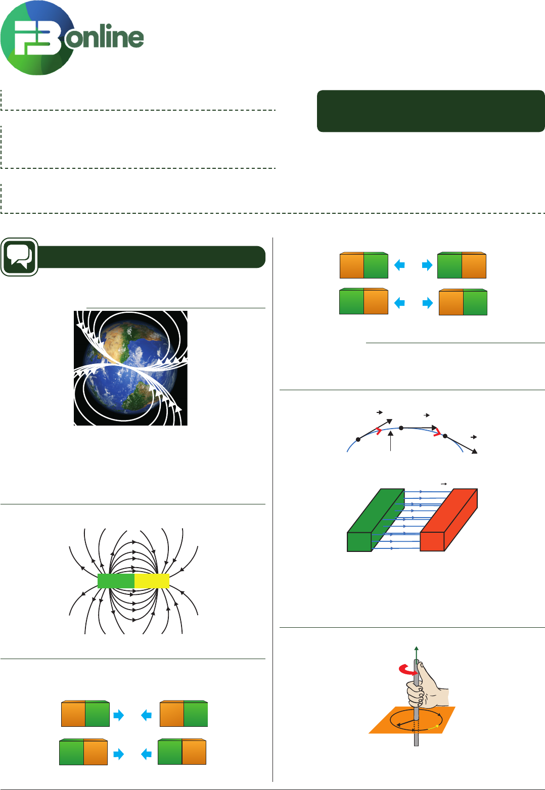 CIÊNCIAS DA NATUREZA E SUAS TECNOLOGIAS F B O N L I N E . C O M . B R ////////////////// Professor(a): Andrew Aquino assunto: introdução Ao MAgnetisMo, Fontes de CAMpo MAgnétiCo e ForçA MAgnétiCA frente: FísiCA ii OSG.: 120991/17 AULAS 22, 23 e 24 EAD – MEDICINA Resumo Teórico Introdução D ar iu s Tu re k/ 12 3R F/ Ea sy pi x O eletromagnetismo é o nome da teoria unificada que explica a relação entre a eletricidade e o magnetismo. Esta teoria tem como base o conceito de campo eletromagnético. O campo magnético surge do movimento de cargas elétricas. Ímãs permanentes Possuem dois polos: um chamado norte e o outro chamado de sul. N S Princípio da atração e repulsão Polos de mesmo nome se repelem e polos de nomes contrários se atraem. N N S N S N S S NS NS NS N S se atraem se repelem N N S N S N S S NS NS NS N S se atraem se repelem Campo magnético É a região em torno de um ímã permanente ou de um fio condutor percorrido por uma corrente elétrica. Vetor indução magnética Observem as figuras abaixo: B B B Linha de indução magnética N S B Vetor indução magnética é o vetor que representa o campo magnético, sendo tangente às linhas de campo. Unidade de B: SI (MKS): tesla (T) Regra da mão direita Para fios condutores percorridos por correntes elétricas. r B 1. Segura-se o fio com a mão direita. 2. O polegar indica o sentido da corrente elétrica. 3. Os outros dedos o sentido do campo magnético. 2F B O N L I N E . C O M . B R ////////////////// Módulo de estudo OSG.: 120991/17 Campo magnético criado por um fio condutor reto Todo fio condutor percorrido por uma corrente elétrica cria em torno de si um campo magnético dado pela regra da mão direita. ii (a) B RR (b) A intensidade do campo magnético gerado ao redor do fio condutor retilíneo é dada pela seguinte equação: B i R = ⋅ ⋅ µ π 0 2 Em que: µ 0 : permeabilidade magnética do vácuo; µ 0 = 4π ⋅10–7T ⋅ m/A; i: intensidade da corrente elétrica; R: raio da circunferência. Campo magnético uniforme É o campo no qual o vetor indução magnética tem sempre o mesmo módulo, a mesma direção e o mesmo sentido. Campo magnético criado por uma espira circular Imagine uma espira circular de centro O e raio R, por onde passa uma corrente elétrica. Observe que em torno do condutor se estabelece um campo magnético, como observado na figura abaixo, dado pela regra da mão direita. B O R i A intensidade do vetor indução magnética no centro da espira é dado por: B i R = ⋅ ⋅ µ0 2 Em que: µ 0 : permeabilidade magnética do vácuo; µ 0 = 4π ⋅ 10–7T ⋅ m/A; i: intensidade da corrente elétrica; R: raio da espira. Bobina chata Bobina chata é o empilhamento de n espiras iguais, de tal forma que a espessura do enrolamento seja muito menor que o diâmetro de cada espira. Veja a figura a seguir. B R i n � � � A intensidade do vetor indução magnética no centro da bobina é dada por: B n i R = ⋅ ⋅ ⋅ µ0 2 Em que: µ 0 : permeabilidade magnética do vácuo; µ 0 = 4π ⋅10–7T ⋅ m/A; i: intensidade da corrente elétrica; R: raio da espira da bobina. Campo criado por um solenoide Chama-se solenoide a um condutor enrolado em um núcleo cilíndrico em forma de espiral. Se as espiras são bastante próximas, podemos considerar cada espira como um condutor circular. P L B i Eixo do solenoide i A intensidade do vetor indução magnética no interior do solenoide é dada por: B N L i= ⋅ ⋅µ0 3 F B O N L I N E . C O M . B R ////////////////// OSG.: 120991/17 Módulo de estudo Em que: µ 0 = 4π.10–7T · m/A; N L : número de espira por comprimento do solenoide; i: intensidade da corrente elétrica. Força magnética sobre cargas em um campo magnético uniforme No estudo da eletrostática, aprendemos que quando uma carga penetra em uma região onde existe um campo elétrico, fica sujeita a ação de uma força elétrica. Um campo magnético não age sobre cargas elétricas em repouso, e sim em cargas e lançadas com uma velocidade v em direção a uma área onde há um campo magnético B, podendo ou não aparecer uma força magnética F atuando sobre esta carga. A direção desta força pode ser determinada pela regra da mão direita representada a seguir. Regra da mão direita: F m Empurrão B V Em que: 1. O polegar: indica o sentido da velocidade; 2. Os quatro dedos juntos: indicam o sentido do campo magnético; 3. Força magnética: se a carga for positiva, a palma interna da mão indica o sentido da força, e se a carga for negativa, o sentido da força magnética é determinado pelas costas das mãos. A figura abaixo representa uma carga sendo arremessada em um campo magnético, de tal forma que a velocidade da carga forme um ângulo q com a direção do campo magnético. + θ F B P υ A intensidade da força magnética pode ser determinada por: F q v B senmg = ⋅ ⋅ ⋅ θ Em que: F mag → Força de origem magnética; q → carga elétrica lançada no campo; v → velocidade de lançamento da carga no campo; B → intensidade de campo magnético gerado por um ímã ou corrente elétrica; q → ângulo entre a direção do campo e o vetor velocidade. Carga lançada em movimento paralelo ao campo magnético Note que a intensidade da força magnética será nula quando q for nulo ou igual a 180º, pois cos 0º = cos 180º = 0, portanto quando o lançamento for paralelo ao campo não teremos a força magnética atuando sobre esta carga. Portanto, a força magnética será nula quando a carga for colocada em repouso ou for lançada paralelamente ao campo magnético. Veja a ilustração a seguir. B q > 0 θ = 0º θ = 180º V q > 0 V B Carga lançada em movimento perpendicular ao campo magnético Quando a carga é lançada perpendicularmente ao campo magnético, a força e a velocidade possuem direções perpendiculares entre si, sendo, portanto, a força magnética responsável por variar a direção do movimento da carga, sendo, portanto, uma resultante cen
