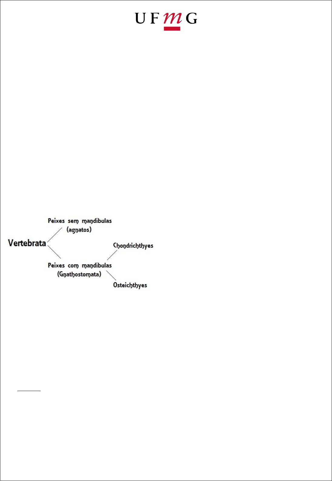 UNIVERSIDADE FEDERAL DE MINAS GERAIS – UFMG DEPARTAMENTO DE CIÊNCIAS BIOLÓGICAS – ZOOLOGIA DE VERTEBRADOS DISCENTE: ANTÔNIO CARLOS DA SILVA JUNIOR ATIVIDADE REFERENTE AS AUTO-AVALIAÇÕES DO FASÍCULO DA DISCIPLIMA 1 - Caracterizar os Agnatha, peixes cartilaginosos e peixes ósseos Os peixes ósseos e cartilaginosos diferenciam-se dos ágnatos por possuírem mandíbula, recebendo o nome de gnatostomados graças a essa característica. Esses dois grupos diferem-se entre si principalmente pela presença de esqueleto ósseo nos osteíctes e esqueleto cartilaginoso nos condrictes. Como exemplo de peixes cartilaginosos, podemos citar os tubarões e raias; como representantes dos osteíctes, podemos citar o salmão e o peixe-palhaço. Os peixes podem ser divididos em: agnatos, condrictes e osteíctes. A grande maioria dos peixes possui corpo recoberto por escamas, sendo que elas diferenciam-se em cada grupo. Nos peixes ósseos, as escamas possuem origem dérmica, enquanto, nos cartilaginosos, possuem origem dermo epidérmica. Já os agnatos são animais sem escamas. Além das escamas, encontramos nos peixes uma grande quantidade de muco ao redor do corpo, que atua reduzindo o atrito com a água. 2- Caracterizar os anfíbios e repteis Os anfíbios são animais vertebrados ectotérmicos (não são capazes de regular a temperatura corporal por mecanismos internos, sendo fundamental para isso fontes externas), e uma de suas características mais marcantes é a presença de um ciclo de vida com uma fase larval aquática e uma fase adulta terrestre. Anfíbios são vertebrados cuja característica fundamental é o desenvolvimento na fase larvária em meio aquático e na fase adulta em meio terrestre. As principais características deste grupo são: · A maioria dos anfíbios possui 4 membros pentadáctilos para locomoção em terra (os gimnofionos como a Caecilia, são ápodos, por involução das patas, como uma adaptação aos seus hábitos de vida em buracos no solo); · Pele úmida e lisa, glandulífera e sem escamas externas, apta para a respiração cutânea (que nos anfíbios torna-se mais importante que a respiração pulmonar); · Dentes pequenos e esqueleto em grande parte ossificado; · São pecilotérmicos (animais de sangue frio); · Coração com 3 cavidades: duas aurículas ou átrios e um ventrículo. O sangue arterial, que entra na aurícula esquerda, e o sangue venoso, que chega a aurícula direita, vão se juntar ao nível do ventrículo único. Por isso a circulação destes animais é dita fechada, dupla, porém incompleta; · Presença de entalhe ótico, resultado do desaparecimento do opérculo que nos peixes protege as brânquias. Os anfíbios são verdadeiros sensores ambientais, denunciam a degradação de uma área antes de qualquer outra espécie e, se estudados, global e sincronicamente, eles têm a capacidade de comunicar o que está acontecendo com nosso planeta. Os répteis são animais que possuem como características principais o corpo com poucas glândulas, impermeável e coberto por escamas e/ou placas ósseas; a presença de pulmões bastante eficientes; e ovos com casca e anexos. Tais características permitiram com que pudessem viver em ambiente terrestre sem muitos problemas. Esses animais caracterizam-se por serem tetrápodes e de pele grossa, apresentam pulmões e botam ovos com casca resistente.Esses animais, assim como os anfíbios, não possuem a capacidade de manter a temperatura do corpo constante. Isso ocorre porque eles não conseguem controlar sua temperatura através do calor gerado no metabolismo. Para conseguirem uma temperatura ideal, os répteis utilizam certas estratégias, como a exposição ao sol quando o dia está frio. Além disso, quando a temperatura se torna muito alta, eles protegem-se em rios, lagos, locais sombreados, entre outros. Falamos que animais com essa característica são ectotérmicos.Como dito anteriormente, uma característica interessante dos répteis é sua pele grossa, que, diferente dos anfíbios, é muito especializada para a vida no ambiente terrestre. Esses animais não possuem glândulas e sua pele pode ser recoberta por placas, escamas, plastrões e carapaças. Essa característica permite que os répteis tenham grande vantagem em ambientes secos, tais como os desertos. 3- Caracterizar aves e mamíferos As aves são animais vertebrados que podem ser facilmente distinguidos pela presença de penas. A pena é uma característica exclusiva desses animais, ou seja, está presente em todas as espécies do grupo. Além disso, as aves não possuem dentes, são endotérmicas e apresentam um metabolismo elevado. Aves são animais de sangue quente, também chamados homeotérmicos ou endotérmicos, por sua capacidade de manter a temperatura corporal constante. Para isso, elas apresentam um metabolismo elevado, necessitando de muita energia. As penas são uma característica exclusiva das aves. Elas permitem o voo, são isolantes térmicos (importante para a homeotermia) e funcionam para a camuflagem e como atrativo sexual. O voo é uma importante adaptação das aves, que lhes permite: Habitar diversos ambientes; Fugir dos predadores; Buscar novas fontes de alimentos; Aumentar o campo visual; Realizar migrações quando as condições ambientais se tornam desfavoráveis, como no período de inverno. Outra característica das aves é o canto, gerado por um órgão fonador, que é a siringe. O canto pode servir como elemento de comunicação, envolvendo atração sexual, advertência, demarcação de território, dentre outros. Os mamíferos são animais classificados na classe Mammalia. Nela existem animais pesando de 3g a 160 toneladas e medindo de 8 cm até 30 m de comprimento. Podemos encontrar mamíferos em vários ambientes, como na água doce, na água salgada, no ar e na terra firme. Alguns mamíferos (o rato, por exemplo) transmitem microrganismos patogênicos prejudiciais ao homem, mas há mamíferos muito im