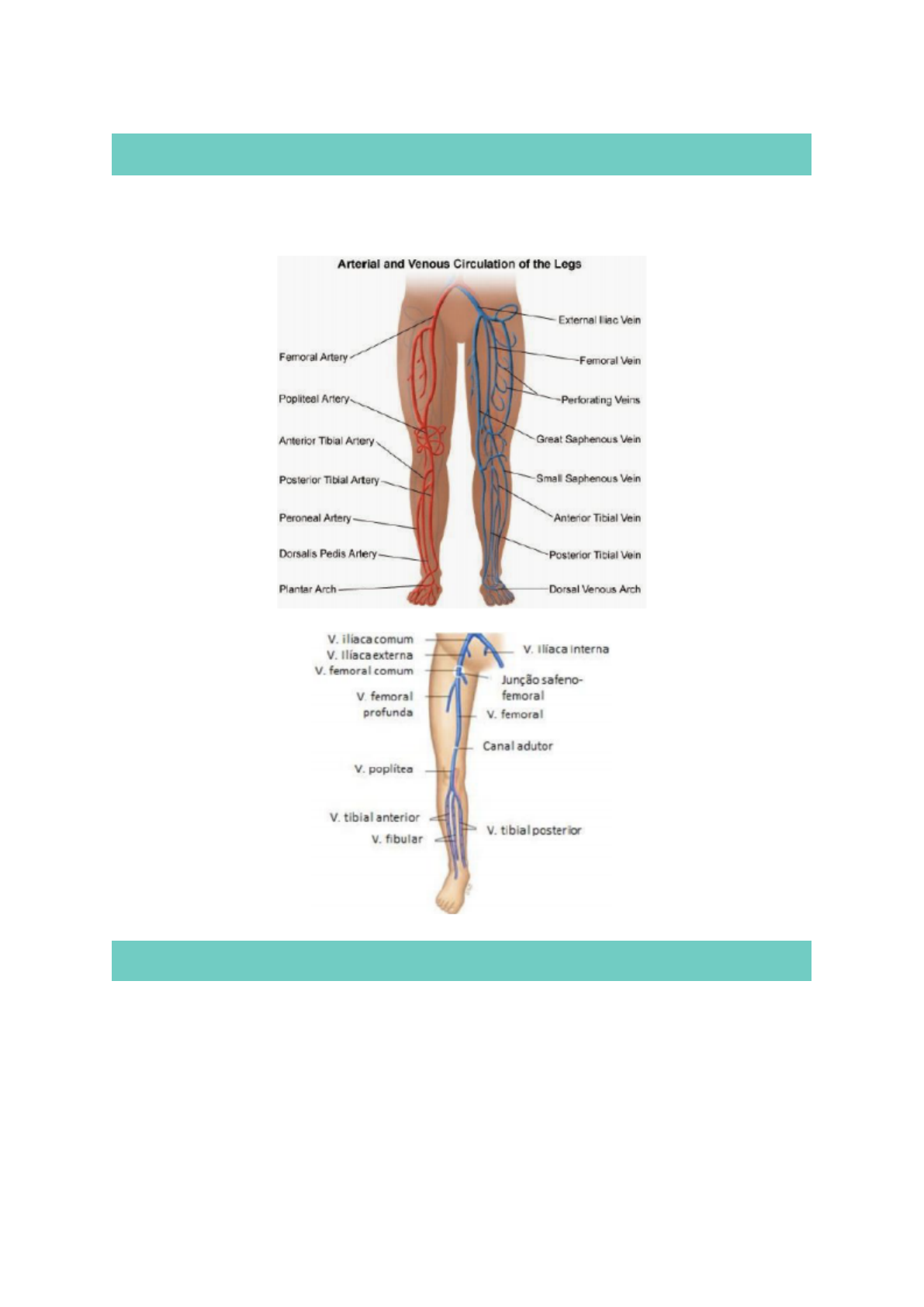 PROPEDÊUTICA VENOSA Propedêutica vascular significa os ensinamentos básicos sobre as doenças vasculares diretamente aplicadas ao doente. ANATOMIA VASOS PROFUNDOS: No segmento infragenicular (abaixo dos joelhos) há duas veias para cada artéria. São 2 veias fibulares, 2 veias tibiais anteriores e 2 veias tibiais posteriores, essas veias se confluem no seu trajeto com as veias gastrocnêmias. A veia poplítea ao passar pelo canal dos adutores ou canal de Hunter que fica no terço distal da coxa passa a se chamar femoral (femoral superficial antigamente). A veia femoral (drena a perna) vai se confluir a nível da região inguinal com a veia femoral profunda (drena a coxa) e formarão a veia femoral comum, que está localizada medialmente à artéria femoral e é possível palpar o pulso femoral aí. “É possível fazer punção na veia femoral palpando o pulso femoral e então puncionando um pouco medialmente a ele.” A veia femoral comum passando o ligamento inguinal passa a se chamar veia ilíaca externa, que mergulha na pelve e se conflui com a veia ilíaca interna ou veia hipogástrica (que drena o segmento pélvico) e então juntas formam a veia ilíaca comum. A veia ilíaca comum drena tanto o segmento pélvico como toda a sua extremidade superior: - Veia ilíaca comum fica aproximadamente a nível de L5 (a nível do promontório sacral) vai se confluir com sua homônima contralateral formando assim a veia cava inferior. - As patologias venosas (TVP, varizes, refluxo) vão acontecer praticamente todas nessas veias do sistema venoso profundo. VASOS SUPERFICIAIS: É formado pela veia safena parva e veia safena magna e suas respectivas acessórias. O sistema das safenas drena em torno de 10-15% do sangue, disfunções no sistema superficial também podem repercutir em insuficiência venosa crônica Interligando a veia safena parva e a veia safena magna há a veia de Giacomini e essa veia de Giacomini é denominada como inserção cranial da safena parva. ANAMNESE Dor da Insuficiência Arterial • Fator de piora – o estado do paciente piora quando as pernas ficam elevadas. • Característica da dor • Claudicação Intermitente – paciente refere dor quando anda e melhora quando está em repouso. O músculo fica sem o suprimento necessário de oxigênio quando o paciente anda. Os principais sintomas são: dor na panturrilha em queimação. Dor em repouso • Posição do membro – o paciente sente melhora ao deixar os membros “pendurados”. Dor da Insuficiência Venosa • Característica da dor - Sintomas: sensação de dor em peso, cansaço e queimação. - Paciente irá referir que acorda bem e a dor piora ao longo do dia. • Fatores de alívio – paciente refere melhora ao elevar os membros (auxílio no retorno venoso ao coração). Doença Linfática • Característica da dor - Edema INSPEÇÃO Inspeção significa examinar ou observar com atenção aos detalhes. - No caso da inspeção vascular é importante notar a palidez do paciente. Cianose: é um sinal ou um sintoma que pode ser notado através da coloração azul-arroxeada da pele, embaixo das unhas ou nas mucosas. A cianose ocorre devido a má oxigenação do sangue arterial. • Não-fixa: ao apertar será possível observar a pele branca e ao soltar voltará a ficar roxa. Isso significa que ainda possui perfusão. • Fixa: não fica branca quando a pele é pressionada. Isso significa que já há trombose na microcirculação. Dermatite Ocre: Deposição de hemossiderina. A dermatite ocre ocorre devido à hipertensão venosa causada pela Insuficiência Venosa. Devido ao mau funcionamento das veias o sangue fica represado na parte inferior da perna aumentando a pressão local. Isso pode levar a um extravasamento de sangue e acúmulo de um pigmento chamado hemossiderina na pele. Este pigmento contém ferro, e isso leva a uma coloração amarronzada, enegrecida, que aparece principalmente na parte distal da perna, a chamada dermatite ocre ou dermatite de estase. Redução de fâneros • Porta de entrada: onicomicoses Hiperemia Reativa: Ao levantar a perna do paciente será observado palidez e ao abaixar o pé ficará muito vermelho (hiperemia). Quando a perna é levantada é induzida uma isquemia que irá, consequentemente, gerar uma vasodilatação acentuada na tentativa de compensar essa falta de suprimento sanguíneo. Em casos de infecção associada o pé não ficará vermelho quando for abaixado. Presença de secreção/odor e necrose: PALPAÇÃO Palpação de pulsos • Axilar • Braquial • Radial • Ulnar • Poplíteo • Pedioso • Tibial • Carotídeo Alteração de temperatura Massa Pulsátil o Consistência muscular e edema Linfonodomegalias e dor a palpação dos linfonodos Edema • Duro ou mole • Início • Uni ou bilateral Sinal de Godet • Tempo de pressão • Locais de pesquisa Edema – Linfedema • Não poupa os pés • Sinal de Stemmer - Espessamento cutâneo na base dos podos, não sendo possível seu pregueamento. EXAMES CLÍNICOS EXAMES CLÍNICOS ARTERIAL: • Evolução da doença • Claudicação intermitente • Neuropatia isquêmica • Dor em repouso EXAMES CLÍNICOS VENOSO: Tromboflebite: A flebite, ou tromboflebite, consiste na formação de um coágulo sanguíneo no interior de uma veia, que impede o fluxo de sangue, o que provoca inchaço, vermelhidão e dor no local afetado. Esta situação é considerada uma urgência médica pois pode trazer complicações como trombose venosa profunda ou embolia pulmonar, por exemplo. Trombose Venosa Profunda (TVP) • Sinal de Homans: Sinal indicativo de tromboflebite da perna. Consiste na dorsiflexão do pé sobre a perna e o doente vai referir dor na massa muscular na panturrilha. • Sinal da Bandeira: Quando um membro inferior é comparado com outro durante a palpação, nota-se menor mobilidade da panturrilha que fica empastada. • Sinal de Bancroft: Quando palpada a musculatura da panturrilha contra a estrutura 