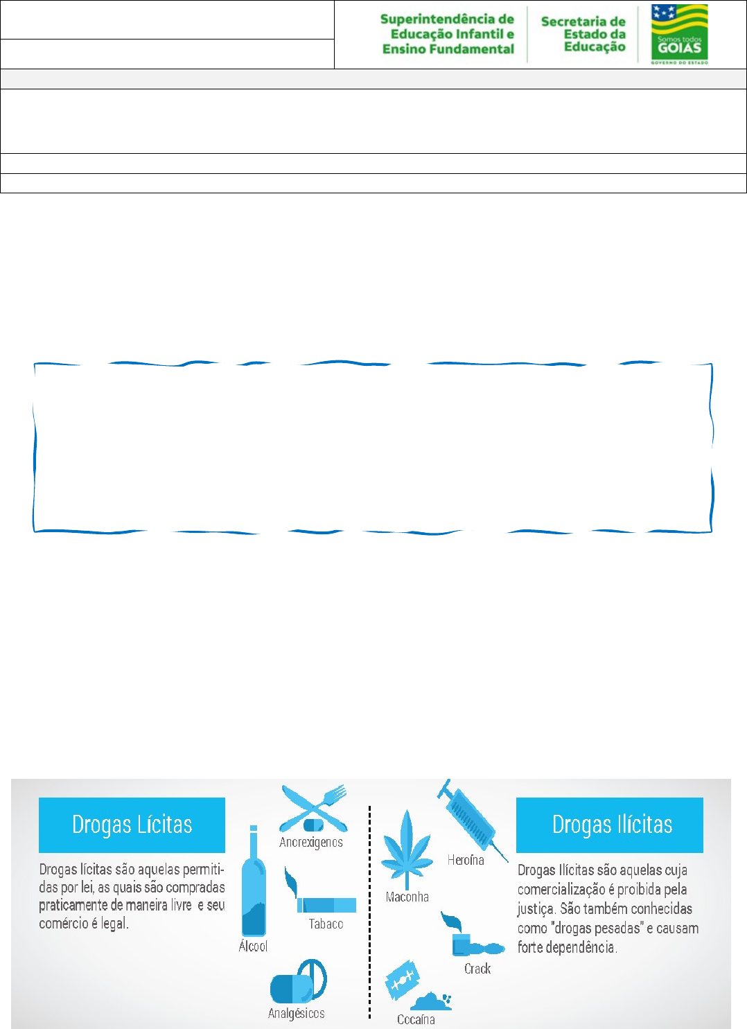 6º ANO CIÊNCIAS DA NATUREZA 4ª QUINZENA – 3º CICLO Habilidades Essenciais: (EF06CI10) Explicar como o funcionamento do sistema nervoso pode ser afetado por substâncias psicoativas. (EF06CI10-A) Identificar critérios históricos, econômicos e sociais determinantes na classificação das drogas, compreendendo e distinguindo a classificação em lícitas e ilícitas, relacionando seus efeitos à alteração da saúde nas dimensões física, psicológica, emocional e social. NOME: UNIDADE ESCOLAR: Tema/ objeto de conhecimento: Substâncias psicoativas. Drogas e Sistema Nervoso Denominam-se drogas quaisquer substâncias utilizadas que causam alterações na estrutura e funções do organismo. Podem ser classificadas quanto à origem, efeitos, entre outros. As drogas são utilizadas pelo homem há séculos. Inicialmente, eram retiradas da natureza – as folhas secas eram o principal recurso no tratamento de doenças. Atualmente, muitas dessas drogas são sintetizadas em laboratórios, e muitas são usadas de forma recreativa. A palavra droga provavelmente tem origem francesa (drogue) ou holandesa (droog) e, originalmente, referia-se às folhas secas utilizadas nos tratamentos de doenças. Atualmente, essa denominação está relacionada não apenas às substâncias utilizadas no tratamento de doenças, tampouco às substâncias de origem natural (extraídas da natureza) apenas, referindo-se também às substâncias de uso recreativo e de origem sintética (produzidas em laboratório e com ausência de substâncias naturais em sua composição) e semissintética (produzidas em laboratório com a presença de substâncias naturais em sua composição). O homem sempre teve uma relação com a natureza de forma íntima. A utilização das plantas em seu dia a dia foi essencial para o conhecimento de suas diversas propriedades, como a existência de substâncias psicoativas. O homem faz uso dessas substâncias desde a antiguidade, como para suportar algumas adversidades no ambiente em que viviam, como o cansaço. Em seguida, essas substâncias passaram a ser utilizadas em rituais religiosos, como forma de cura, ou recreativamente. Tipos de drogas As drogas podem ser classificadas, de acordo com o ponto de vista legal, por meio dos efeitos produzidos no sistema nervoso central, dos efeitos de acordo com a indicação terapêutica, entre outras formas. De acordo com o ponto de vista legal (essa classificação pode variar entre países, pois possuem legislações diferentes). De acordo com a legislação brasileira: De acordo com os efeitos produzidos no sistema nervoso central (essa classificação é bastante utilizada pelos profissionais de saúde):Figura: Drogas lícitas e ilícitas. Disponível em: <http://conselheiros6.nute.ufsc.br/ebook/modulo-1.html>. Acesso em 09 set. 2020. Figura: Classificação das drogas. Disponível em: <http://conselheiros6.nute.ufsc.br/ebook/modulo-1.html>. Acesso em 09 set. 2020. Drogas Ilícitas Os entorpecentes ilícitos ou drogas ilícitas, como dito anteriormente, são drogas cuja venda e consumo são proibidos. No Brasil, são exemplos de drogas ilícitas a maconha, cocaína, entre outras. O debate sobre a legalidade e ilegalidade das drogas vai além dos benefícios ou malefícios que causam no organismo, tendo também os fatores cultural e econômico um peso significativo nas tomadas de decisões. No Brasil, por exemplo, o álcool e o tabaco são substâncias que têm sua venda e consumo liberados, ou seja, são drogas lícitas. É importante destacar que a venda dessas substâncias a menores de 18 anos é proibida por lei. No entanto, o álcool e o tabaco são responsáveis pelo desenvolvimento de diversas enfermidades. O álcool, devido às alterações que causam no estado de consciência, está relacionado também a outros problemas, como violência e acidentes de trânsito. Efeitos das Drogas no Cérebro Os efeitos que as drogas causam no organismo variam entre os indivíduos. No entanto, sabe-se que o seu efeito no cérebro está relacionado principalmente com a sua ação sobre os neurotransmissores, atuando no estímulo dos neurônios. Muitas drogas atuam desencadeando uma sensação de prazer ou causando alucinações. Porém, o consumo de drogas ao longo do tempo pode desencadear alterações no sistema nervoso de forma que, para que se sintam os mesmos efeitos ao consumir determinada droga, a dosagem deve ser aumentada. A partir desse ponto, pode ser caracterizada a dependência química, pois da mesma maneira que o indivíduo passa a utilizar uma dosagem maior para obter um determinado efeito, a diminuição ou ausência do consumo também gera efeitos específicos de mal-estar, levando a uma compulsão pelo consumo com maior frequência da droga. Disponível em: <https://blog.cenatcursos.com.br/saude-mental-alcool-e-drogas/>. Acesso em 09 set. 2020. Consequências do Uso de Drogas na Família O consumo de drogas pode causar efeitos diversos nos indivíduos. Um desses efeitos é a dependência química, que vem se tornando um problema grave de saúde pública no país. A dependência química afeta a vida do dependente de diversas formas, seja em suas relações afetivas, seja como profissionais, o que acaba por desestruturar muitas famílias. Disponível em: <https://mundoeducacao.uol.com.br/drogas> Acesso em 09 set. 2020. Resolva em seu caderno as atividades a seguir. 1. Dentre os prejuízos sociais associados ao consumo de álcool estão os acidentes de trânsito, sendo um problema de preocupação mundial e que acarretam um número excessivo de mortes e prejuízos por ano. A proibição do consumo de álcool para quem pretende dirigir é devido ao fato de que o consumo de bebida alcóolica 1 4 a) ( ) acelera o funcionamento do corpo. b) ( ) deixa os reflexos mais lentos. c) ( ) melhora a coordenação motora. d) ( ) provoca estado de euforia. 2. O homem faz uso de substâncias psicoativas desde a antiguidade, para suportar algumas adv