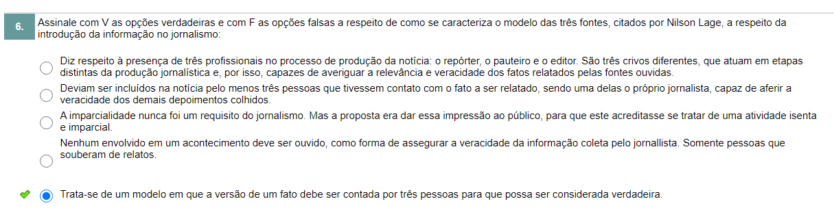 Diz respeito à presença de três profissionais no processo de produção da notícia: o repórter, o pauteiro e o editor. São três crivos diferentes, que atuam em etapas distintas da produção jornalística e, por isso, capazes de averiguar a relevância e veracidade dos fatos relatados pelas fontes ouvidas. Assinale com V as opções verdadeiras e com F as opções falsas a respeito de como se caracteriza o modelo das três fontes, citados por Nilson Lage, a respeito da introdução da informação no jornalismo. ( ) Deviam ser incluídos na notícia pelo menos três pessoas que tivessem contato com o fato a ser relatado, sendo uma delas o próprio jornalista, capaz de aferir a veracidade dos demais depoimentos colhidos. ( ) A imparcialidade nunca foi um requisito do jornalismo. Mas a proposta era dar essa impressão ao público, para que este acreditasse se tratar de uma atividade isenta e imparcial. ( ) Nenhum envolvido em um acontecimento deve ser ouvido, como forma de assegurar a veracidade da informação coleta pelo jornalista. Somente pessoas que souberam de relatos. ( ) Trata-se de um modelo em que a versão de um fato deve ser contada por três pessoas para que possa ser considerada verdadeira.